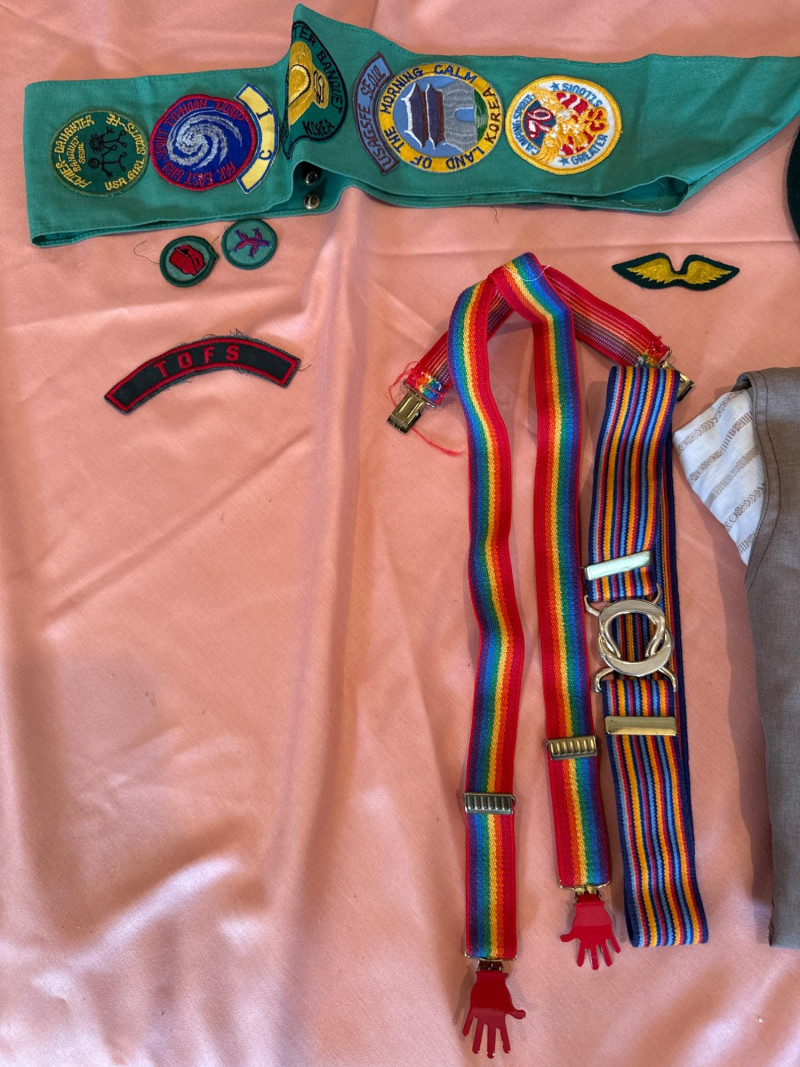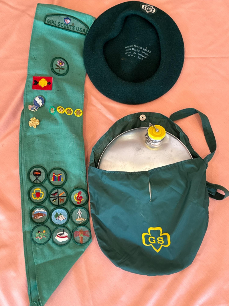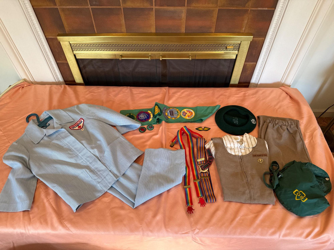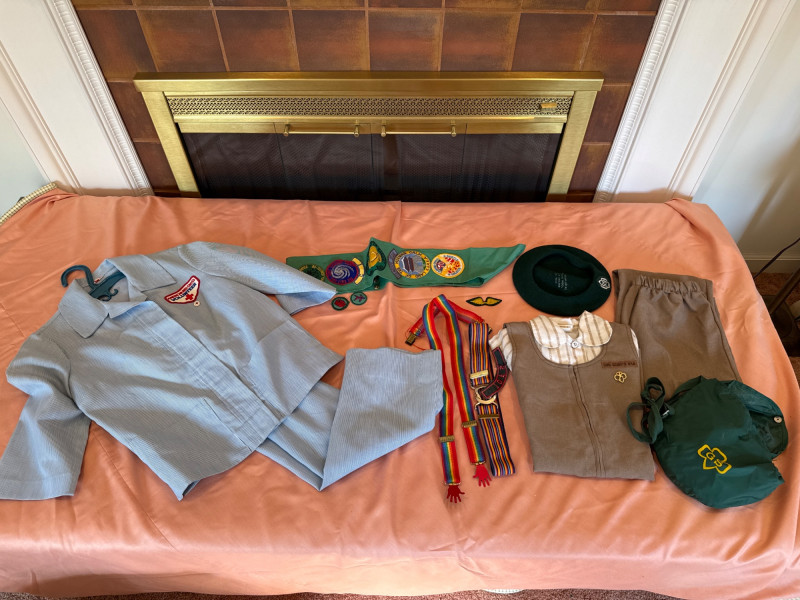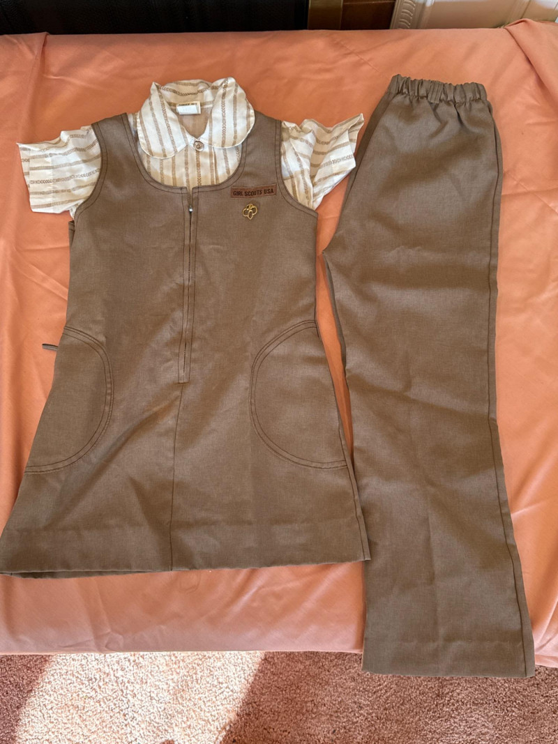 A nostalgic and well-preserved collection of vintage Girl Scout and Red Cross uniforms and accessories, showcasing decades of youth service and achievement. This lot includes a variety of garments, patches, and memorabilia—ideal for collectors, educators, or resale pros seeking authentic scouting history. Red Cross Uniform – Size Small, light blue shirt and pants set with sleeve patch Vintage Brownie Uniform – Size 8 jumper with white striped blouse Brown Pants – Coordinating piece Green Wool Beret – Yellow trefoil emblem Green Sash – Sewn-on merit badges Multicolor Striped Belt or Sash – With tassels Green Drawstring Bag – Yellow trefoil emblem Loose Badges & Pins – Assorted designs Set Includes