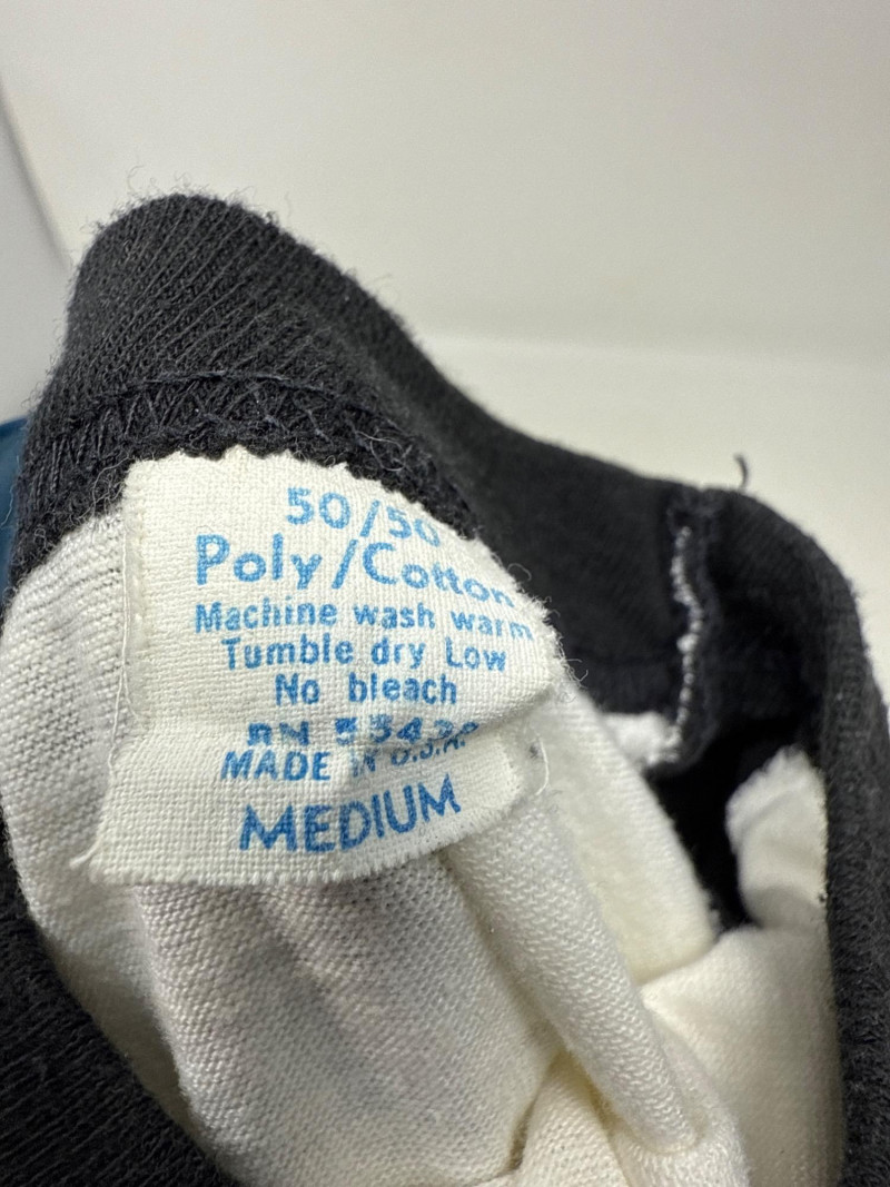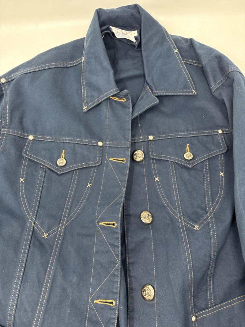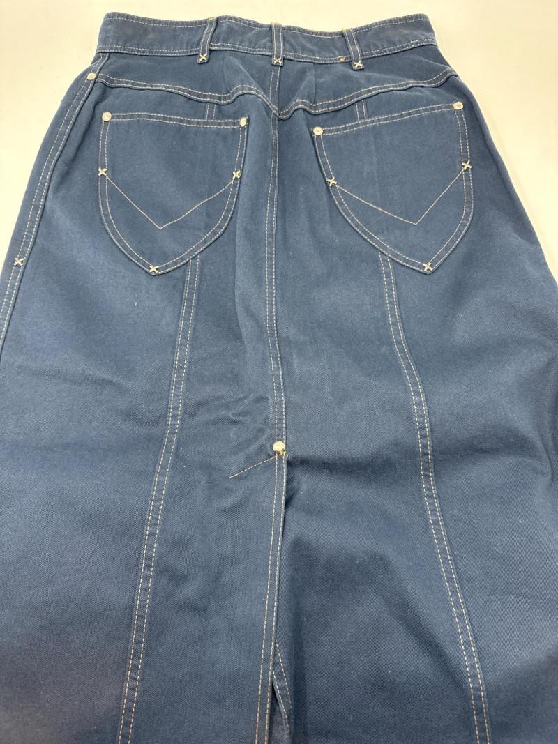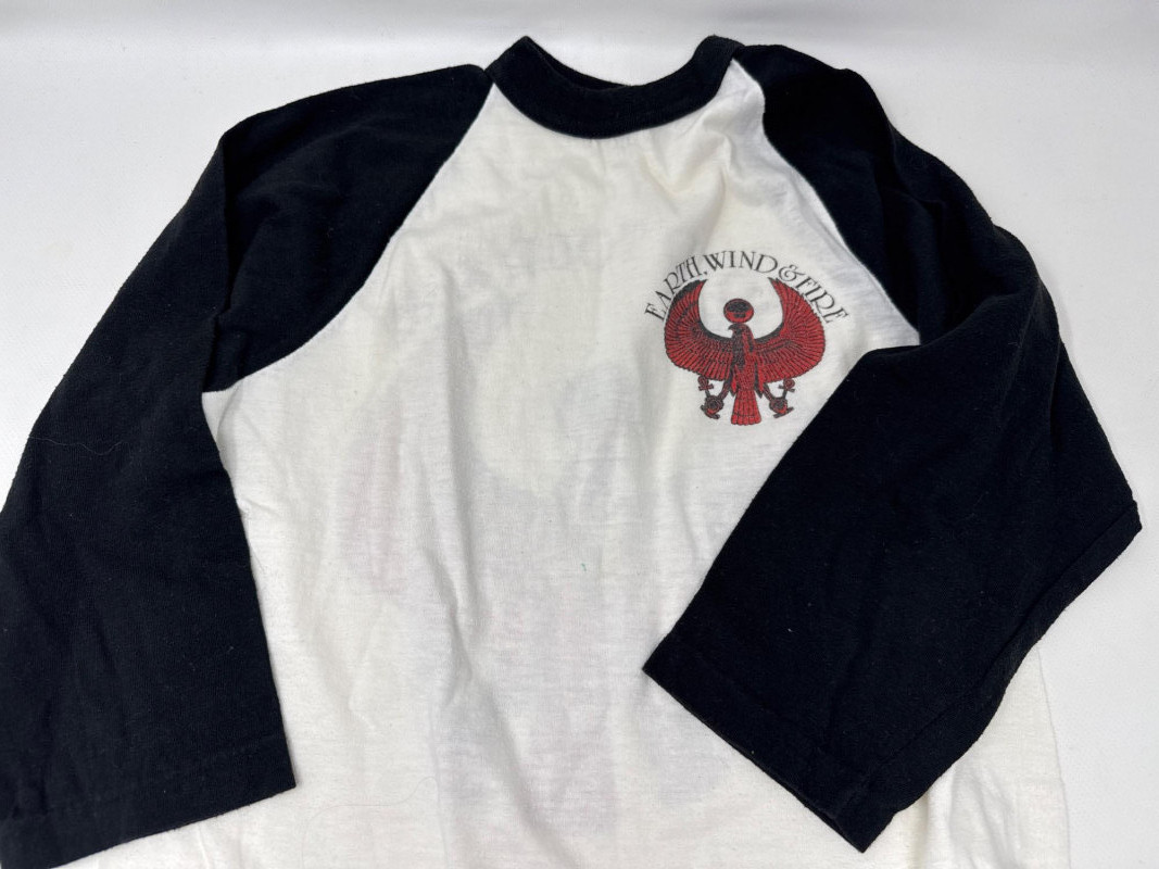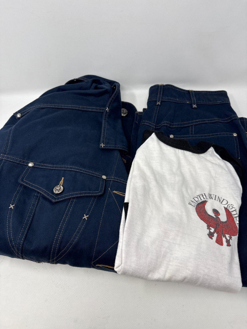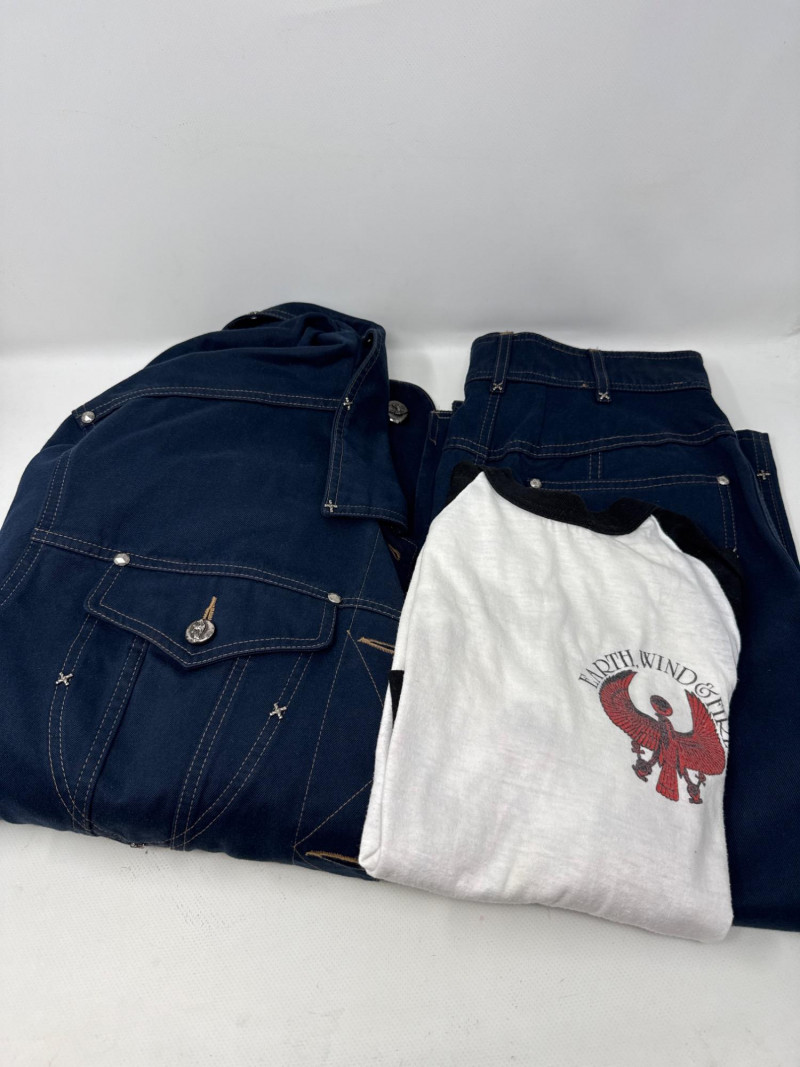 A bold and casual ensemble featuring rugged denim and retro graphic flair. This lot includes two pairs of dark-wash denim—one jacket and one skirt —both with flap pockets, white contrast stitching, and metal button details. Paired with a white ringer-style t-shirt featuring a red eagle and “Earth Wind Fire” graphic tee, this set channels concert-ready cool and Americana grit. Denim Pieces: Size 8 Dark wash with flap pockets, white stitching, metal hardware Includes jacket and coordinating bottom (skirt ) Graphic Tee: Size Medium White with black trim Red eagle and “Earth Wind Fire” band logo Light wear consistent with age Sold as a complete set Display-ready for collectors or stylists Item Details