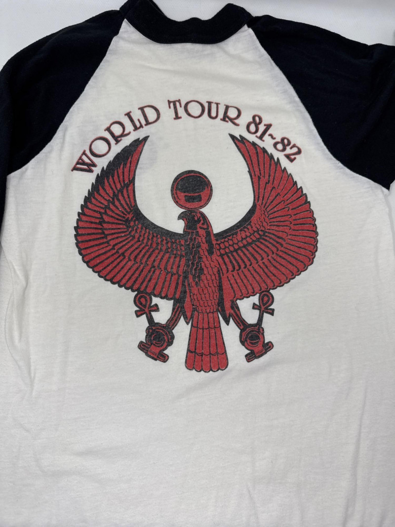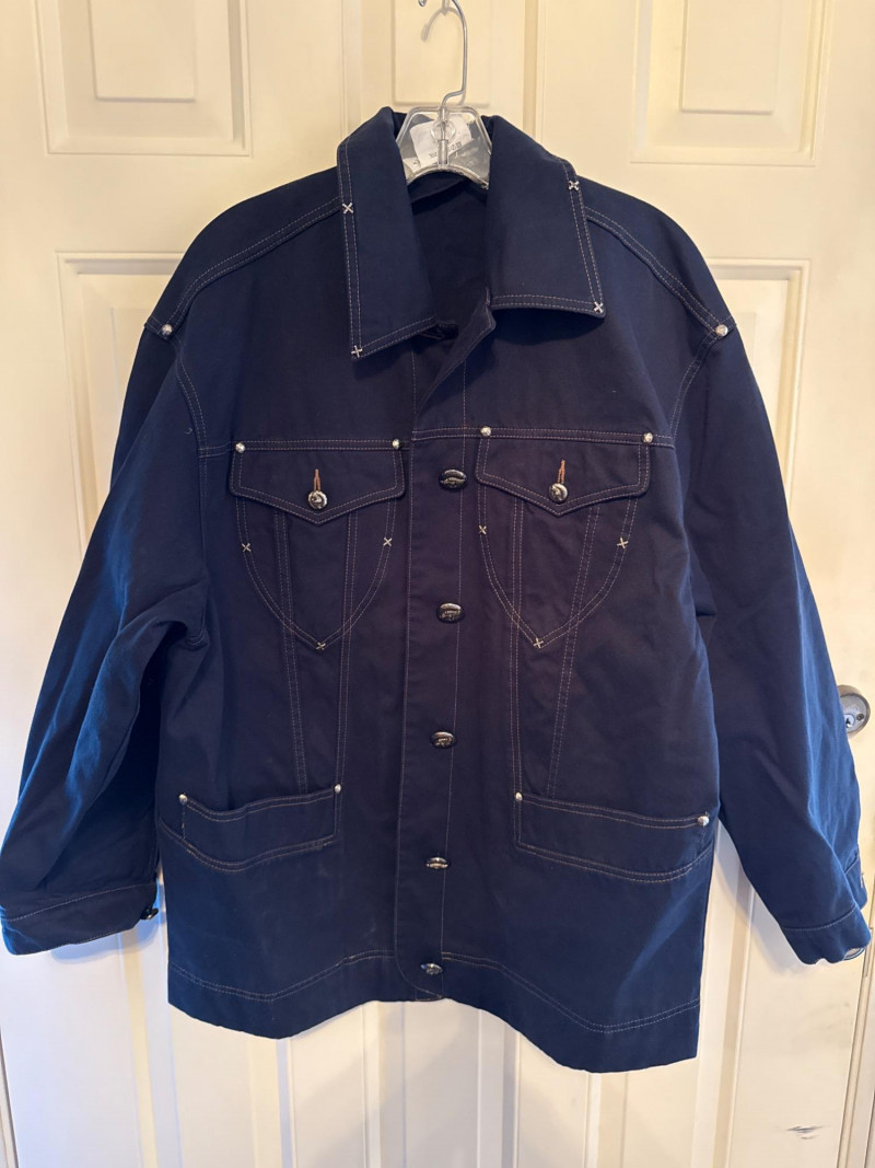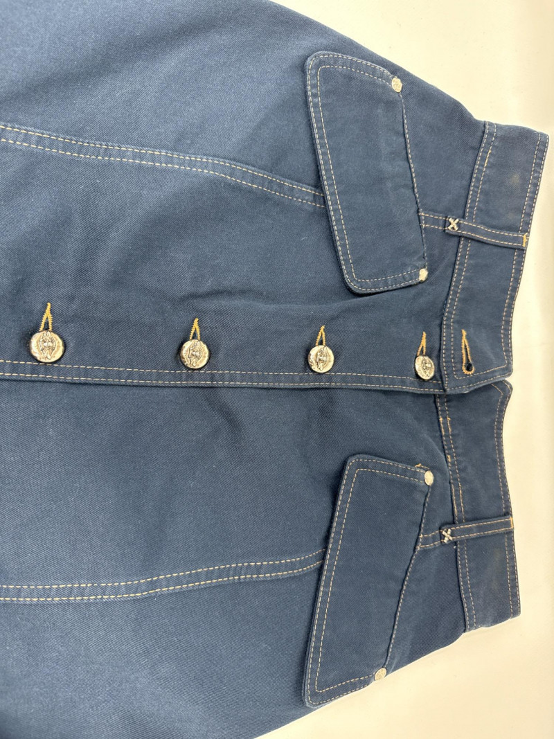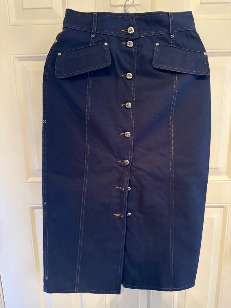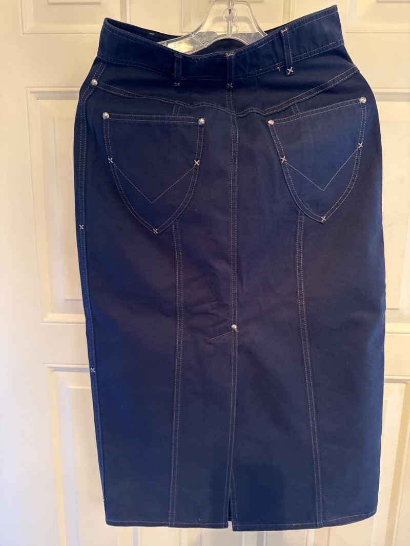 A bold and casual ensemble featuring rugged denim and retro graphic flair. This lot includes two pairs of dark-wash denim—one jacket and one skirt —both with flap pockets, white contrast stitching, and metal button details. Paired with a white ringer-style t-shirt featuring a red eagle and “Earth Wind Fire” graphic tee, this set channels concert-ready cool and Americana grit. Denim Pieces: Size 8 Dark wash with flap pockets, white stitching, metal hardware Includes jacket and coordinating bottom (skirt ) Graphic Tee: Size Medium White with black trim Red eagle and “Earth Wind Fire” band logo Light wear consistent with age Sold as a complete set Display-ready for collectors or stylists Item Details