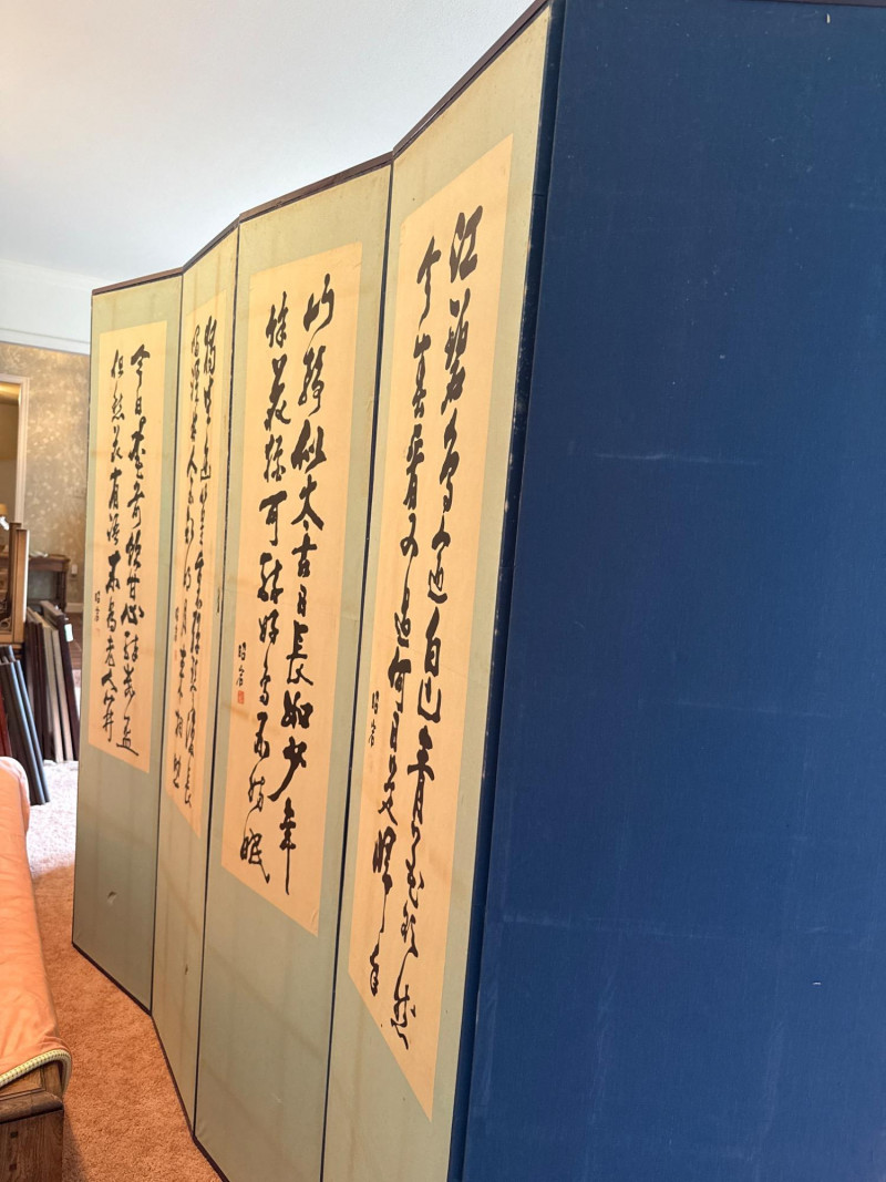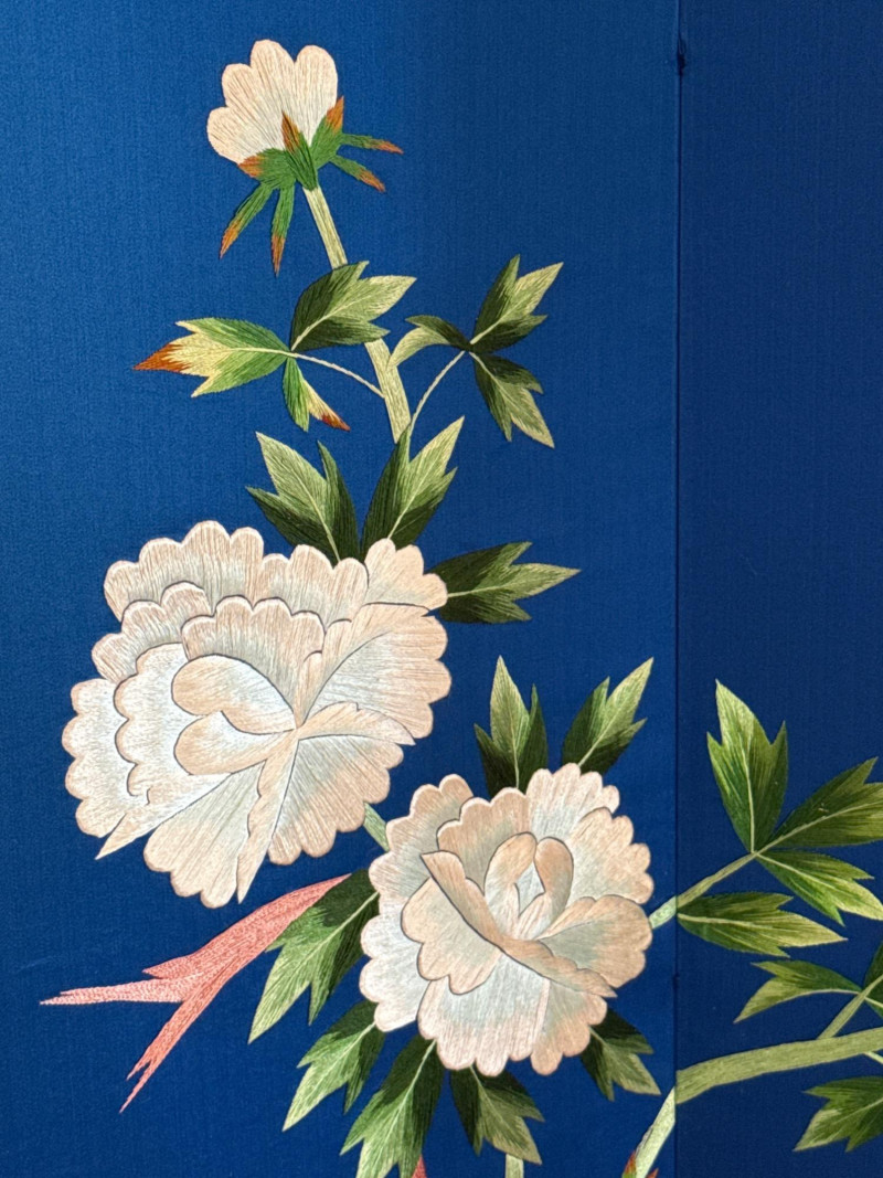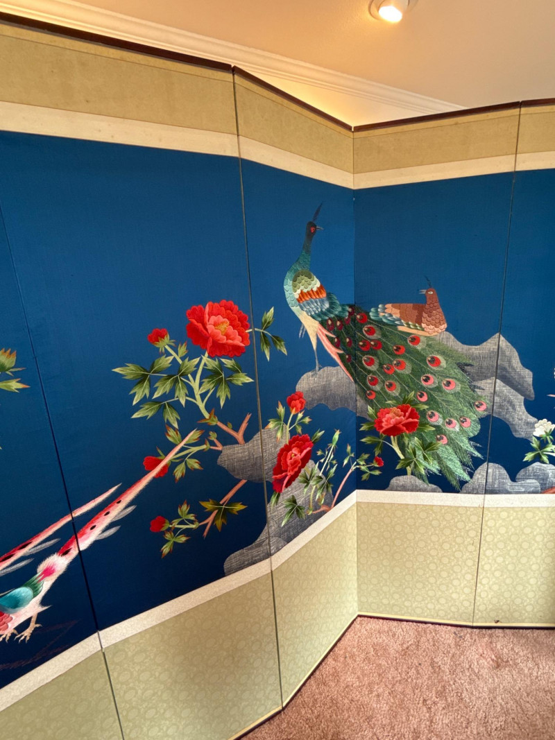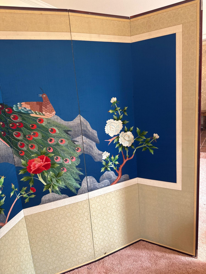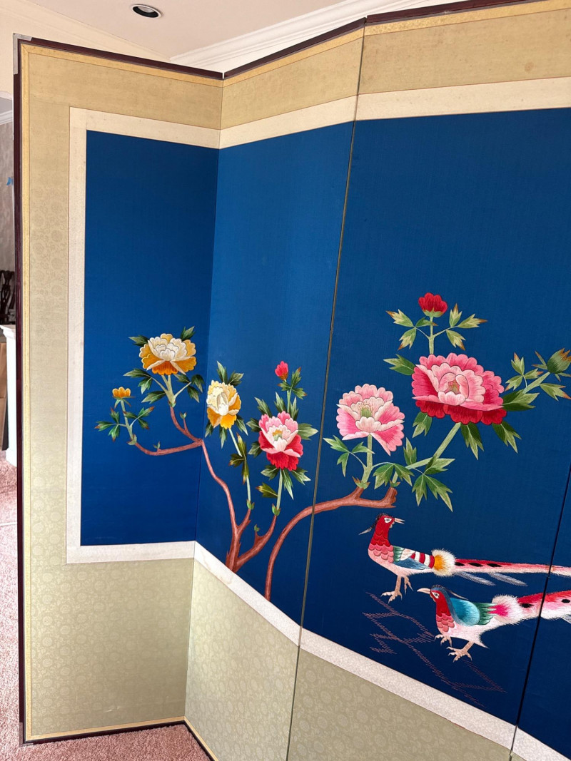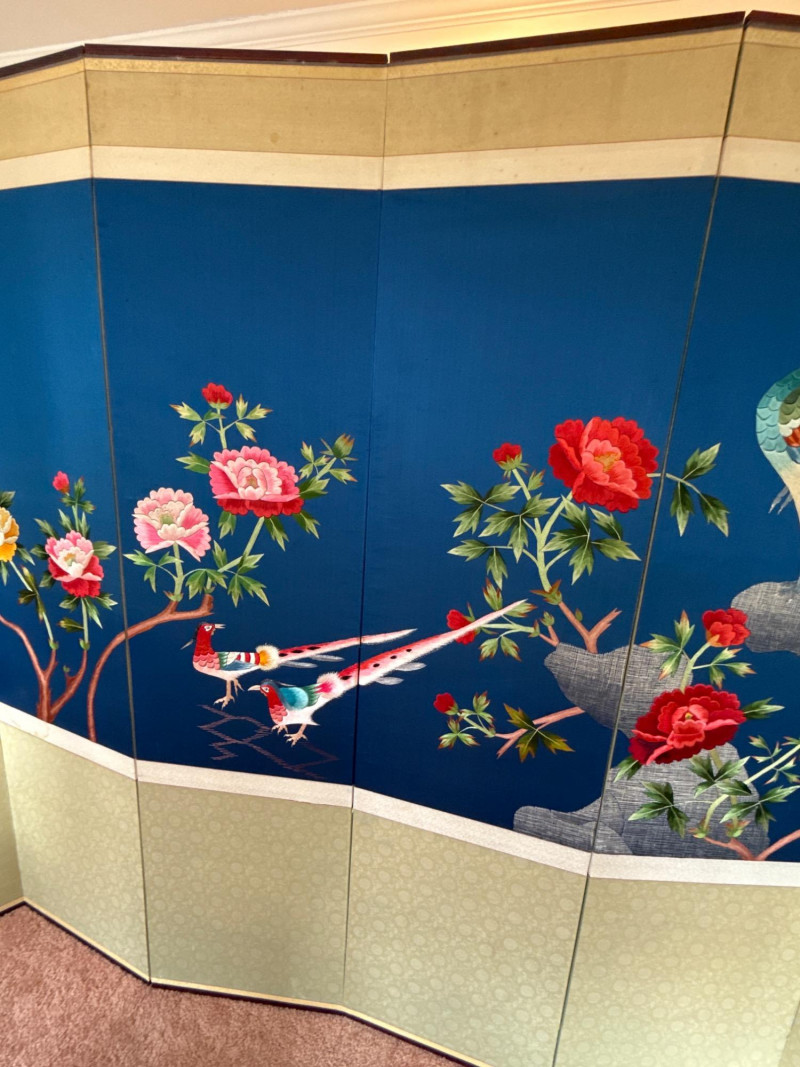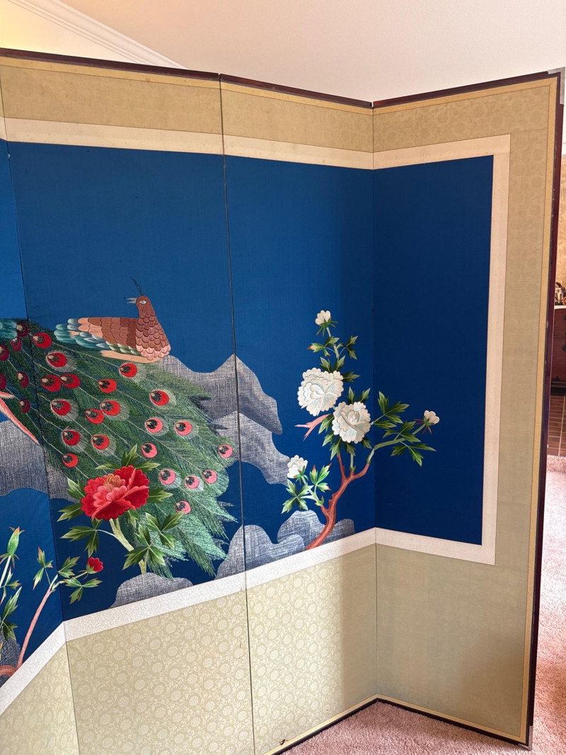 Likely mid-20th century Asian decorative art, possibly Chinese or Japanese origin. The presence of an artist’s seal suggests studio production. Ideal for collectors of textile art, Asian interiors, or statement decorative pieces.Stunning Eight-Panel Silk Embroidered Peacock & Floral Asian Screen
