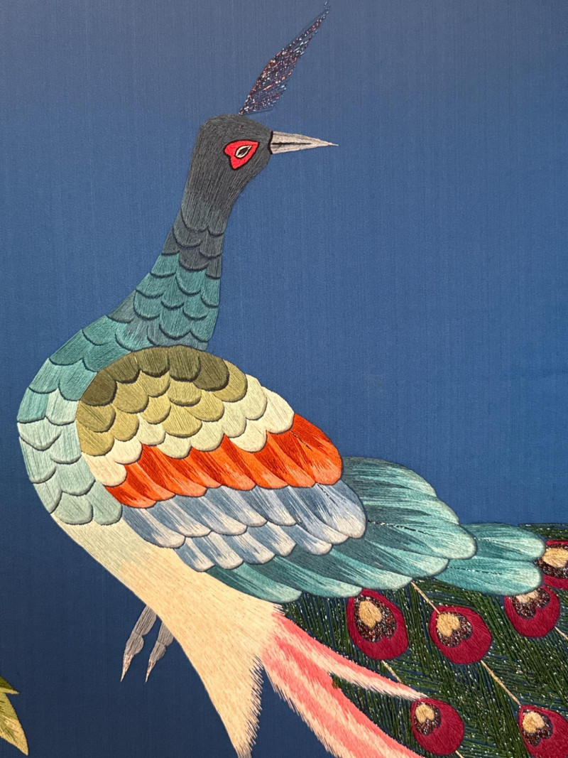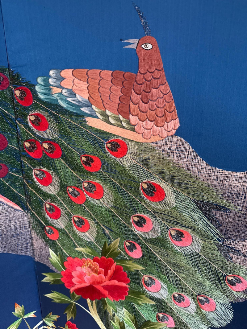 A richly detailed eight-panel folding screen showcasing masterful silk embroidery on a deep blue ground. The central motif features a regal peacock with cascading plumage, surrounded by birds in flight and blooming peonies—all rendered in vibrant multicolored silk threads. Each panel is bordered with patterned brocade, enhancing the visual depth and traditional elegance. Medium: Silk embroidery on fabric panels