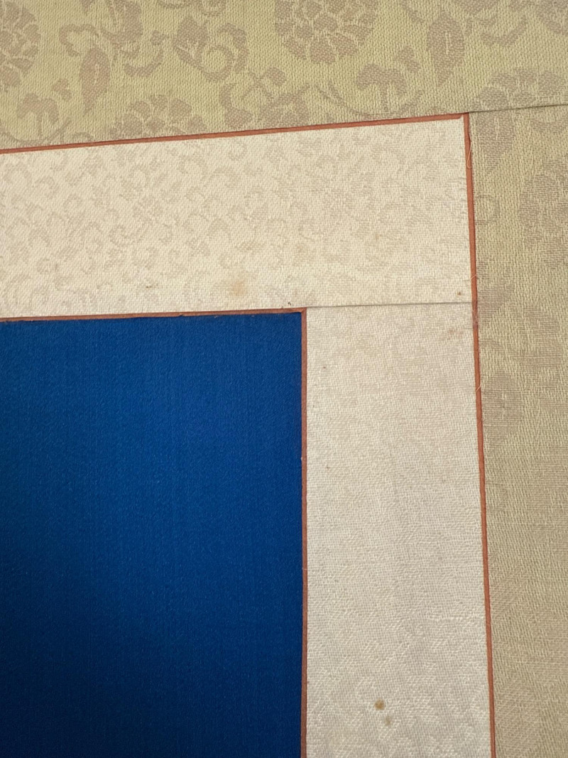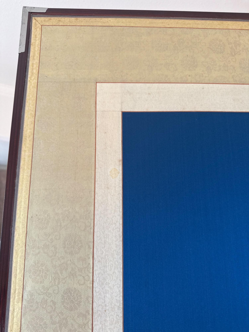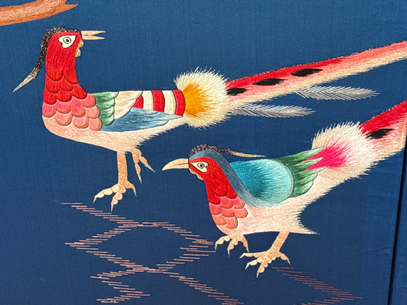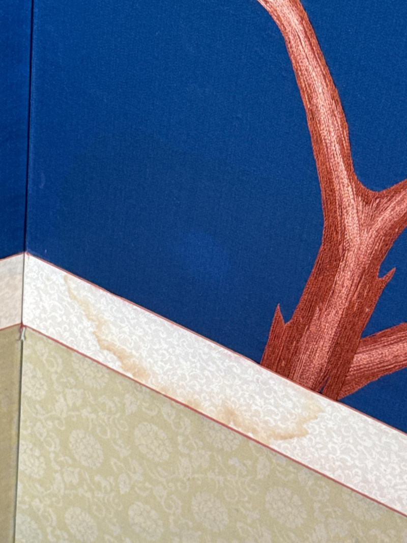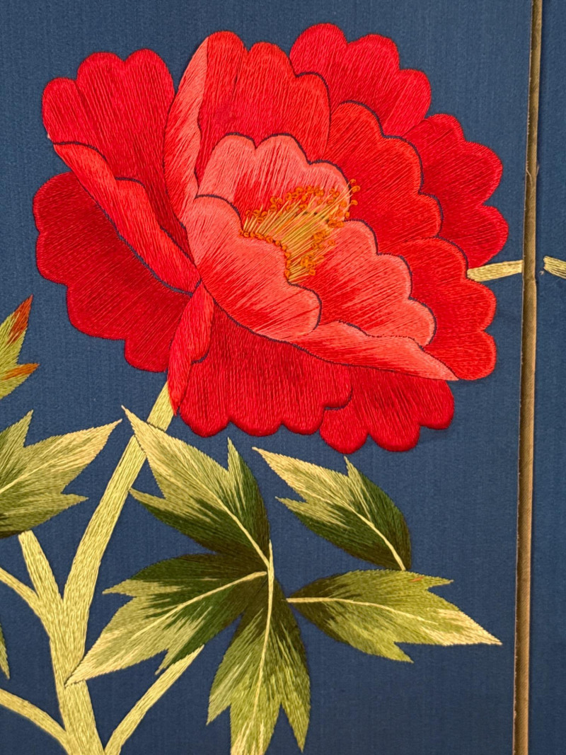 Condition: Embroidery remains vibrant with intact stitching One panel shows a water stain at lower edge End panels exhibit mold spotting Reverse backing paper has a small tear Minor wear consistent with age Includes fitted silk storage/transport cover Professional cleaning recommended to enhance presentation Provenance & Notes: