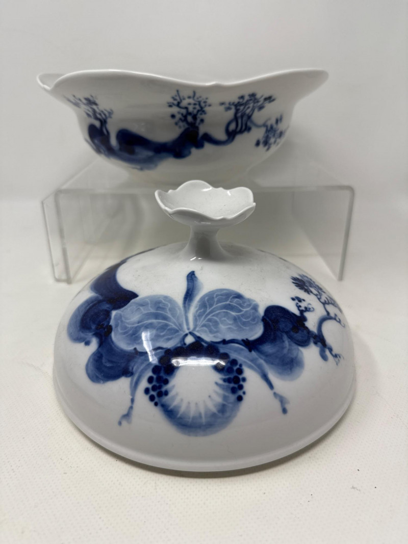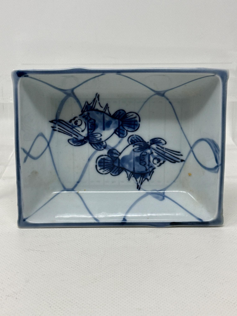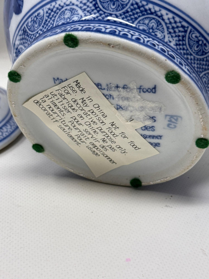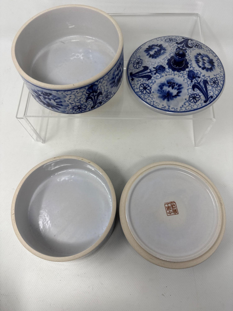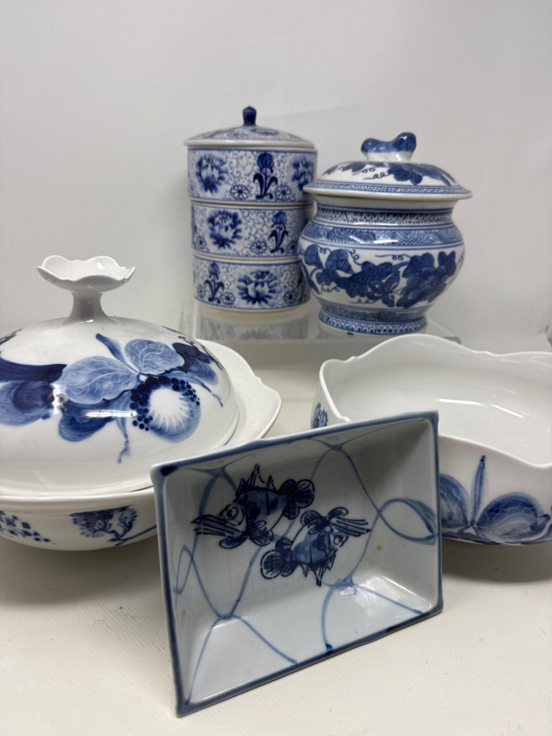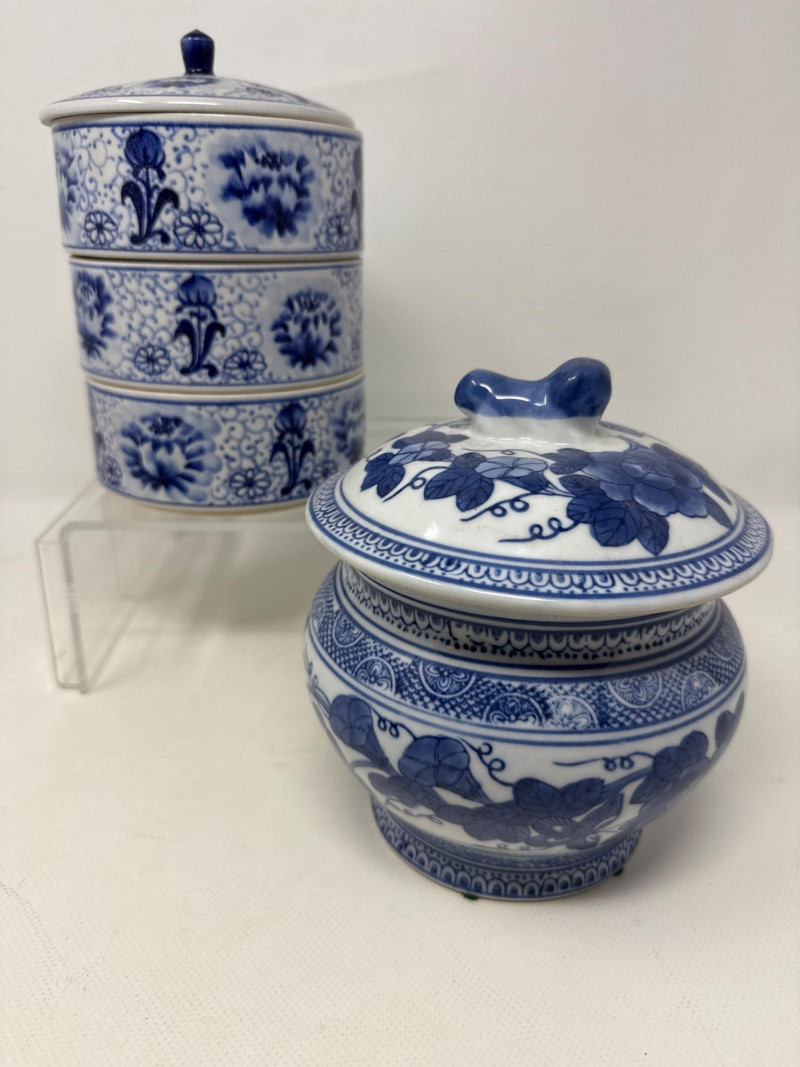 A beautifully coordinated set of vintage blue and white porcelain dishes featuring floral and scenic motifs with traditional Asian styling. This five-piece collection includes lidded vessels, serving dishes, and a stacking bowl tower—each showcasing intricate hand-painted designs and sculptural handles. Ideal for collectors, decorators, or resale pros seeking timeless ceramic artistry. Stacking Bowls – Three-section tower with lid; 8" H × 5" W Ginger Jar – Floral and scenic motif with bow-shaped lid handle; 7" H × 8" W Round Bowl – Floral design; 4" H × 8" W Casserole Dish – Lidded with flower-shaped handle; 7" H × 9" W Square Dish – Fish motif with geometric border; 2" H × 6" L × 5" W Set Includes