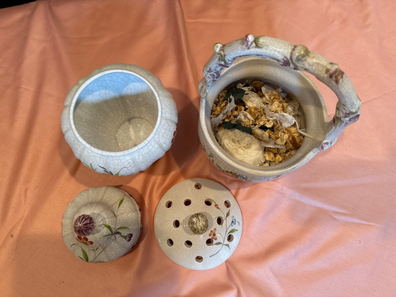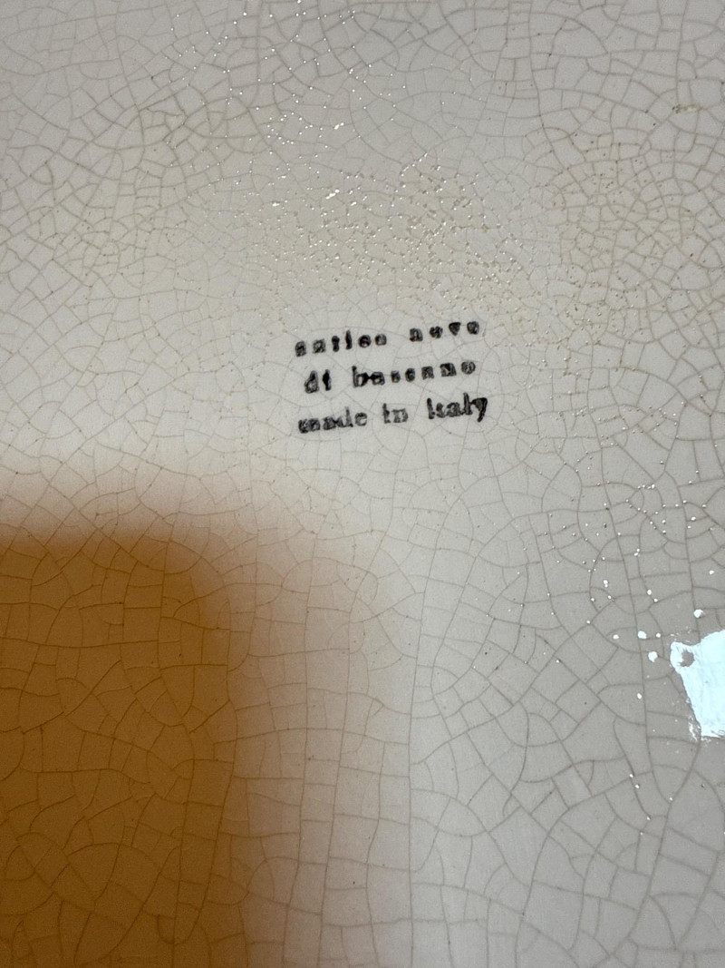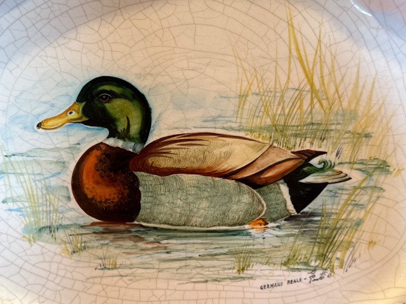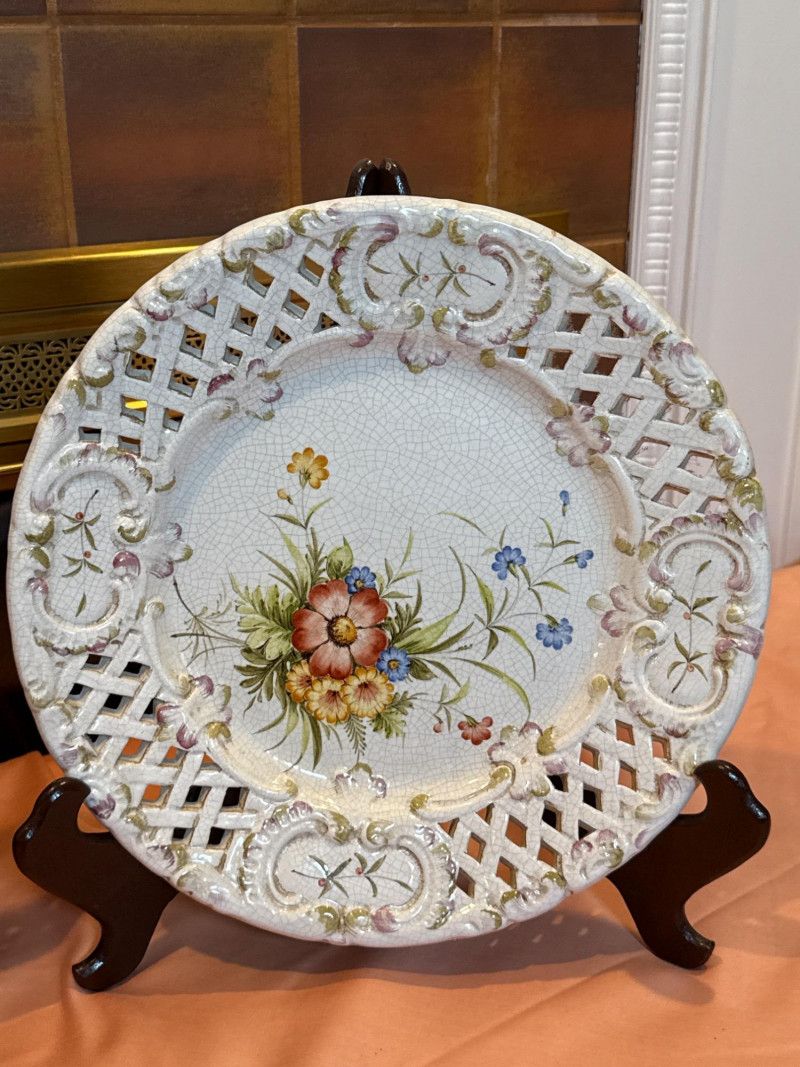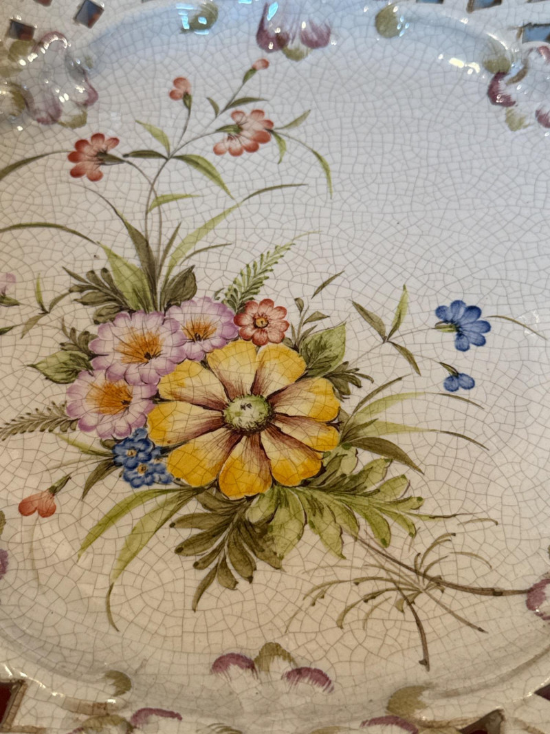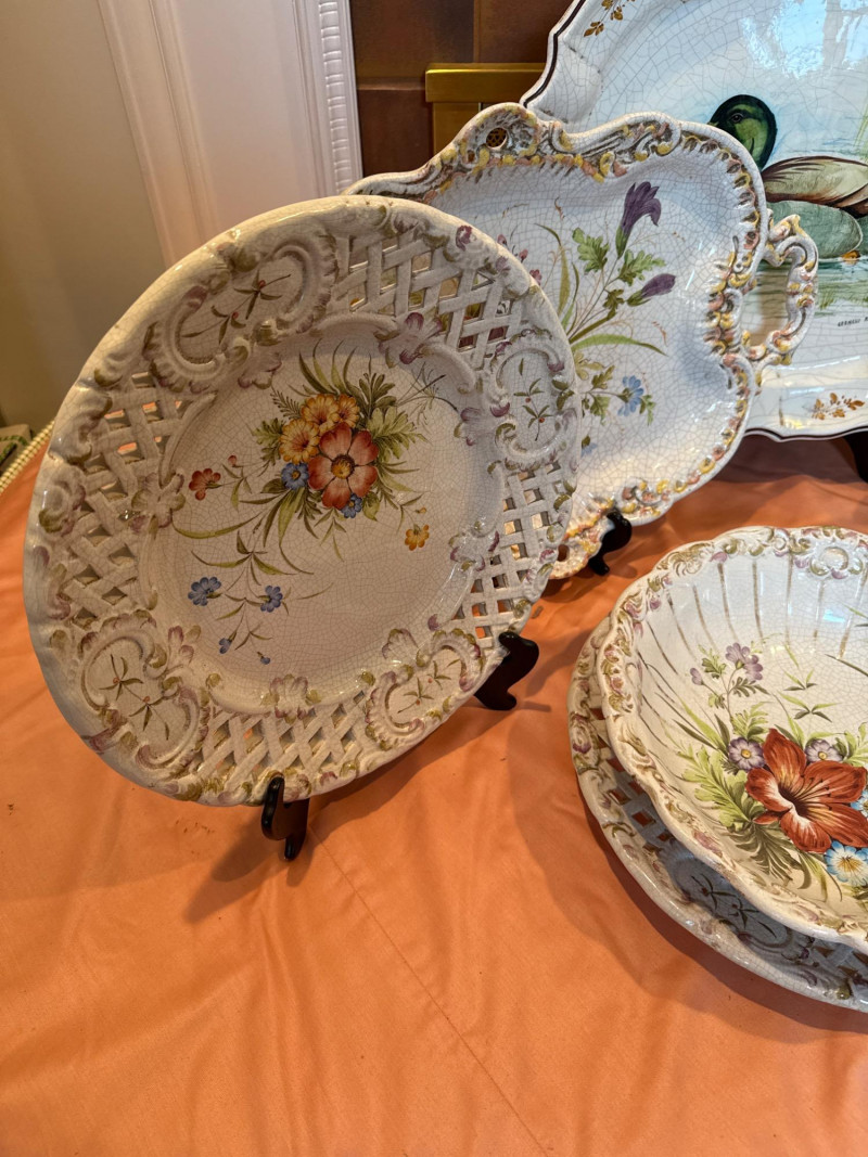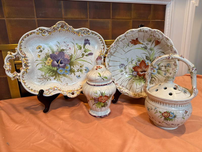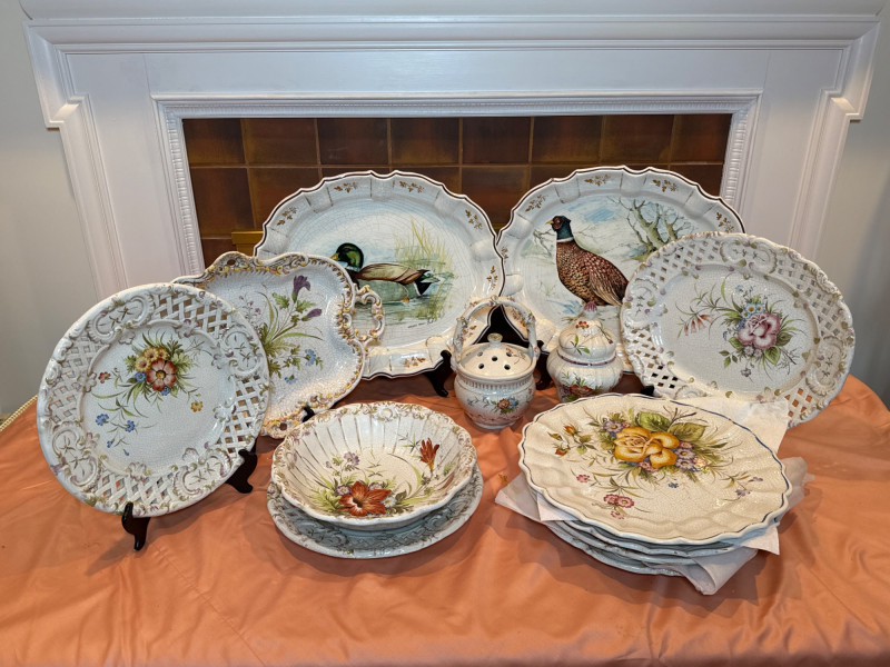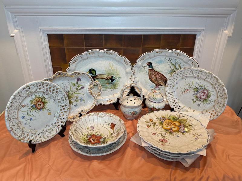 A richly detailed and visually captivating collection of vintage Italian porcelain serving pieces, featuring embossed edges, scalloped rims, and hand-painted wildlife and floral scenes. Ducks, pheasants, and garden blooms adorn these platters and bowls, each crafted with ornate latticework and sculptural handles. Ideal for collectors, decorators, or resale pros seeking statement ceramics with European charm. Large Serving Bowl – 13" W × 3.5" H Matching Lattice Platters – Two, 14" W Oval Lettuce Platter – 16" L × 14" W Handled Serving Platter – 20.5" L × 14" W Pheasant & Mallard Platters – Two, 20" L × 16.5" W Covered Pot – 11" H × 7" W Ginger Jar – 10.5" H × 5" W Large Round Flats – Two, 16" W Additional Bowl & Shaker – Coordinating wildlife and floral designs Set Includes