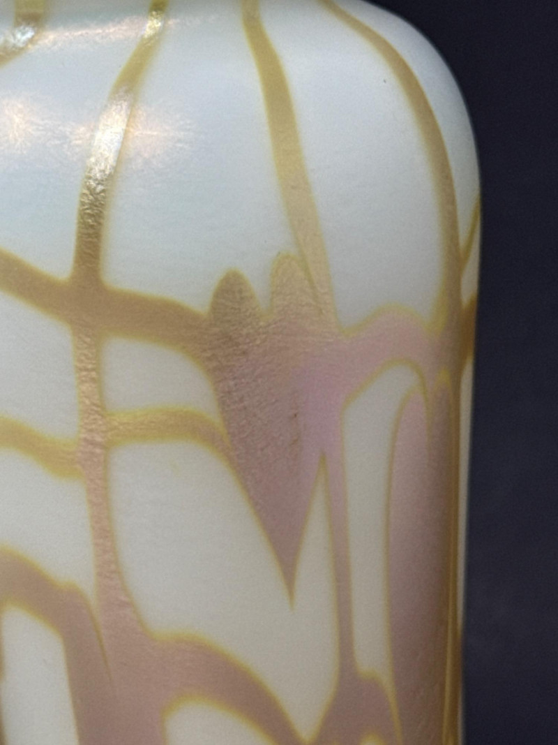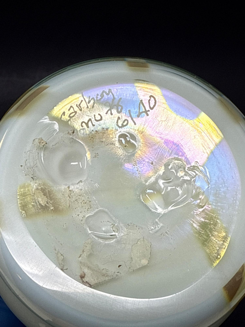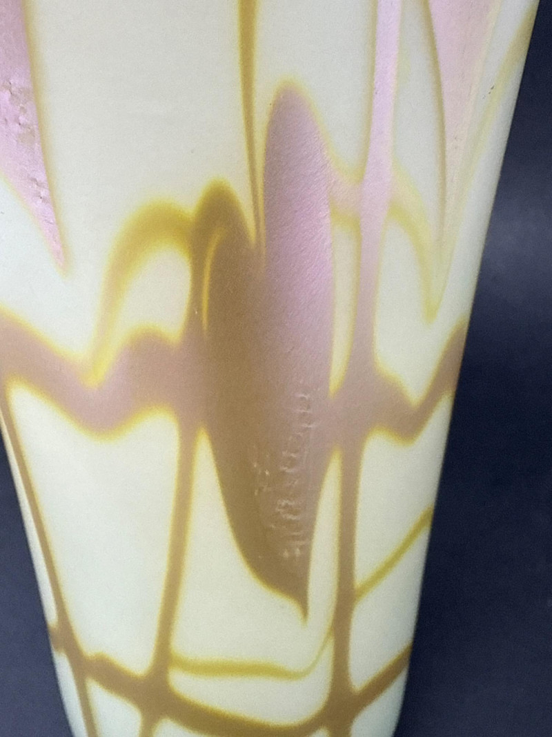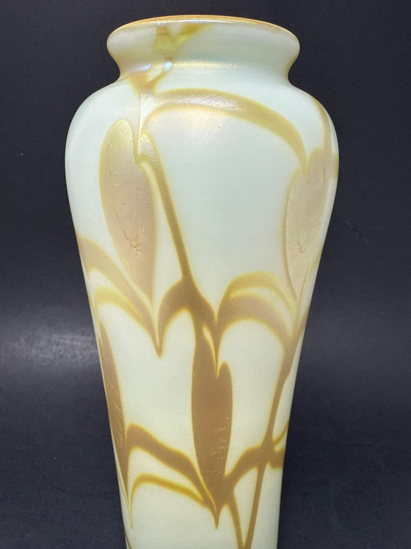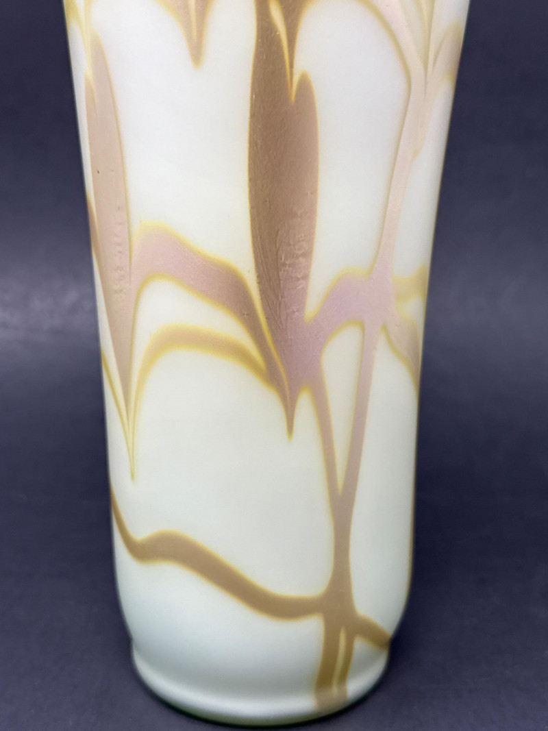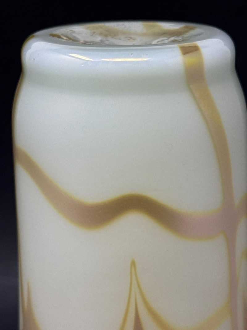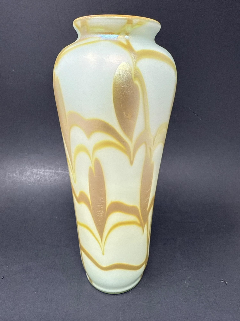 A luminous and sculptural studio art vase signed “Carlson 1976,” numbered 6140 (or 6/40), featuring cascading gold and brown feather-like glazes over a pale iridescent base. The tall, narrow-necked form and organic flow of the glaze evoke mid-century artistry and ceramic innovation. Ideal for collectors, decorators, or resale pros seeking signed studio pottery with visual impact. Artist: Signed Carlson Date: 1976 Number: 6140 or 6/40 Material: Glazed ceramic with iridescent finish Category: Collectibles / Artifacts Height: 9.25" Width: 3.5"Item Details