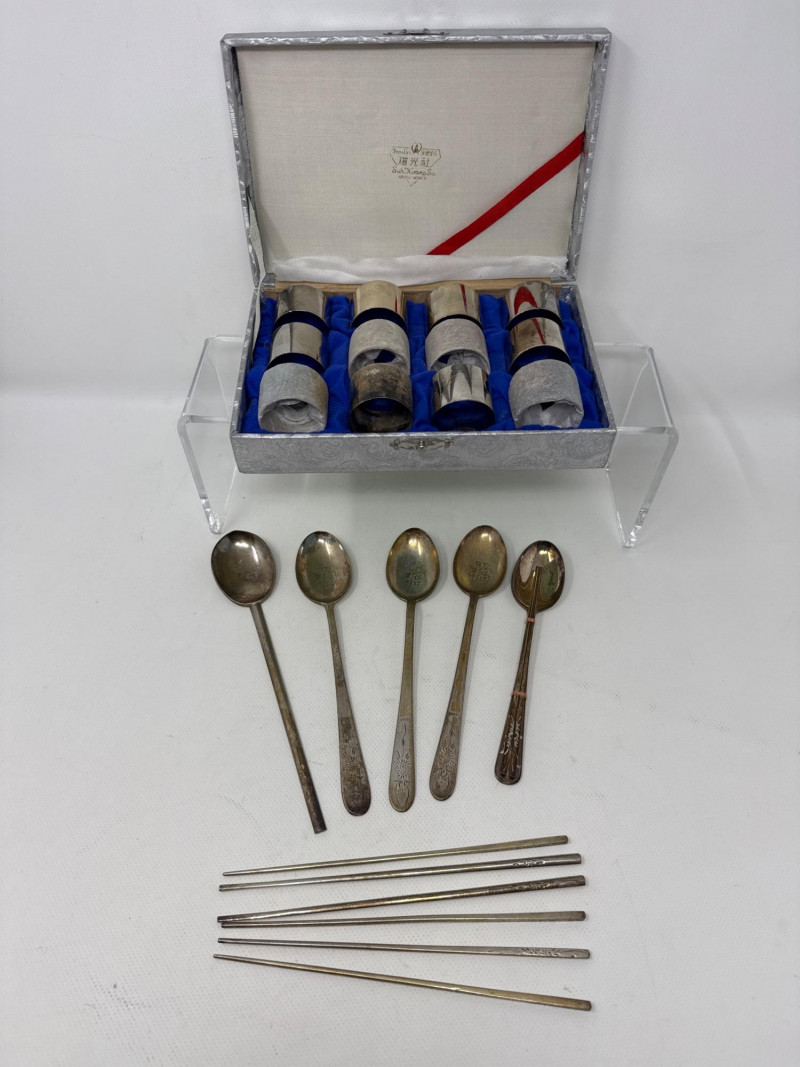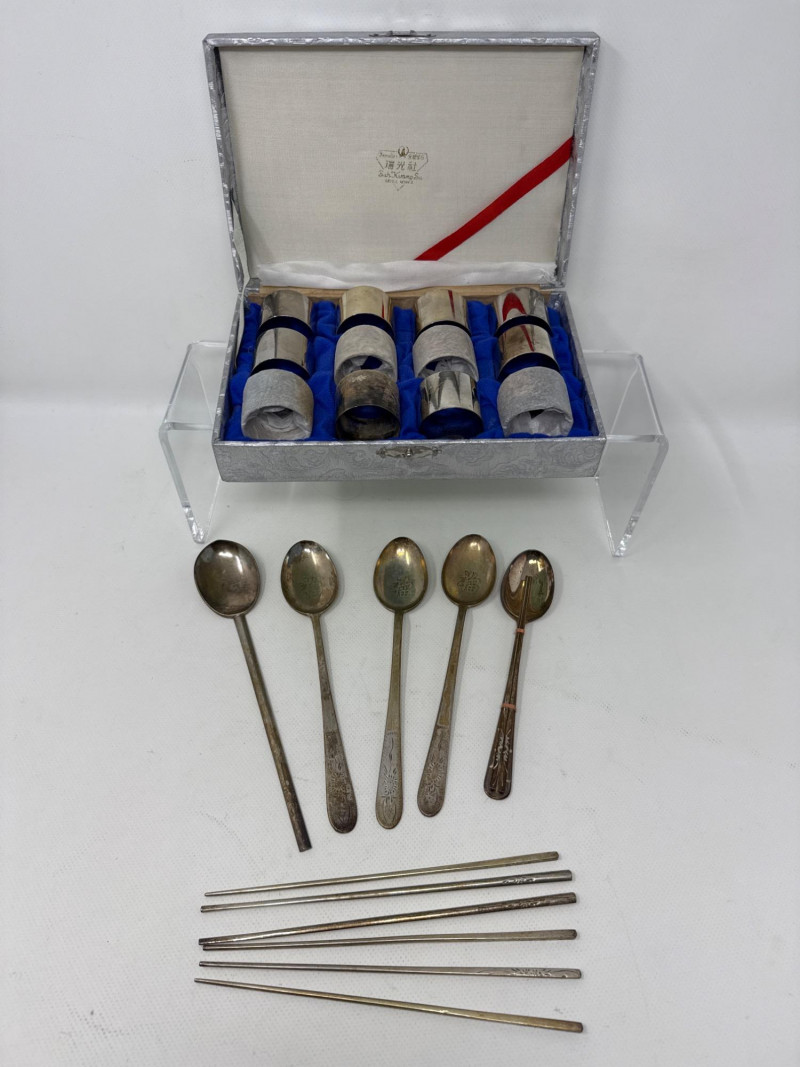 Lot # 215 - Sterling Spoons, Silver-Tone Chopsticks & SP Napkin Rings – 18-Piece