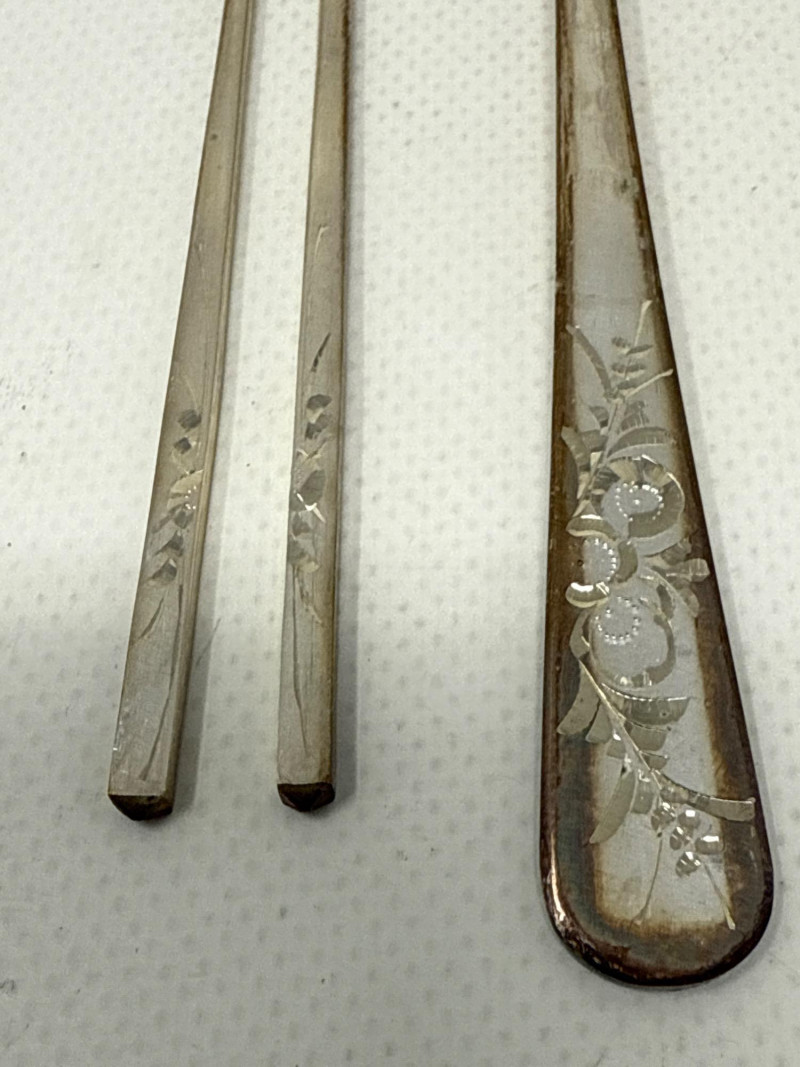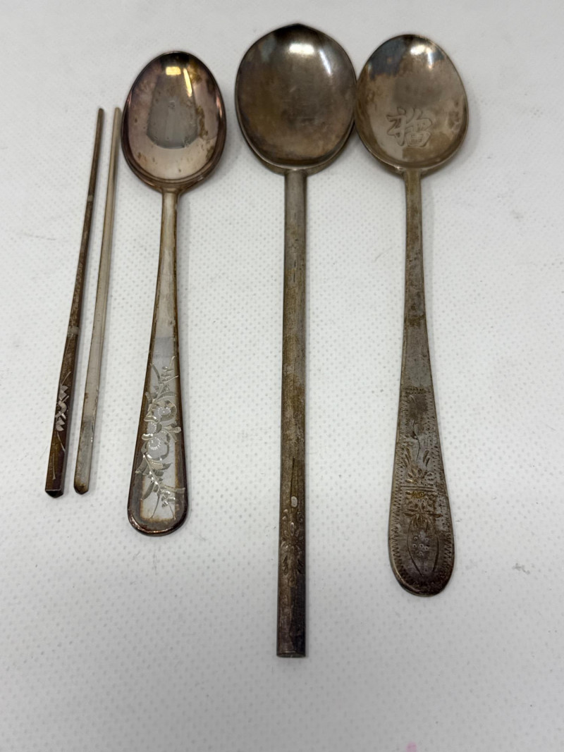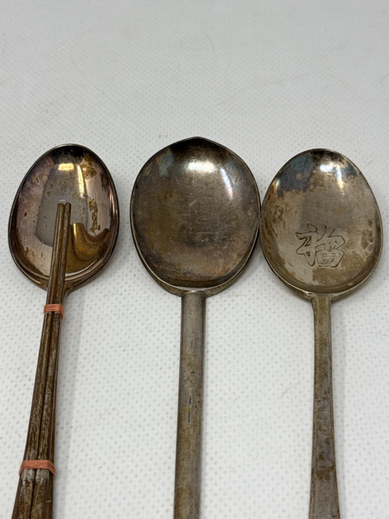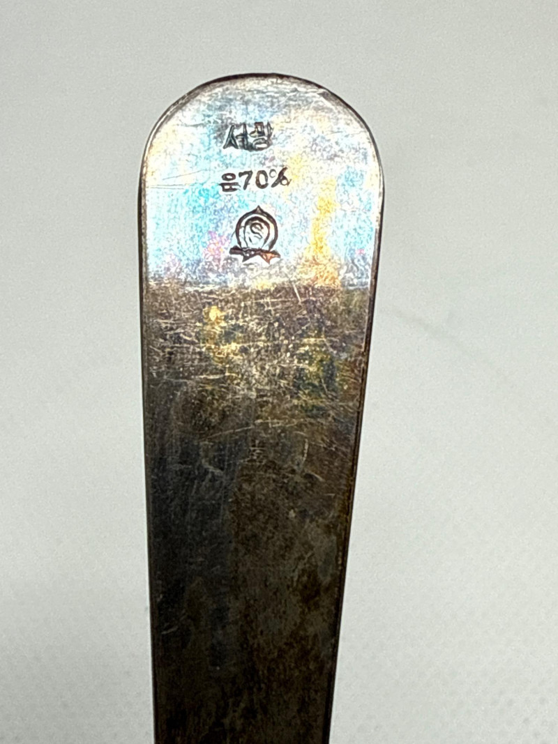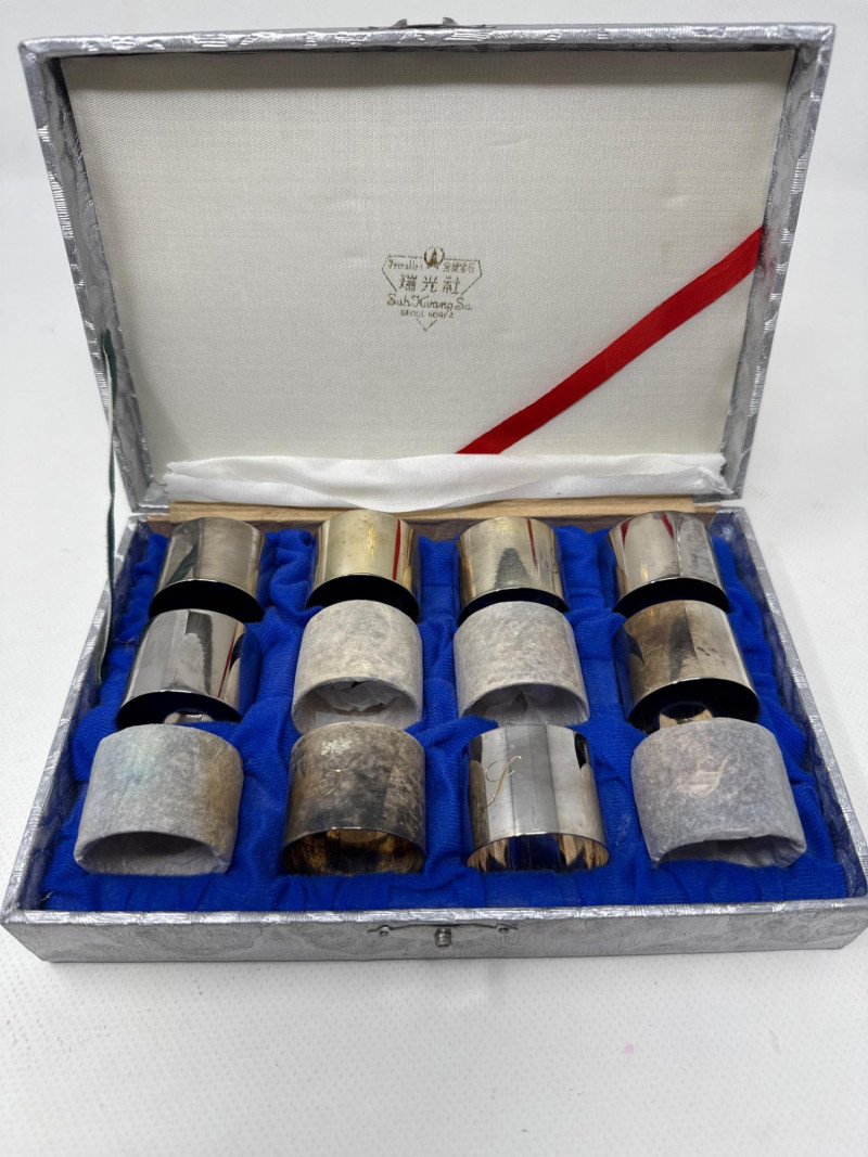 A refined and collectible set of vintage silverware featuring marked 70% sterling spoons, unmarked silver-tone chopsticks, and a boxed set of six silver-plated napkin rings. The spoons and chopsticks bear Asian markings, while the napkin rings are presented in a satin-lined case labeled “SILVER PLATED MADE IN HONG KONG,” attributed to Suh Kwang Sa of Korea. Ideal for collectors, stylists, or resale pros seeking elegant tableware with international flair. 6 Spoons – Marked 70% sterling; longest is 8.75" 6 Chopsticks/Stirrers – Approx. 7.75" long; unmarked 6 Napkin Rings – Silver-plated; new in box with blue velvet interior Spoons show light tarnish consistent with age Napkin rings are unused in original presentation box Sold as a complete setSet Includes