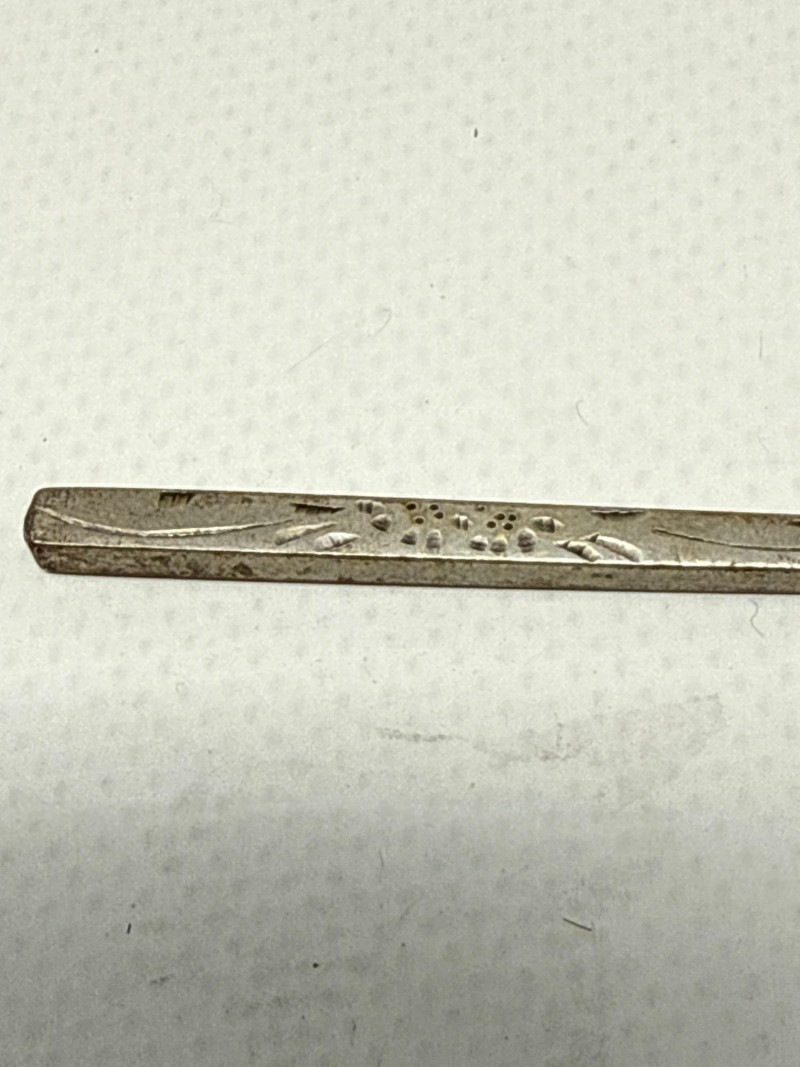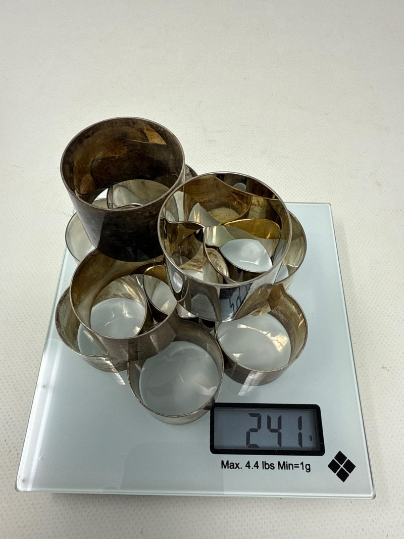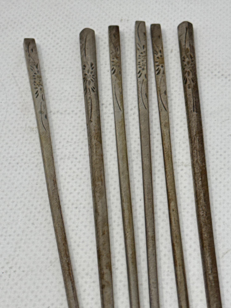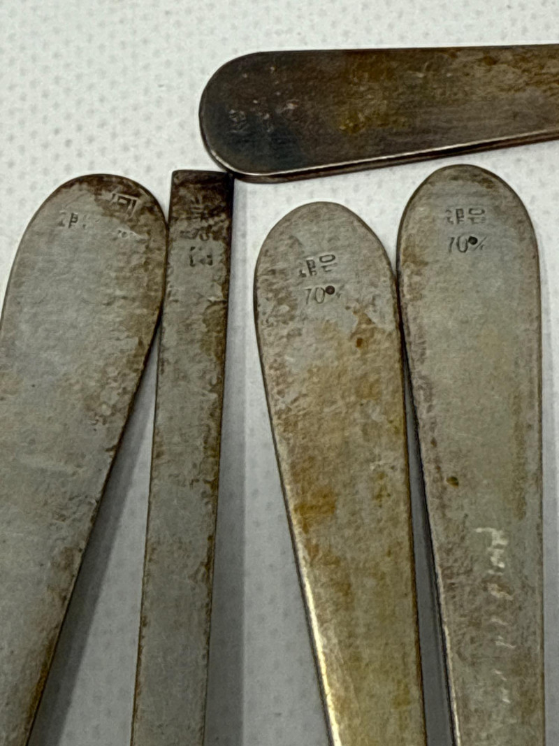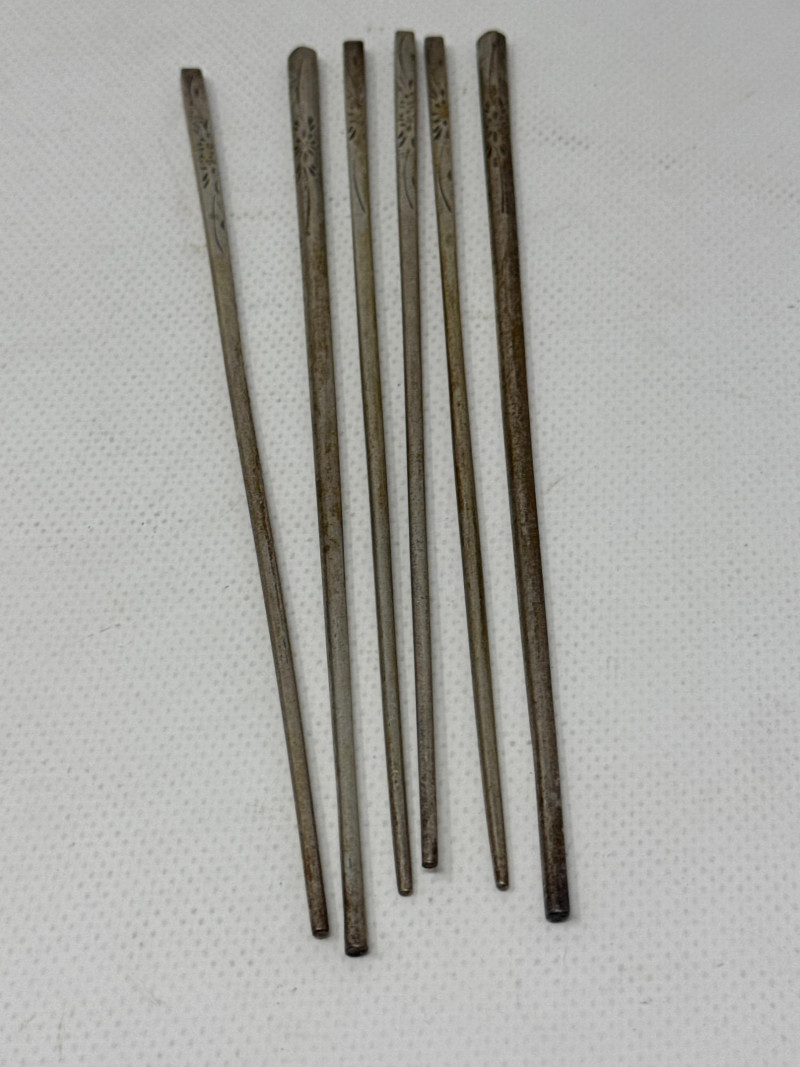 A refined and collectible set of vintage silverware featuring marked 70% sterling spoons, unmarked silver-tone chopsticks, and a boxed set of six silver-plated napkin rings. The spoons and chopsticks bear Asian markings, while the napkin rings are presented in a satin-lined case labeled “SILVER PLATED MADE IN HONG KONG,” attributed to Suh Kwang Sa of Korea. Ideal for collectors, stylists, or resale pros seeking elegant tableware with international flair. 6 Spoons – Marked 70% sterling; longest is 8.75" 6 Chopsticks/Stirrers – Approx. 7.75" long; unmarked 6 Napkin Rings – Silver-plated; new in box with blue velvet interior Spoons show light tarnish consistent with age Napkin rings are unused in original presentation box Sold as a complete setSet Includes