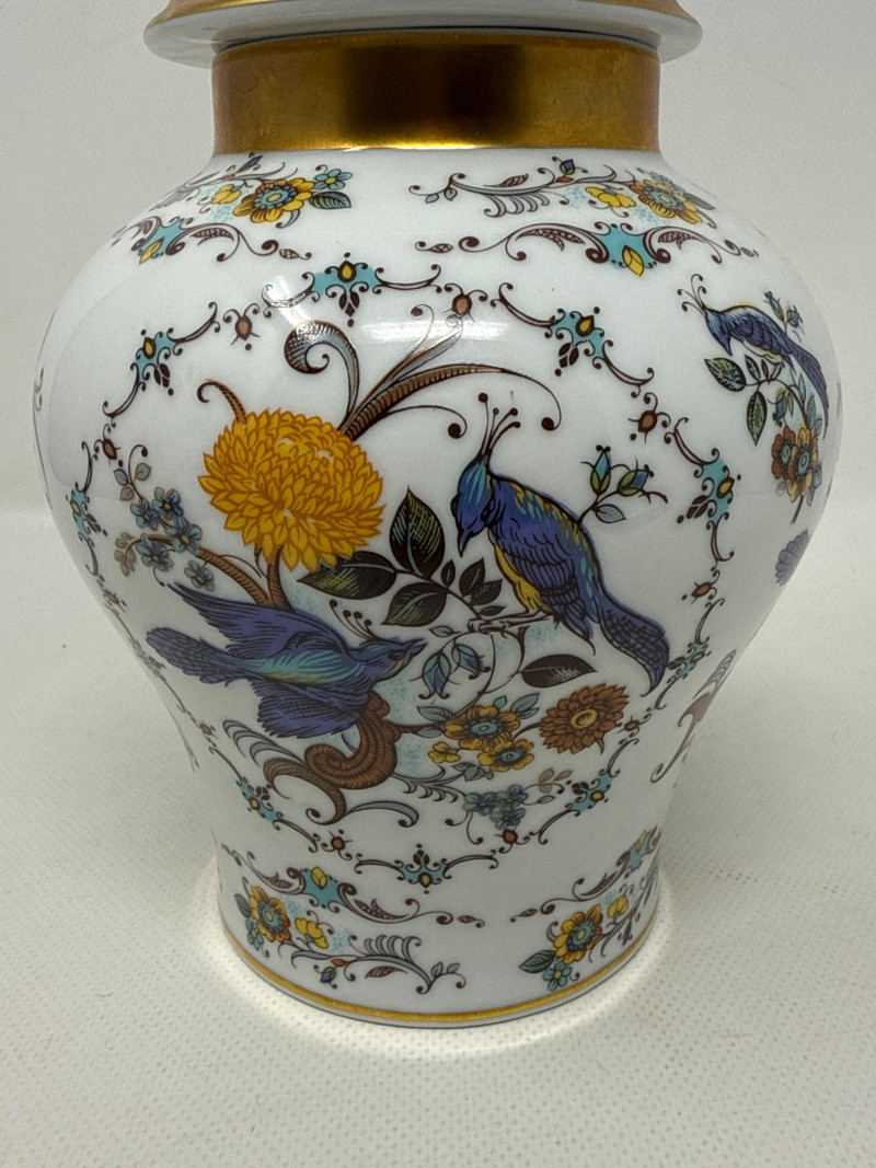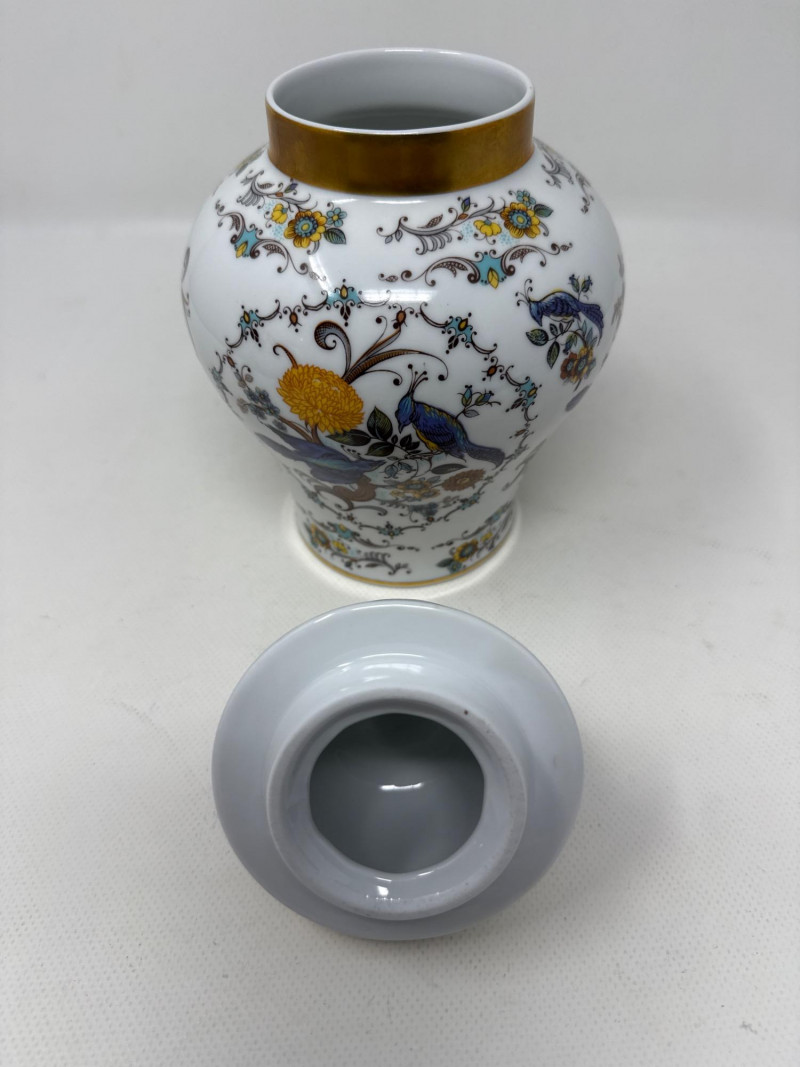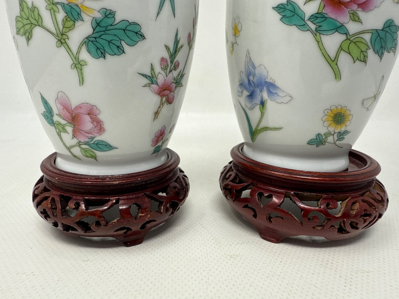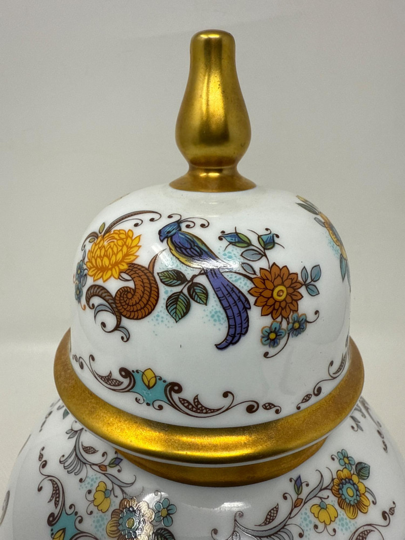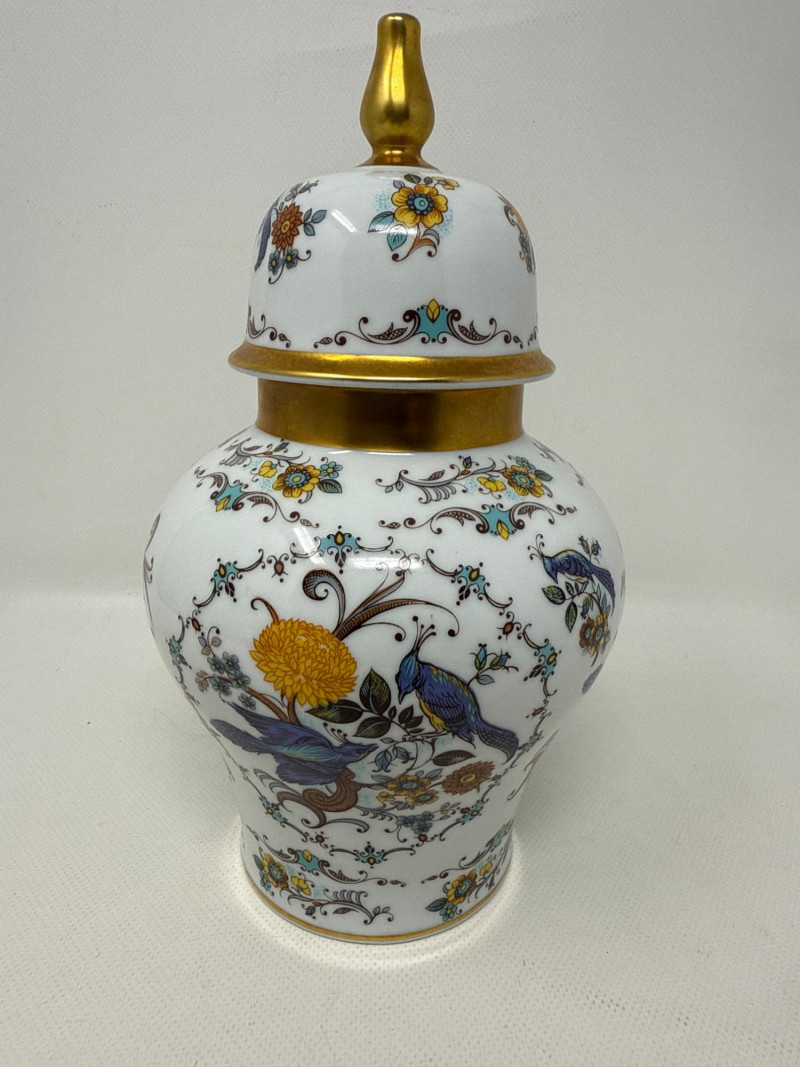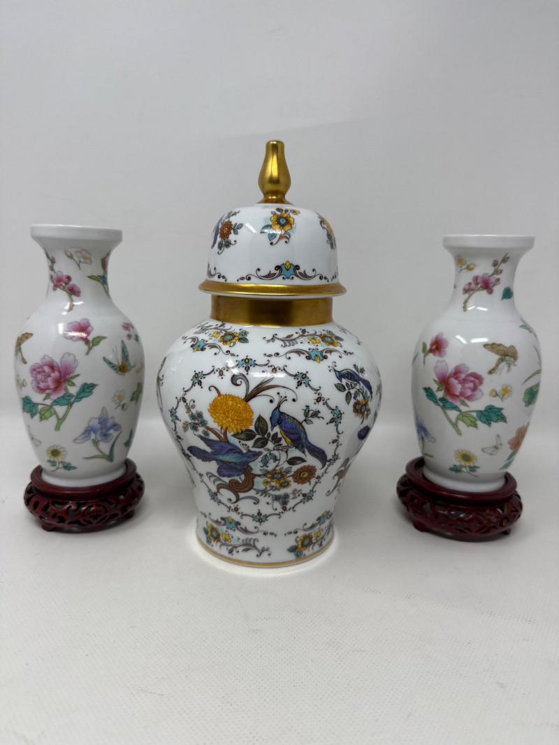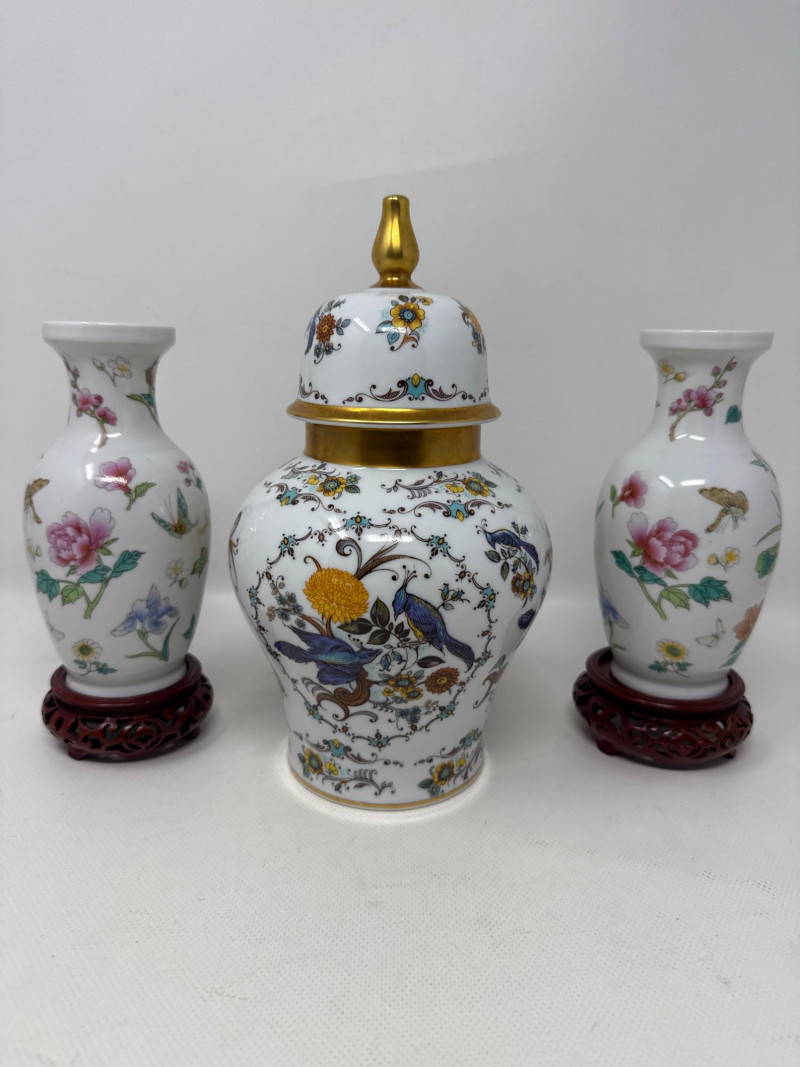 A graceful and collectible trio of decorative porcelain vessels featuring vibrant floral and bird motifs. The centerpiece is a Porzellan Bavarian lidded urn with a golden top, flanked by two Asian-style vases adorned with multicolor blossoms and perched birds. Each piece is hand-painted and elevated on carved wood bases, offering timeless elegance and global charm—ideal for mantel styling, shelf displays, or resale to collectors of fine ceramics. Porzellan Bavarian Urn Height: 10" Width: 5" Finish: Glossy with gold-tone lid Motif: Floral and bird design Asian Floral Vases (2) Height: 8" with base; 6.75" without Width: 3" Finish: Multicolor hand-painted porcelain Motif: Birds and blossoms Bases: Carved woodItem Details