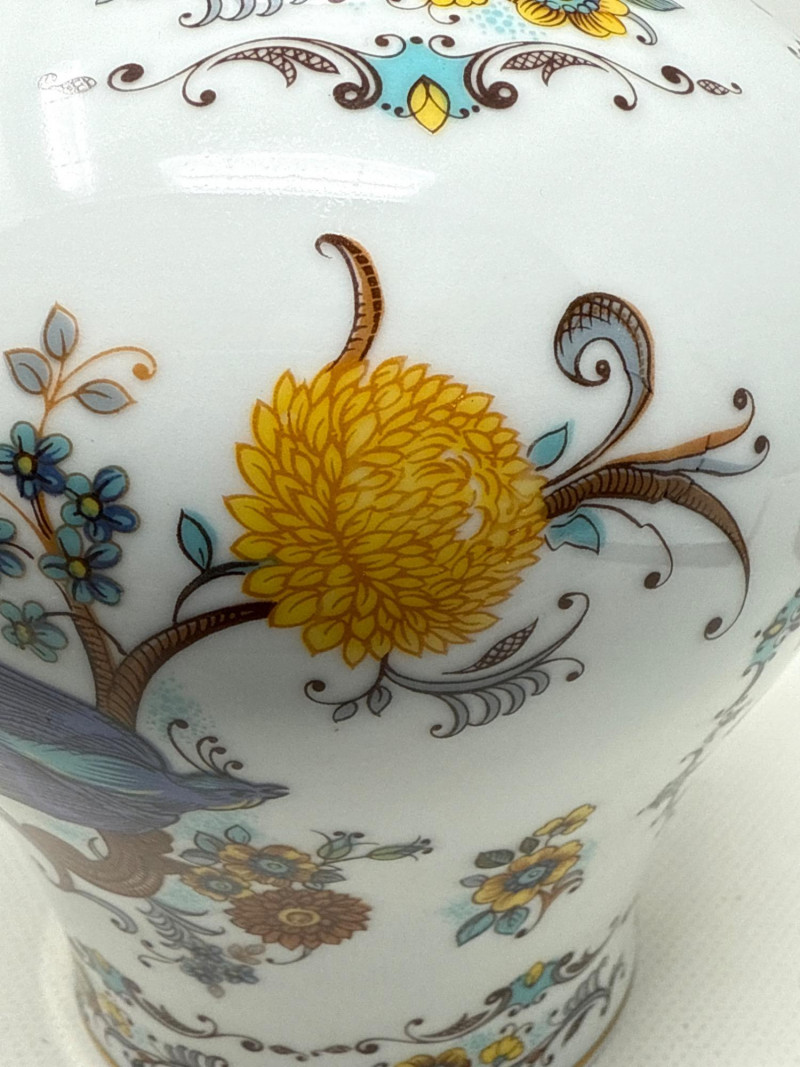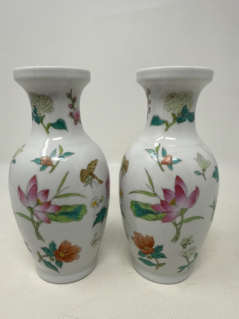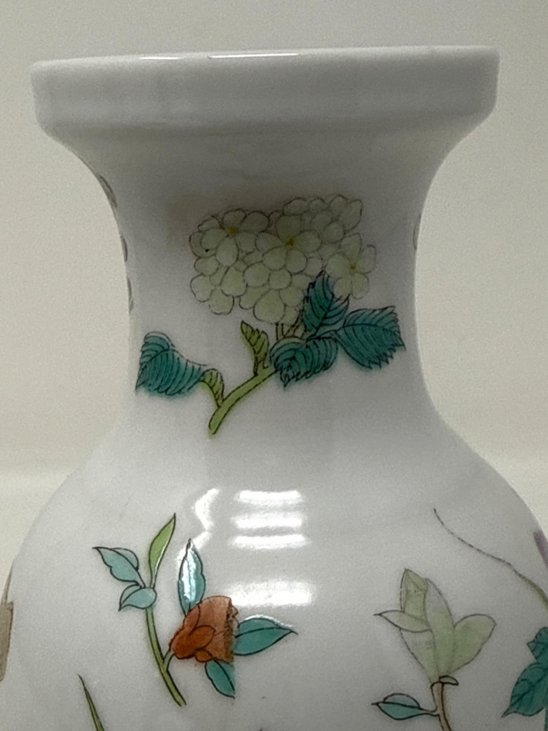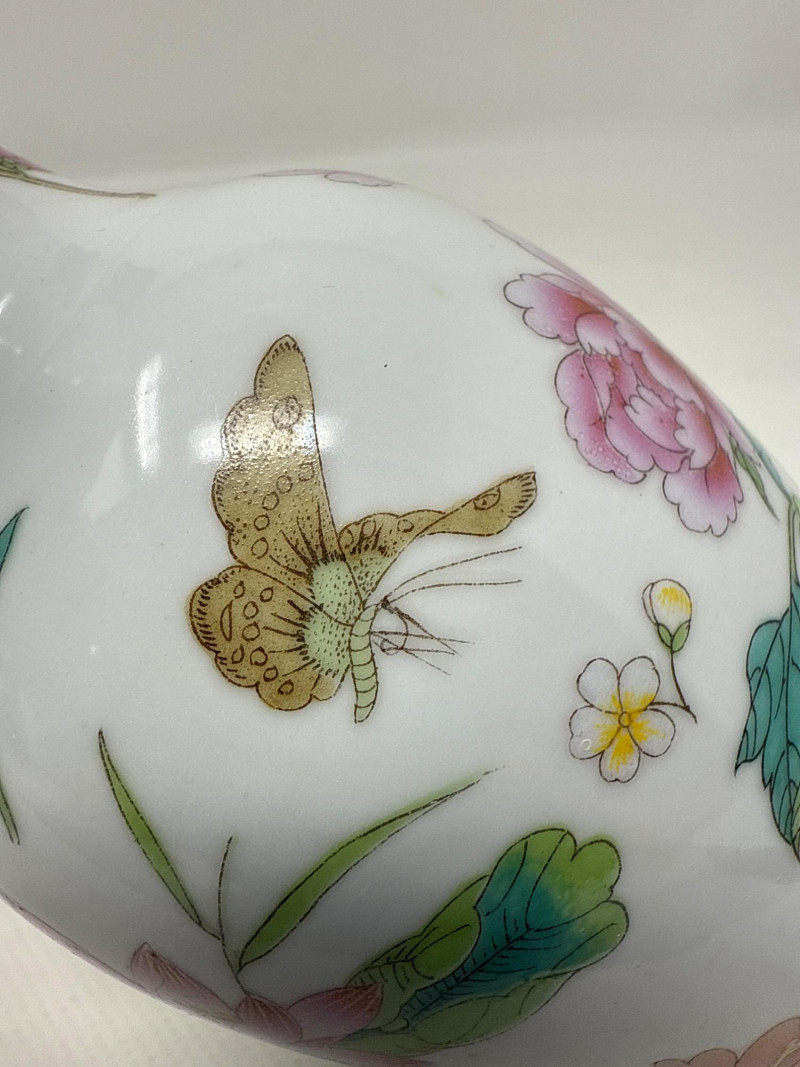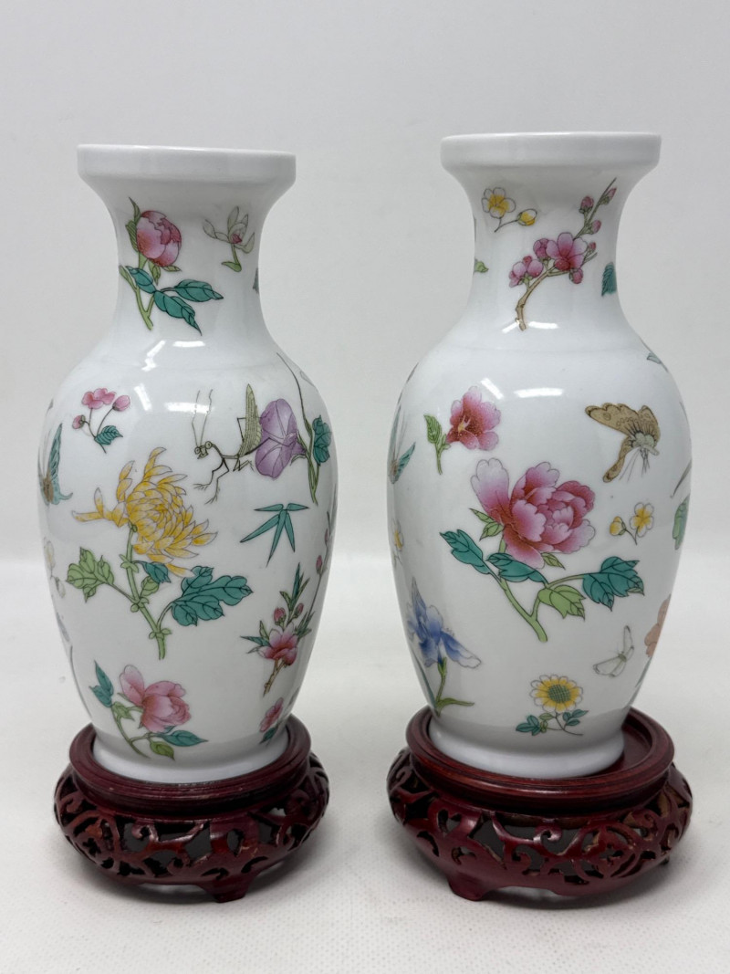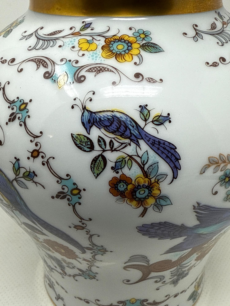 A graceful and collectible trio of decorative porcelain vessels featuring vibrant floral and bird motifs. The centerpiece is a Porzellan Bavarian lidded urn with a golden top, flanked by two Asian-style vases adorned with multicolor blossoms and perched birds. Each piece is hand-painted and elevated on carved wood bases, offering timeless elegance and global charm—ideal for mantel styling, shelf displays, or resale to collectors of fine ceramics. Porzellan Bavarian Urn Height: 10" Width: 5" Finish: Glossy with gold-tone lid Motif: Floral and bird design Asian Floral Vases (2) Height: 8" with base; 6.75" without Width: 3" Finish: Multicolor hand-painted porcelain Motif: Birds and blossoms Bases: Carved woodItem Details