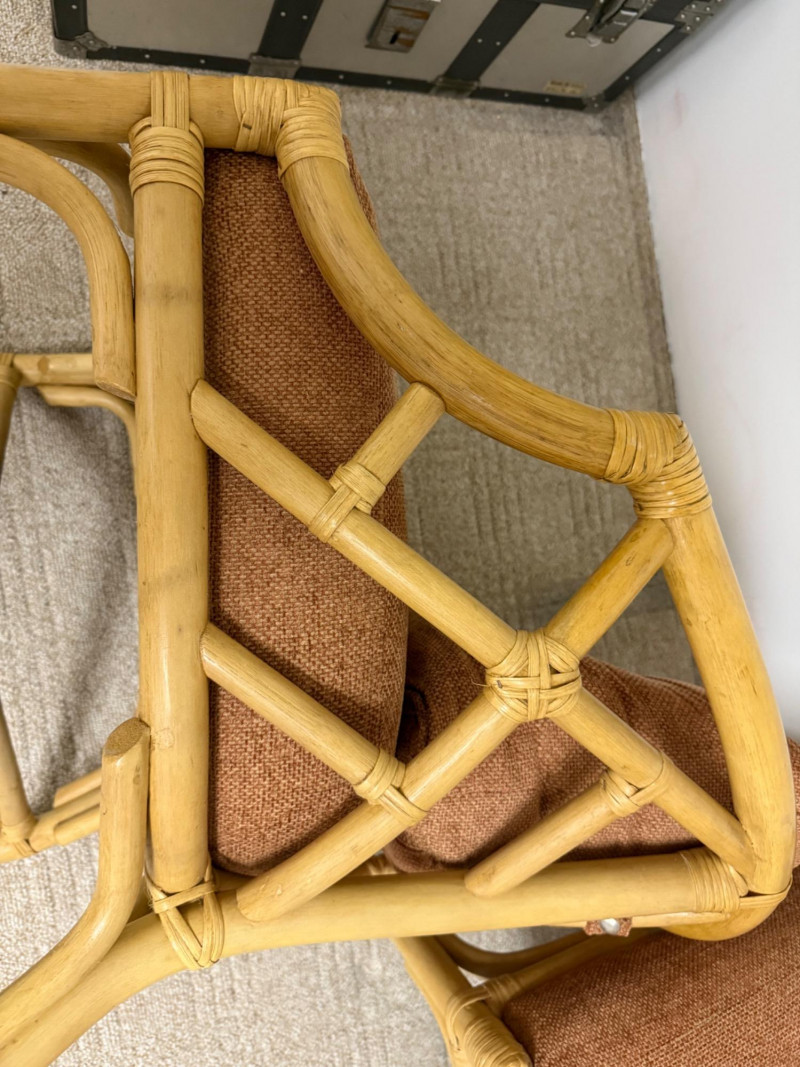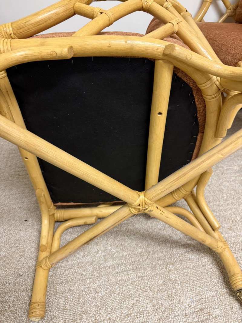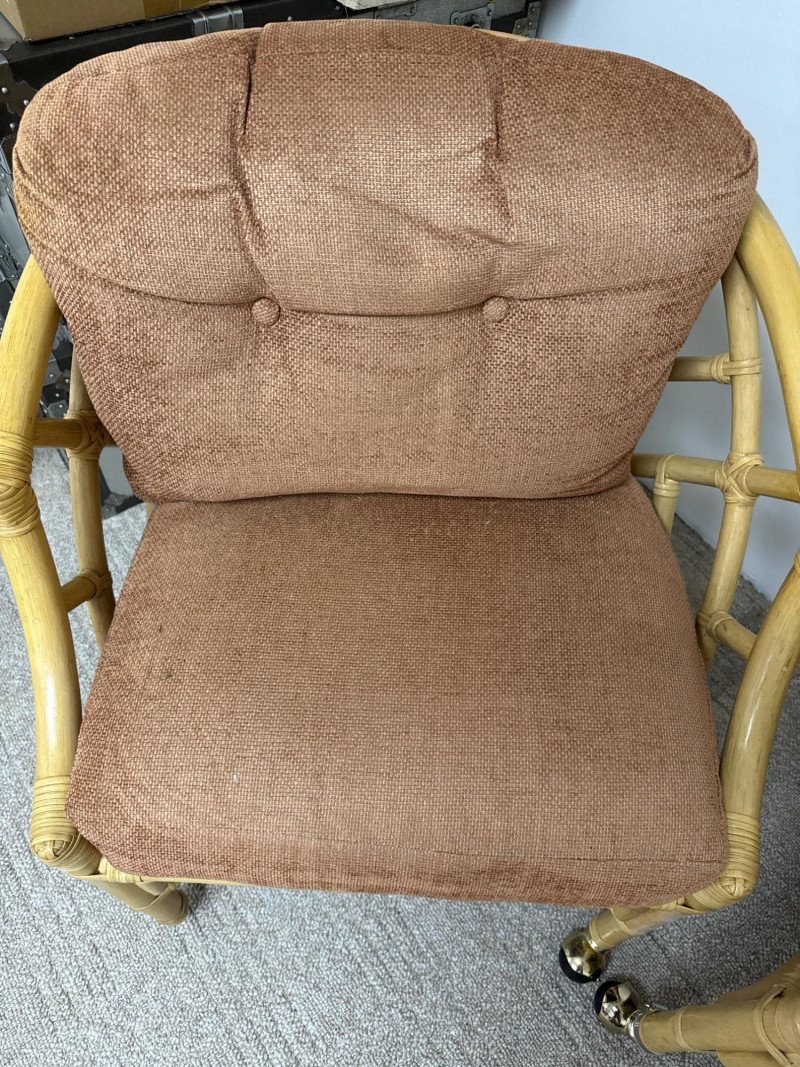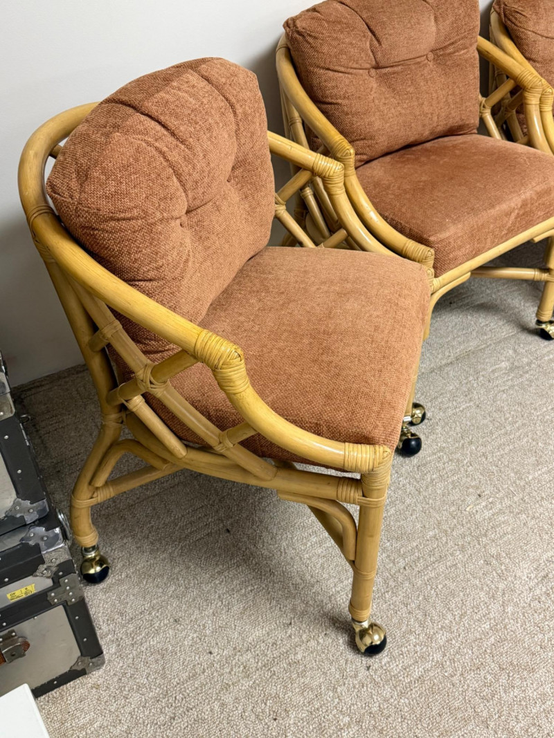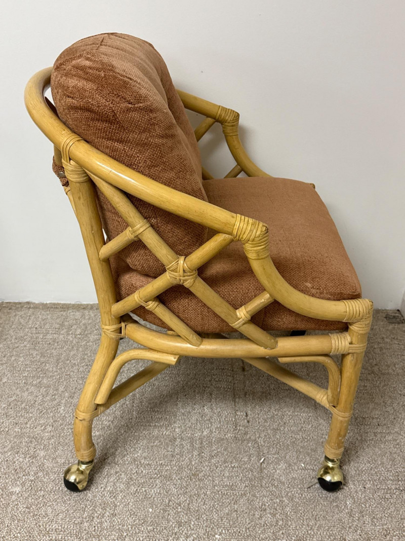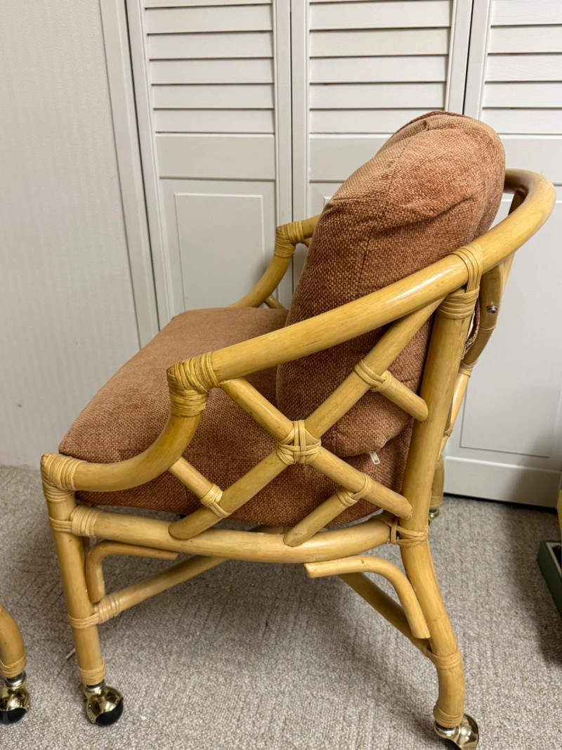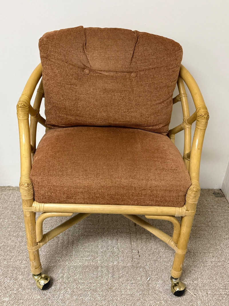 A stylish and functional set of four mid-century modern bamboo-style armchairs featuring curved wood frames and caster wheels for easy mobility. Each chair is fitted with a padded seat and back cushion in a warm brown-orange upholstery, offering comfort and retro charm. Ideal for dining, game tables, or resale to decorators and MCM enthusiasts. Quantity: 4 chairs Frame: Light wood with curved arms and caster wheels Upholstery: Brown-orange padded cushions Style: Mid-century modern bamboo-inspired Length: 22" Width: 26" Height: 30" Depth: 21" Item Details