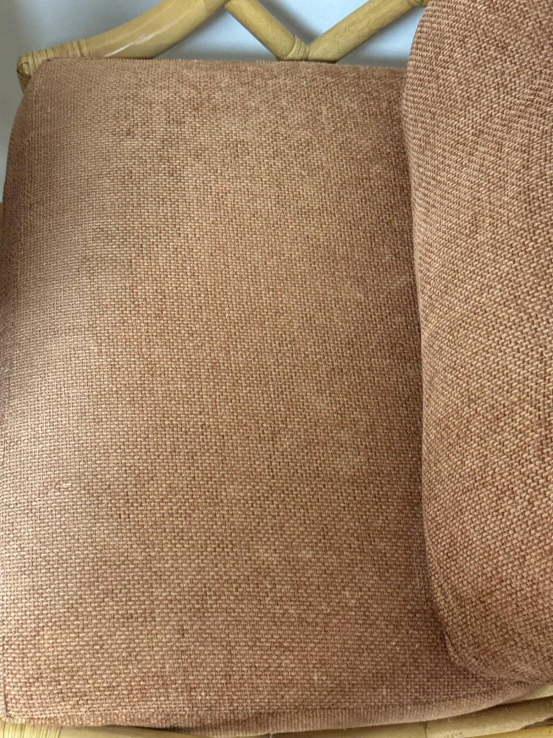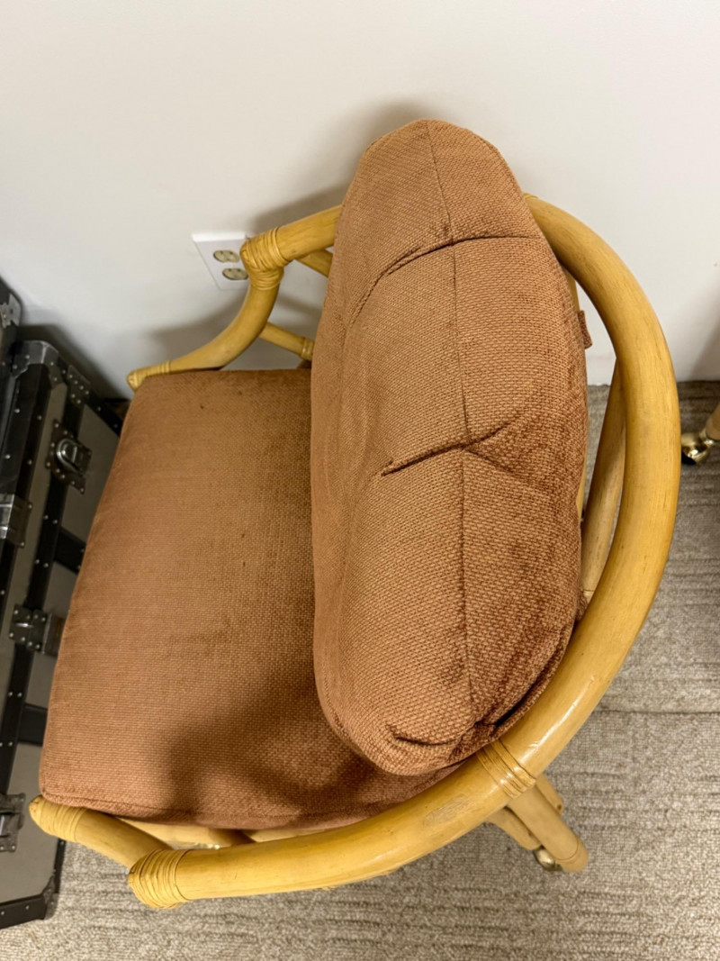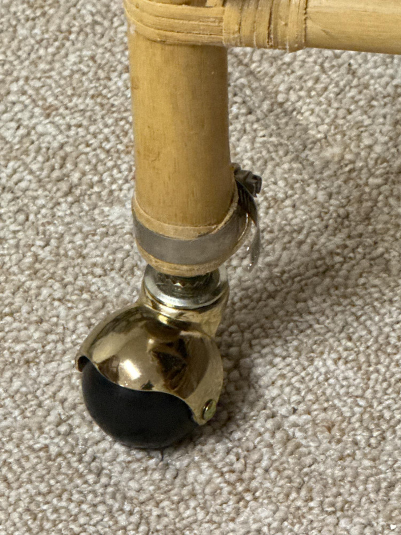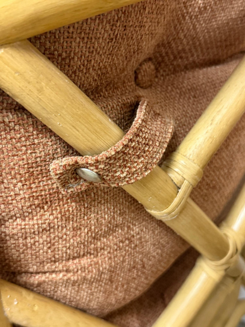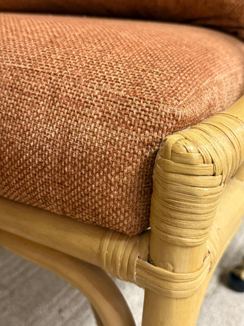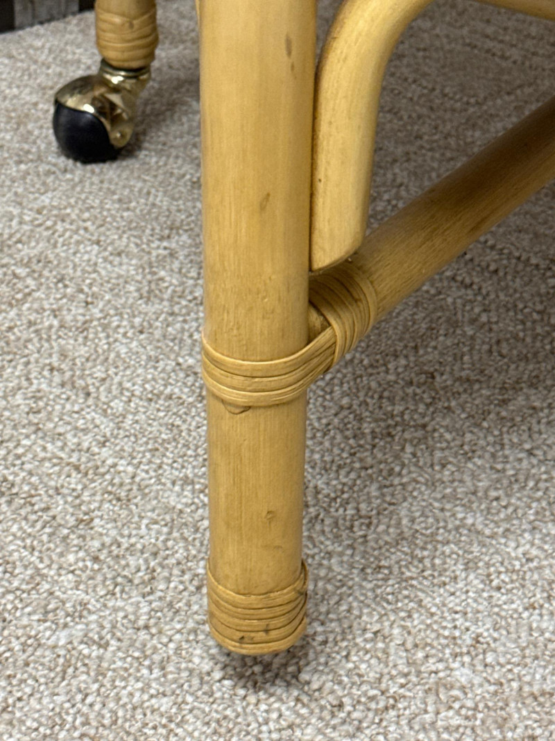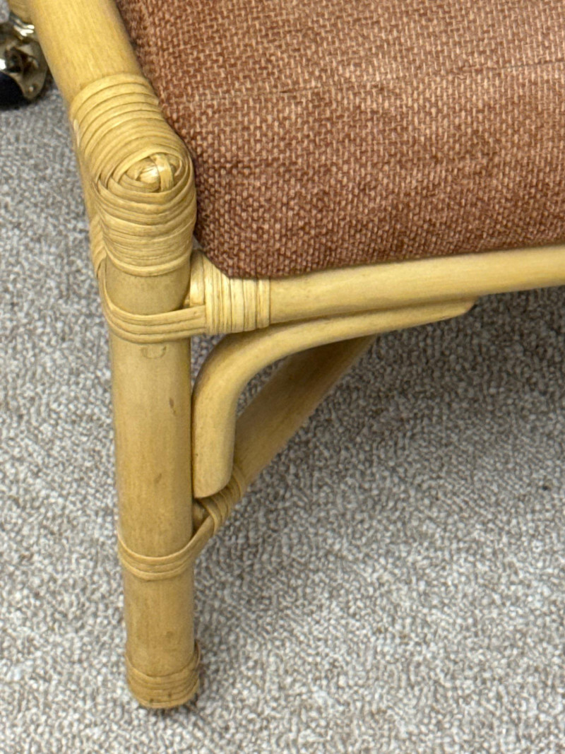 A stylish and functional set of four mid-century modern bamboo-style armchairs featuring curved wood frames and caster wheels for easy mobility. Each chair is fitted with a padded seat and back cushion in a warm brown-orange upholstery, offering comfort and retro charm. Ideal for dining, game tables, or resale to decorators and MCM enthusiasts. Quantity: 4 chairs Frame: Light wood with curved arms and caster wheels Upholstery: Brown-orange padded cushions Style: Mid-century modern bamboo-inspired Length: 22" Width: 26" Height: 30" Depth: 21" Item Details