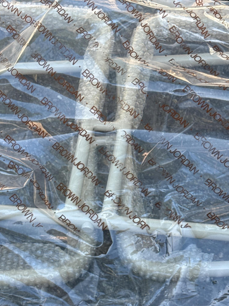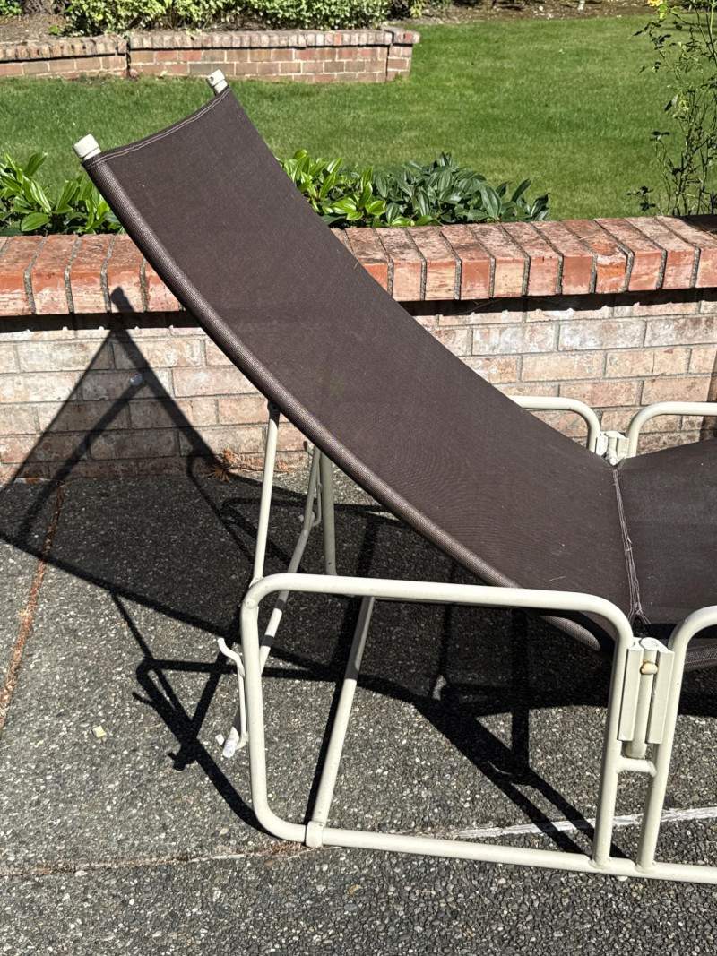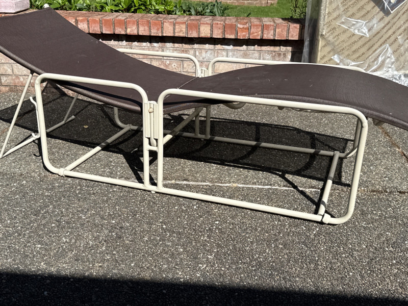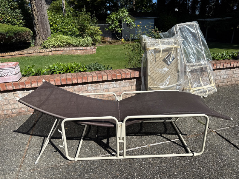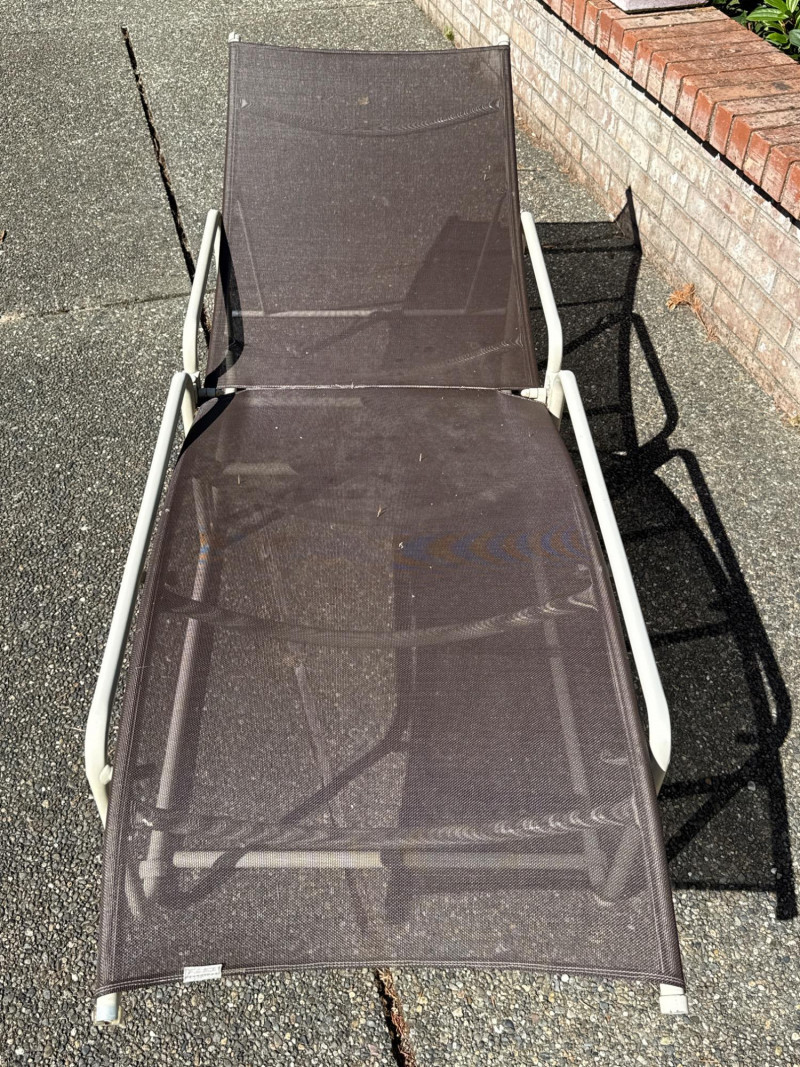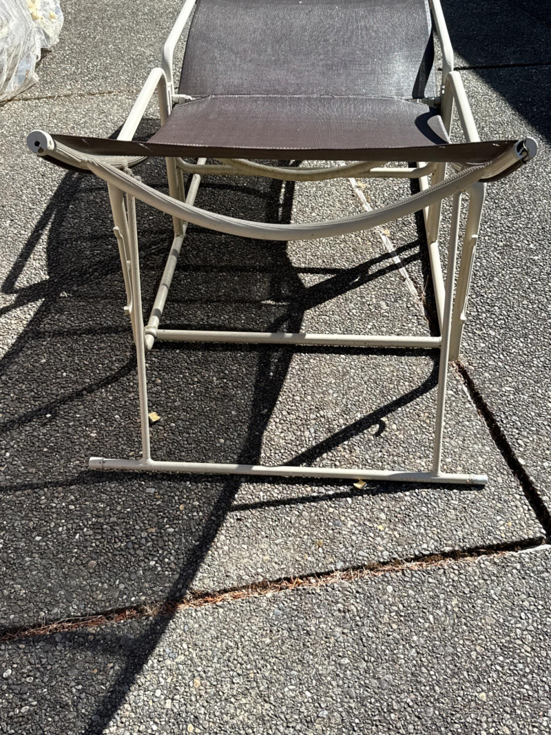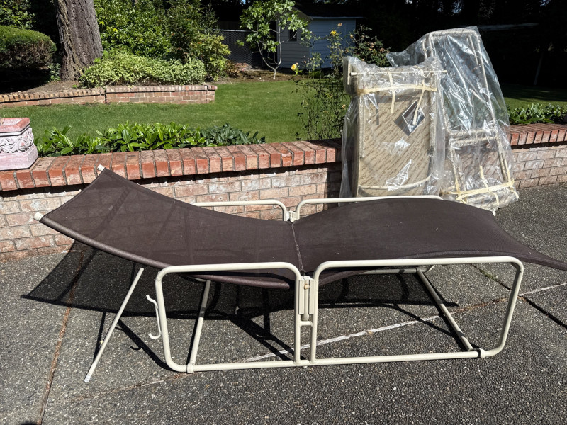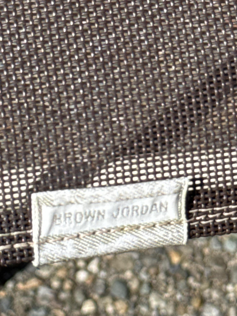 A sleek and functional trio of Brown Jordan-style patio lounge chairs featuring curved metal frames and ergonomic mesh seating. Two chairs are new and still wrapped in protective plastic—one without fabric—and the third has been used outdoors, showing light age but retaining good fabric condition. Ideal for poolside relaxation, garden staging, or resale to fans of classic outdoor furniture. Quantity: 3 lounge chairs 2 new (1 with fabric, 1 without) 1 used (fabric in good condition) Frame: Brown metal with curved ergonomic design Style: Mesh sunbed with reclined contour Category: Outdoor Items Length: 73" Width: 25" Height: 17.5" Item Details