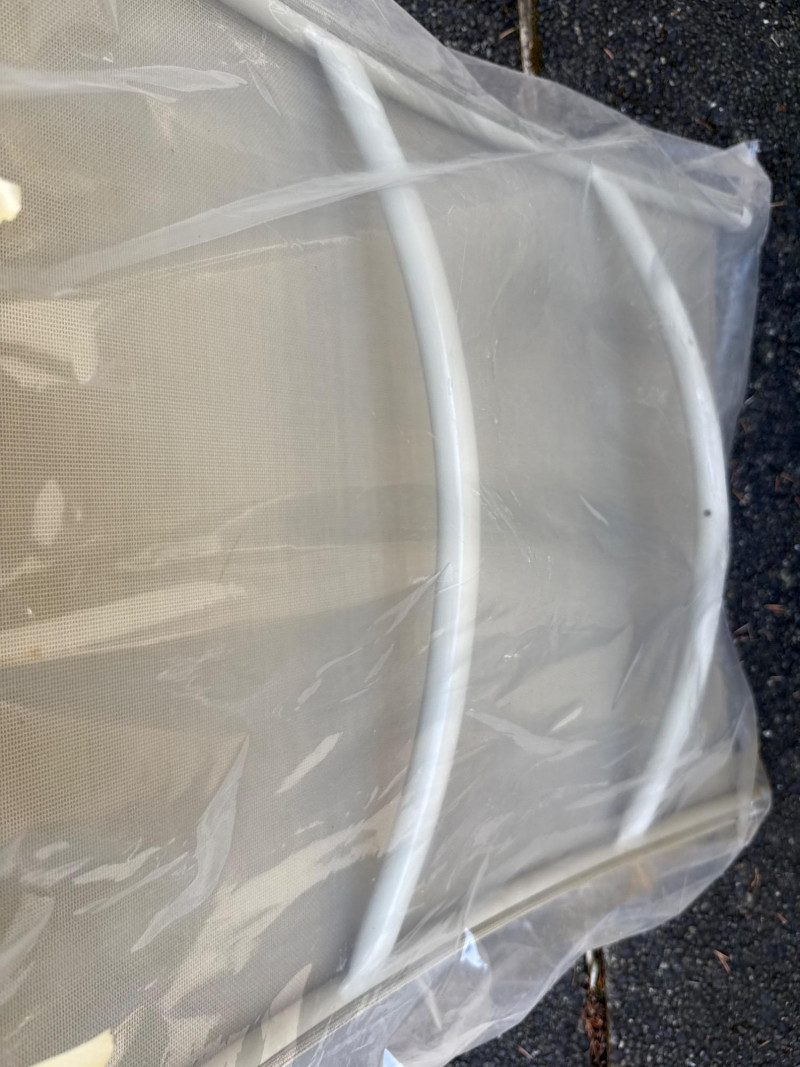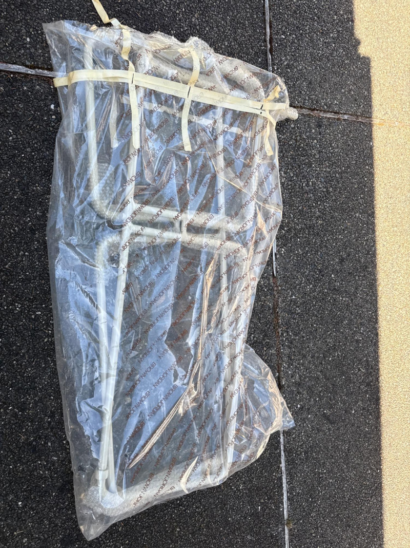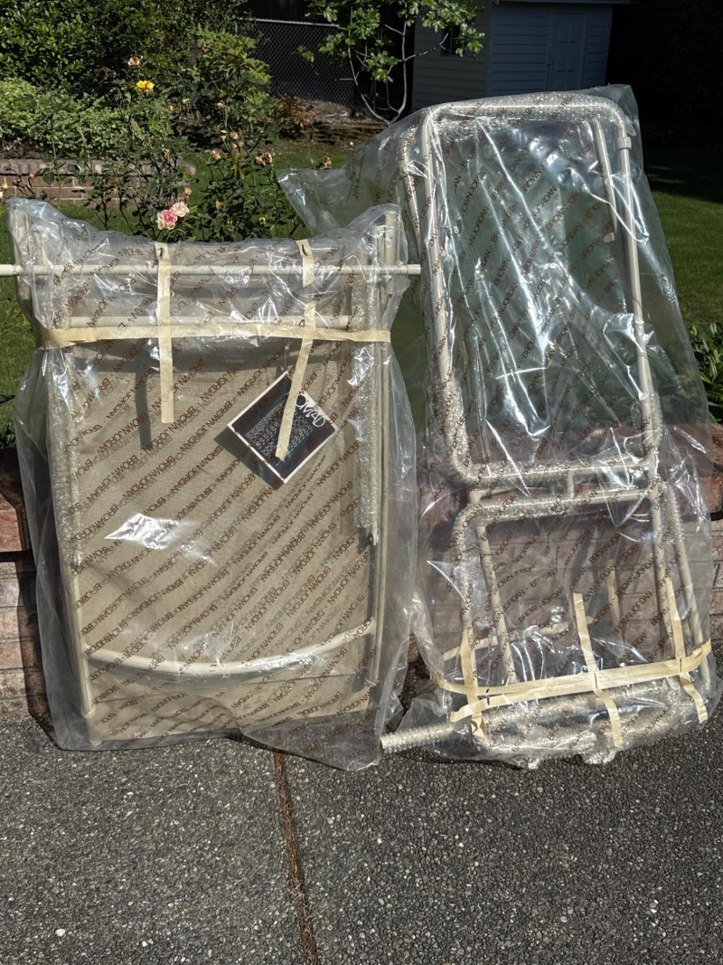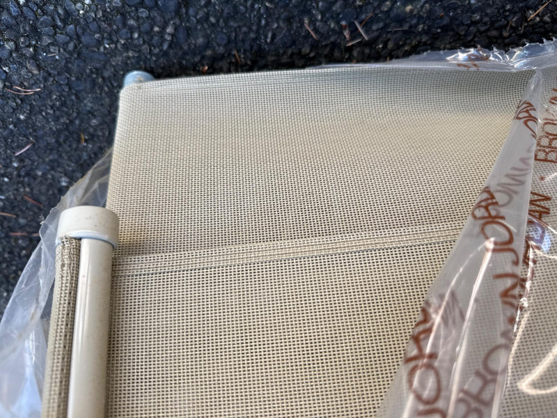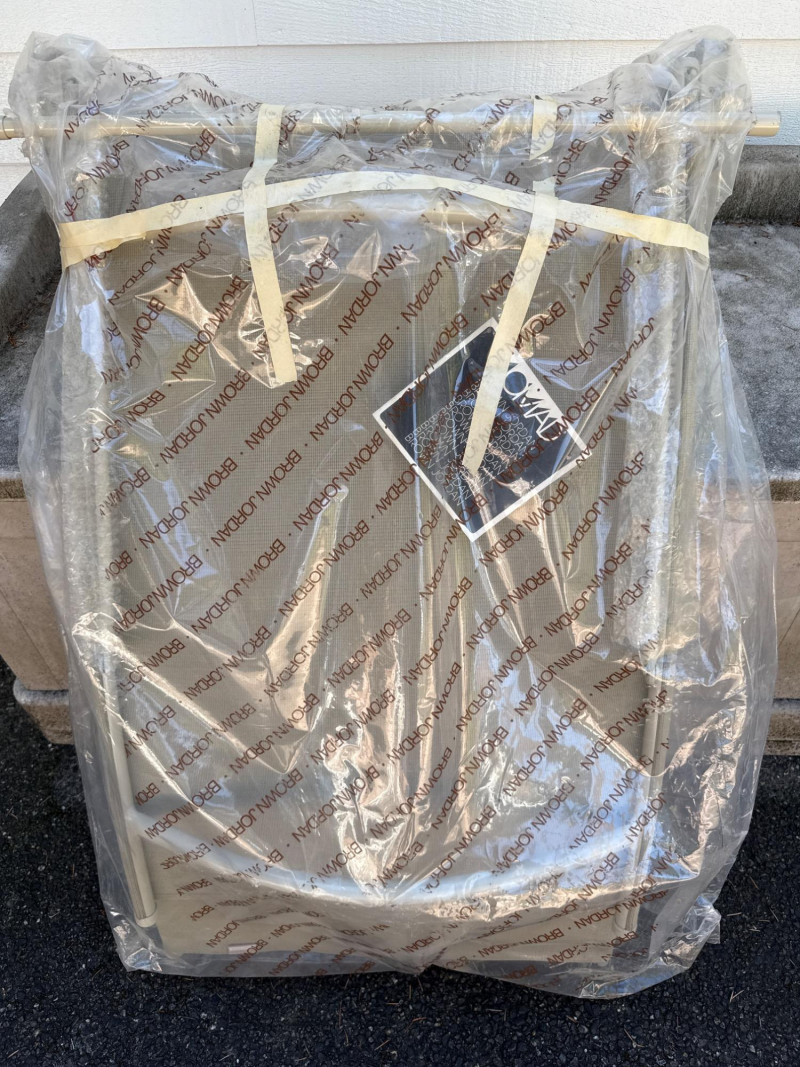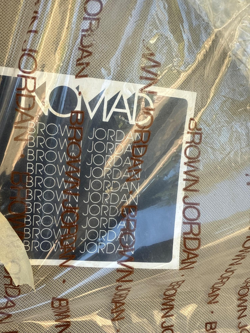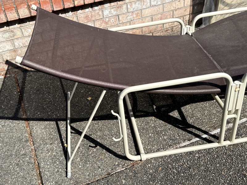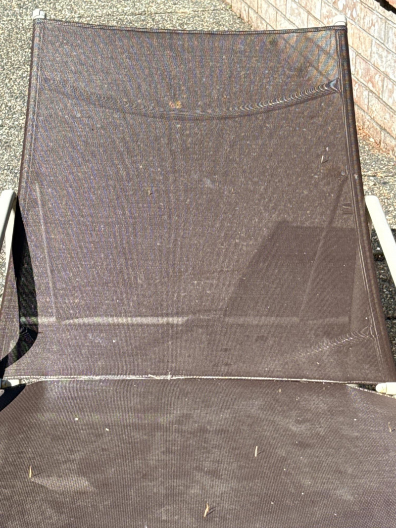 A sleek and functional trio of Brown Jordan-style patio lounge chairs featuring curved metal frames and ergonomic mesh seating. Two chairs are new and still wrapped in protective plastic—one without fabric—and the third has been used outdoors, showing light age but retaining good fabric condition. Ideal for poolside relaxation, garden staging, or resale to fans of classic outdoor furniture. Quantity: 3 lounge chairs 2 new (1 with fabric, 1 without) 1 used (fabric in good condition) Frame: Brown metal with curved ergonomic design Style: Mesh sunbed with reclined contour Category: Outdoor Items Length: 73" Width: 25" Height: 17.5" Item Details
