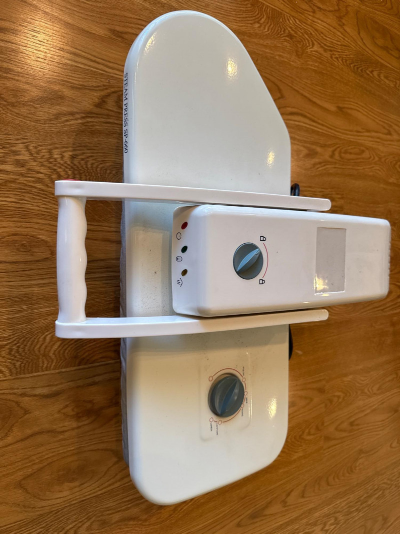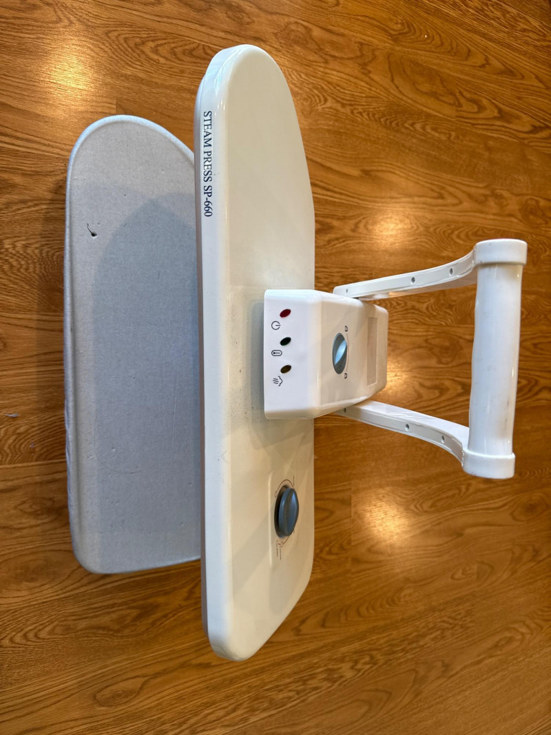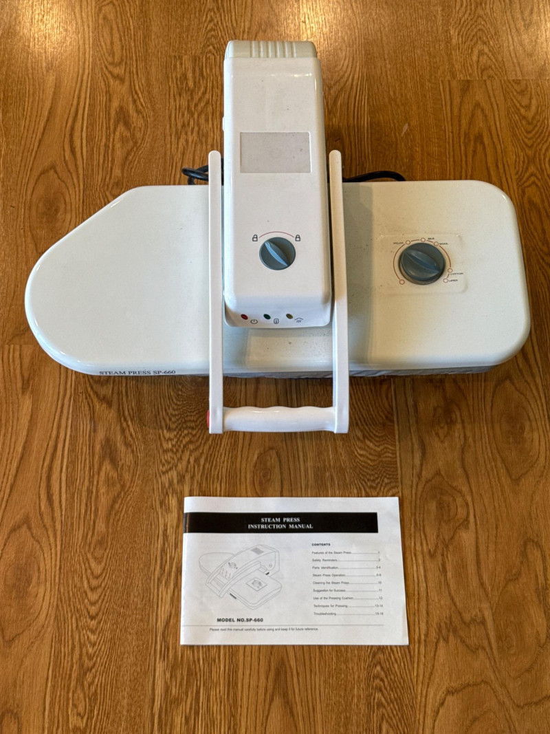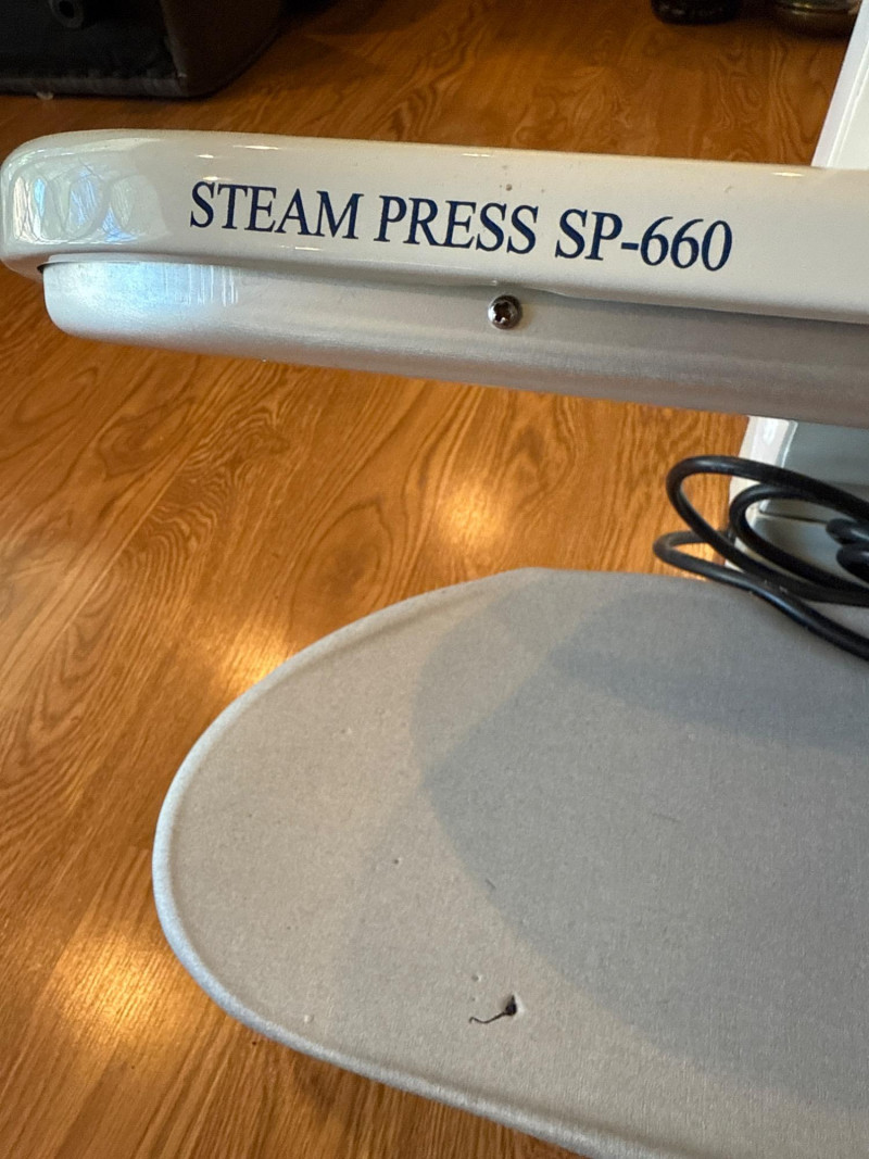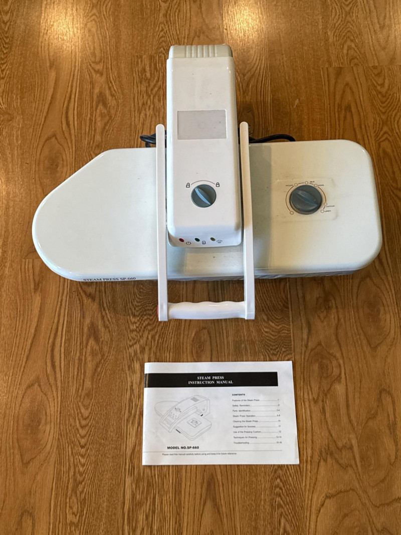 A practical and space-saving electric steam press, model SP-660, designed for efficient garment care. This unit features a control panel with dial and buttons, ergonomic handle, and a wide pressing surface—ideal for home use or resale to DIY laundry enthusiasts. Includes original instruction manual with safety, maintenance, and troubleshooting sections. Model: SP-660 Includes: Steam press unit + instruction manual Category: General / Appliances Powered up Item Details