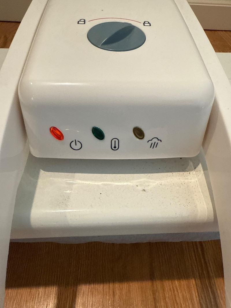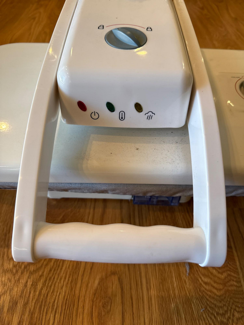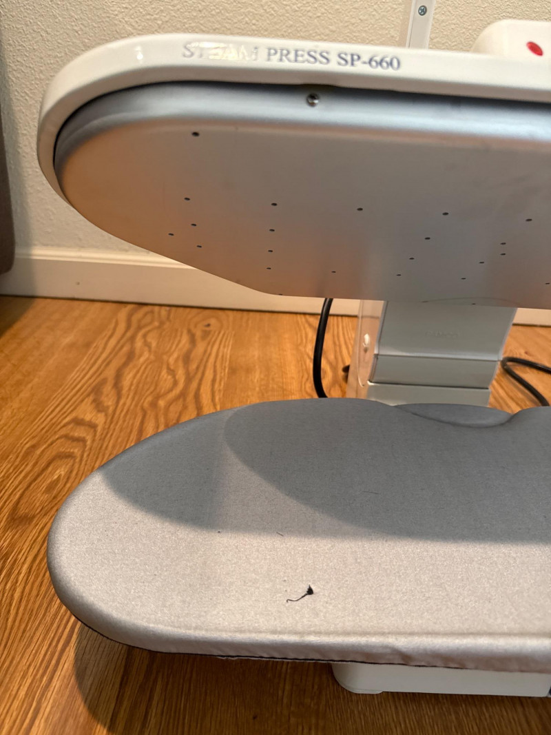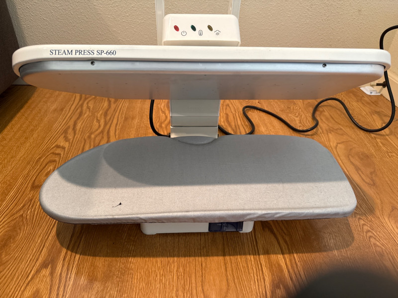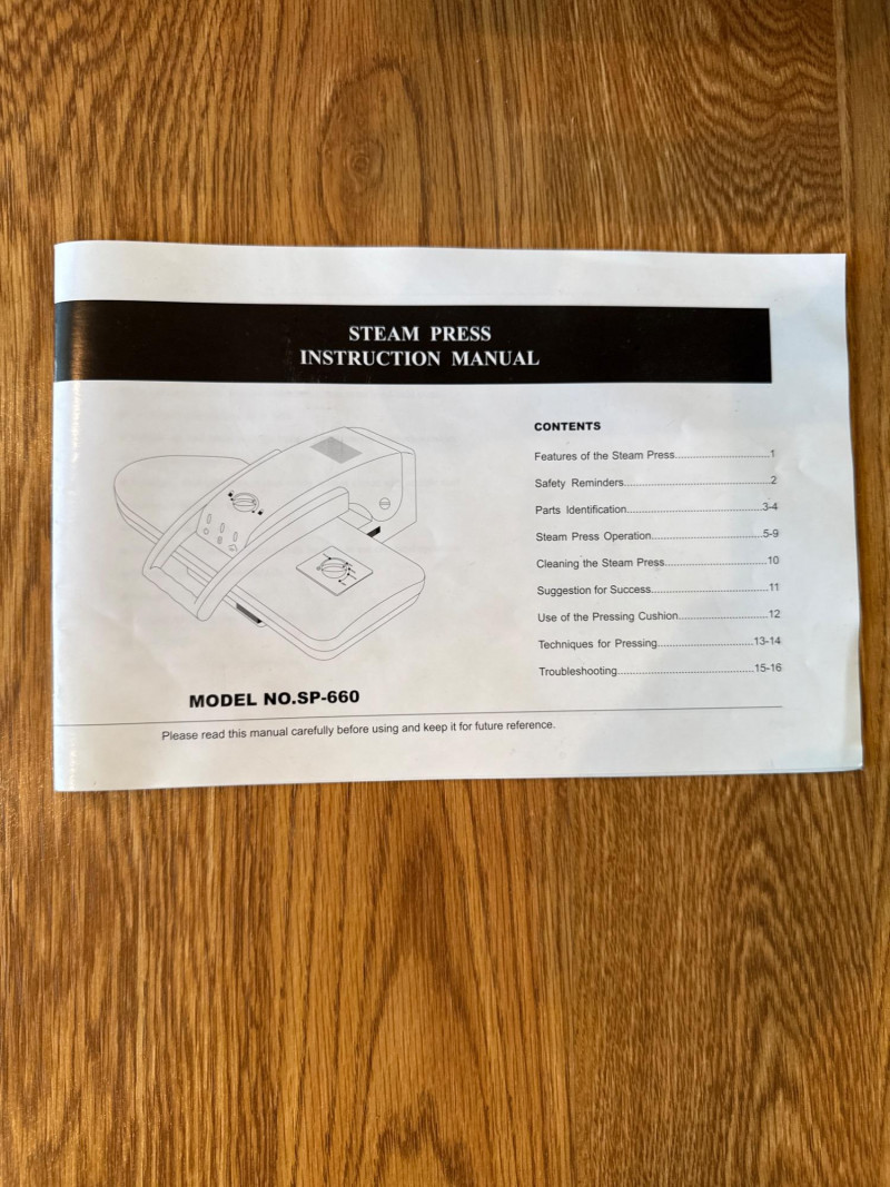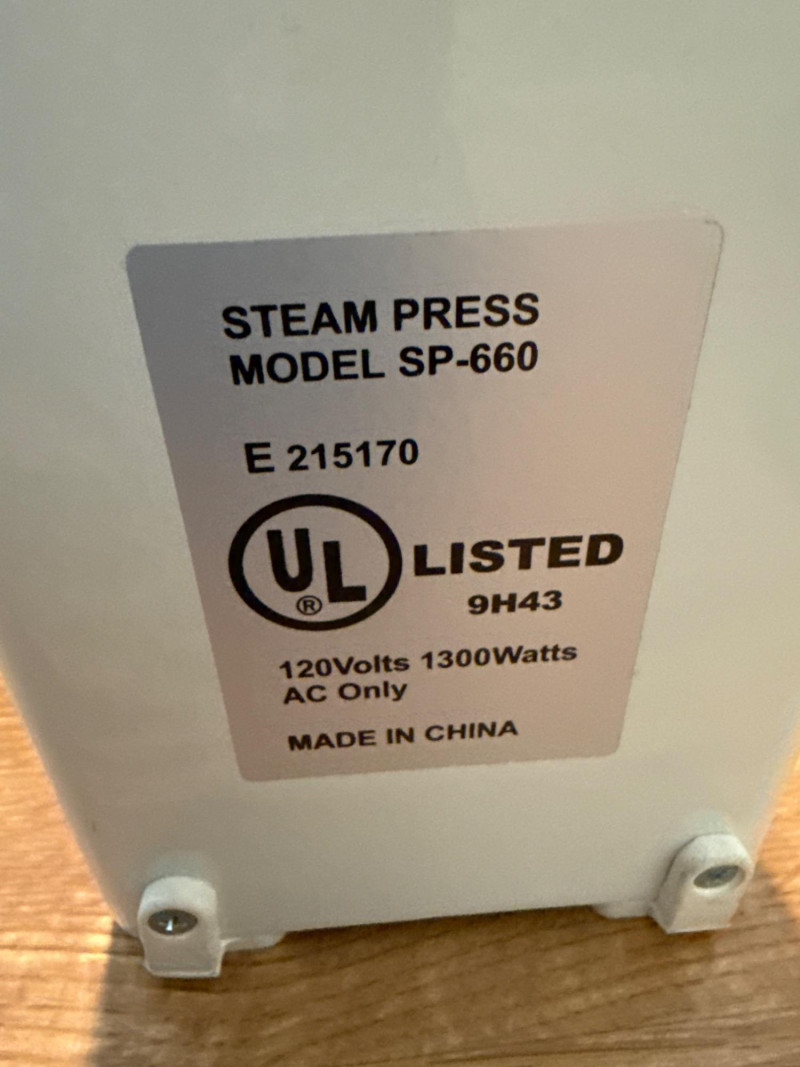 A practical and space-saving electric steam press, model SP-660, designed for efficient garment care. This unit features a control panel with dial and buttons, ergonomic handle, and a wide pressing surface—ideal for home use or resale to DIY laundry enthusiasts. Includes original instruction manual with safety, maintenance, and troubleshooting sections. Model: SP-660 Includes: Steam press unit + instruction manual Category: General / Appliances Powered up Item Details