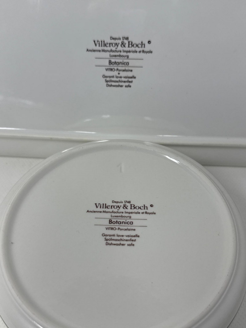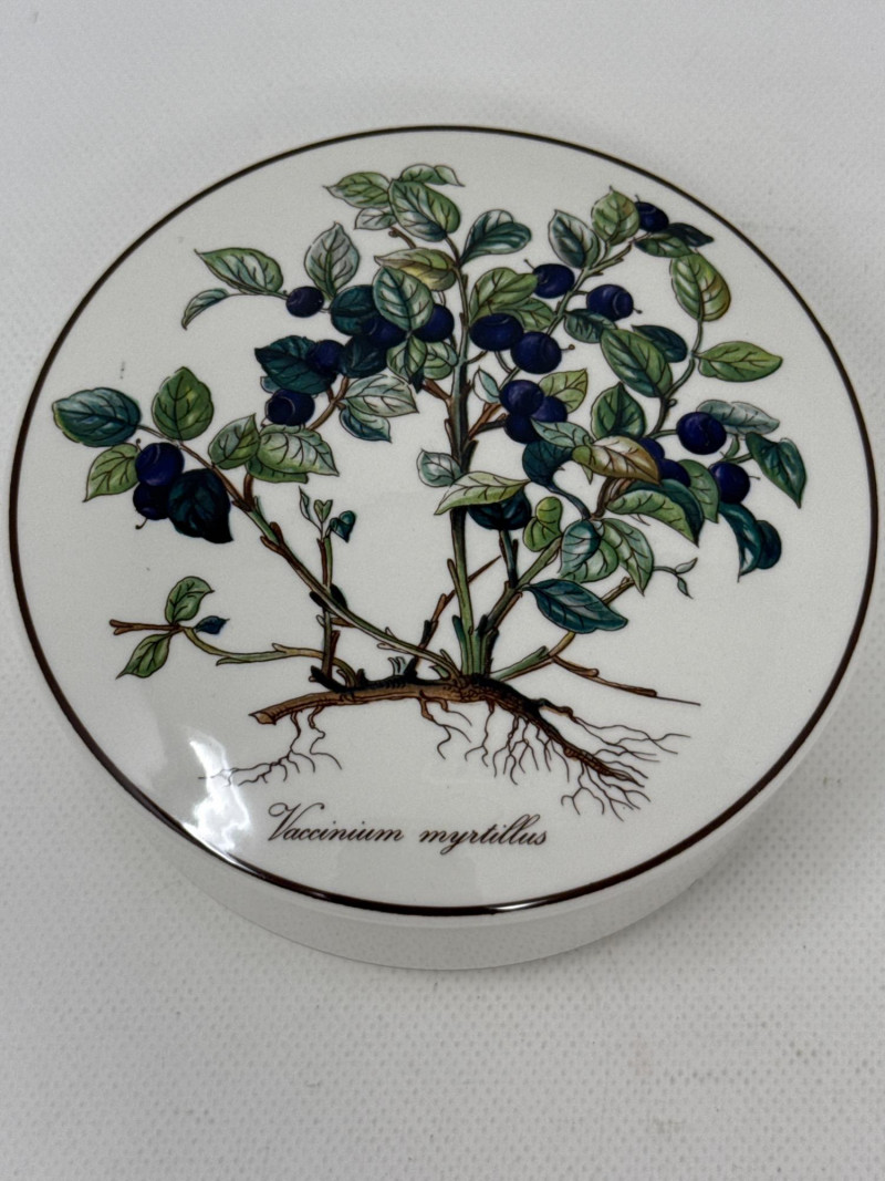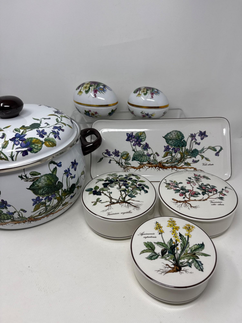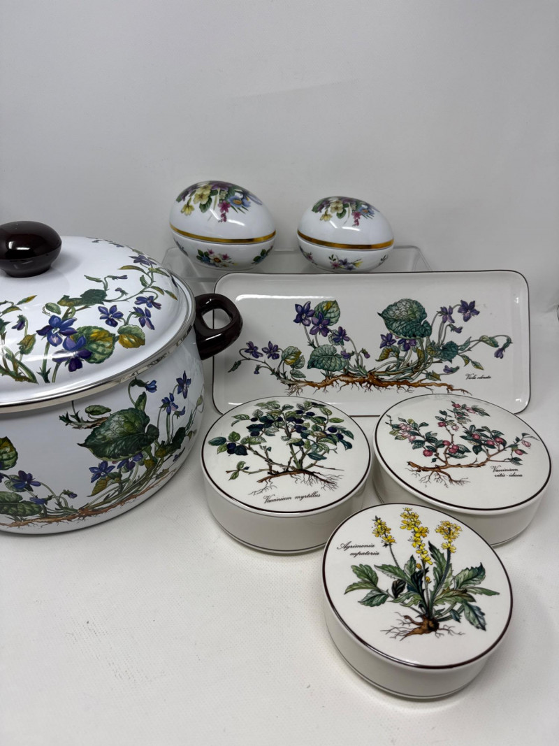 A beautifully illustrated 7-piece collection from Villeroy & Boch’s “Botanica” line, featuring vibrant botanical artwork and Latin plant names. This set includes a large lidded pot, rectangular serving tray, two egg-shaped trinket boxes, and three round covered containers—all adorned with detailed florals like Viola odorata, Primula veris, Digitalis purpurea, and Hydrangea hortensis. Ideal for collectors, decorators, or resale pros seeking elegant European ceramics with scientific charm. Large Lidded Pot – 9.5" H × 13" W Rectangular Tray – 13.5" L × 6" W Round Covered Containers (3) – 6" W × 2.25" H; smallest 5" W × 2" H Royal Bavaria Egg Boxes (2) – 5" H × 5" L and 4" H × 4" LSet Includes