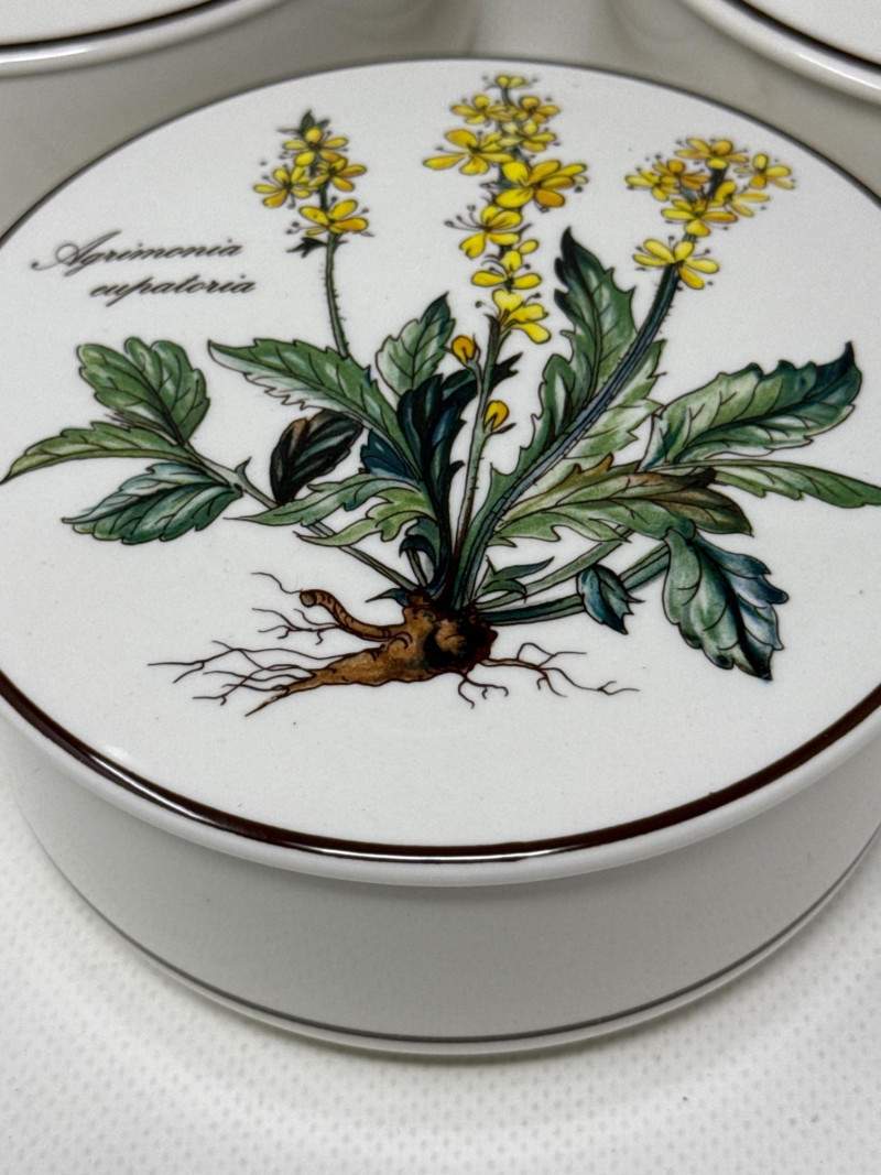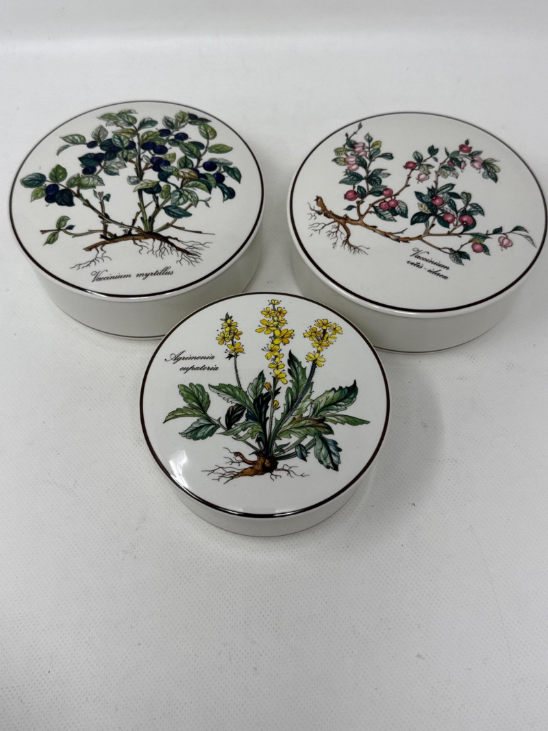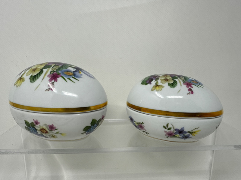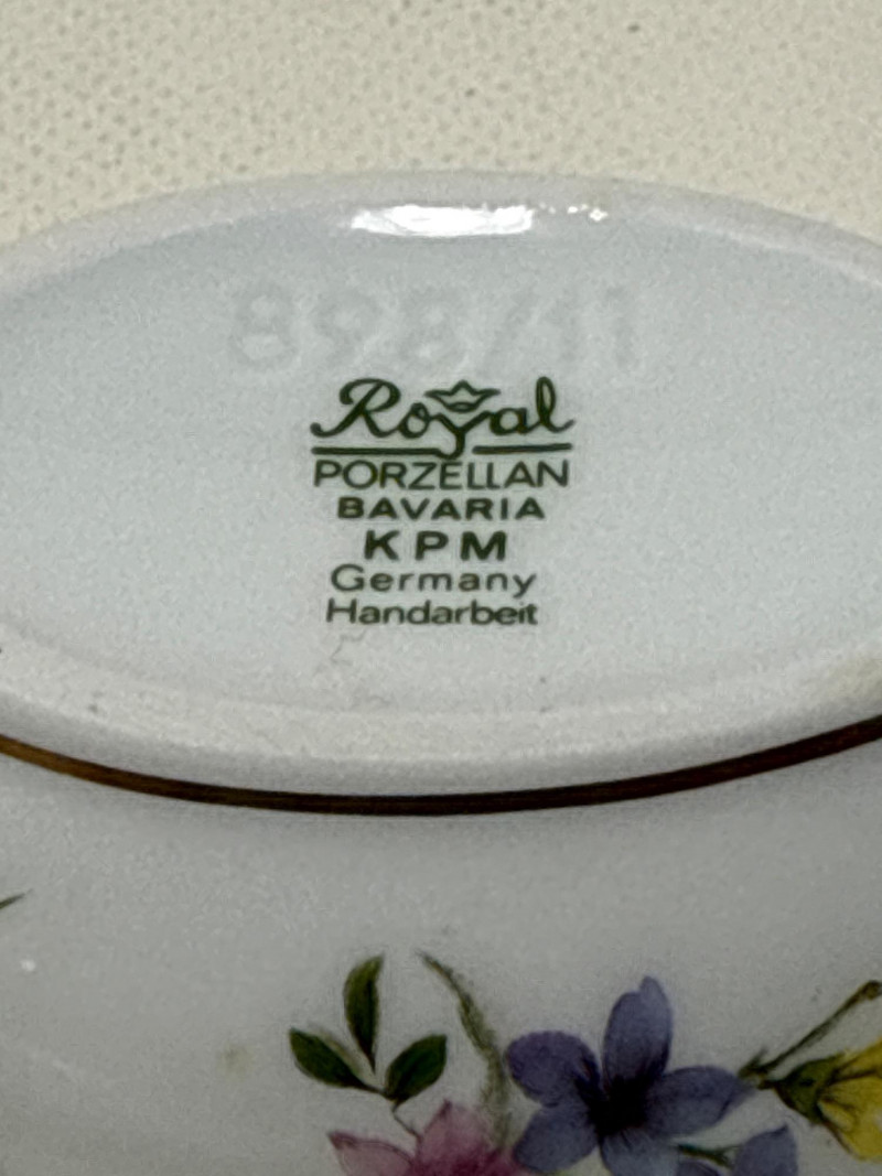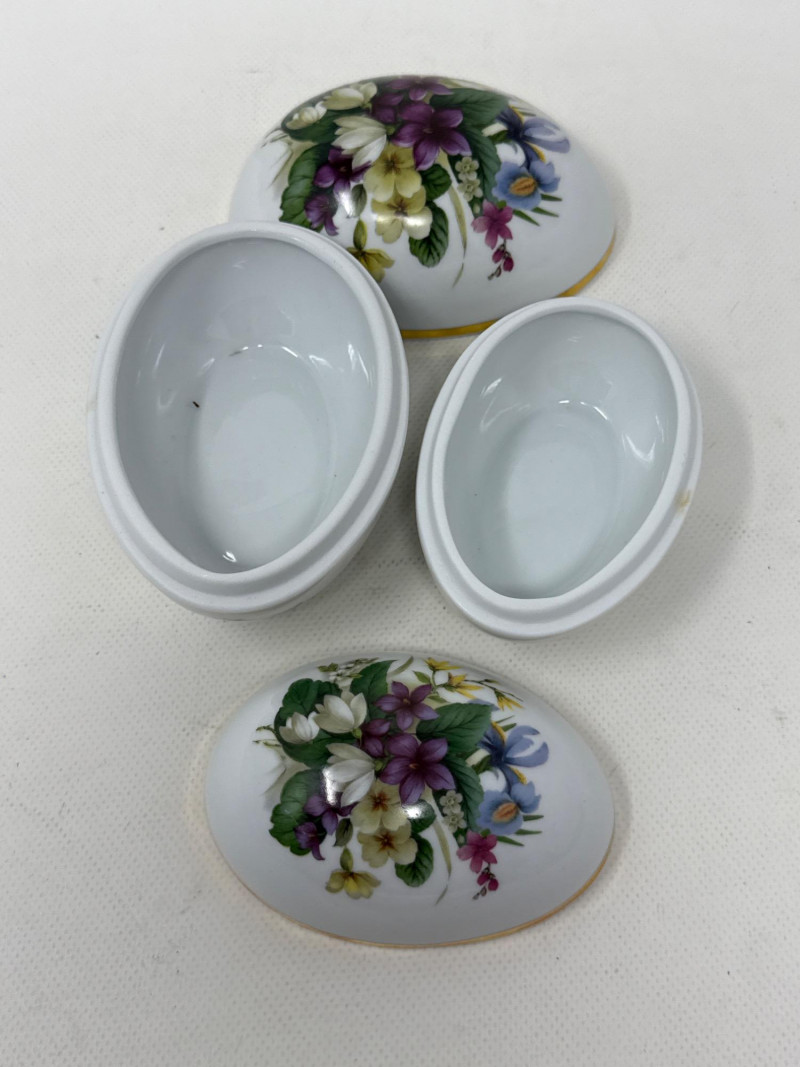 A beautifully illustrated 7-piece collection from Villeroy & Boch’s “Botanica” line, featuring vibrant botanical artwork and Latin plant names. This set includes a large lidded pot, rectangular serving tray, two egg-shaped trinket boxes, and three round covered containers—all adorned with detailed florals like Viola odorata, Primula veris, Digitalis purpurea, and Hydrangea hortensis. Ideal for collectors, decorators, or resale pros seeking elegant European ceramics with scientific charm. Large Lidded Pot – 9.5" H × 13" W Rectangular Tray – 13.5" L × 6" W Round Covered Containers (3) – 6" W × 2.25" H; smallest 5" W × 2" H Royal Bavaria Egg Boxes (2) – 5" H × 5" L and 4" H × 4" LSet Includes