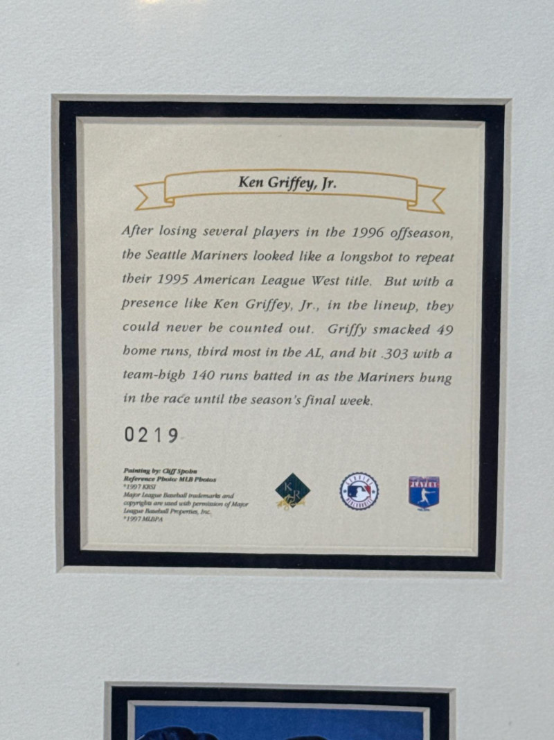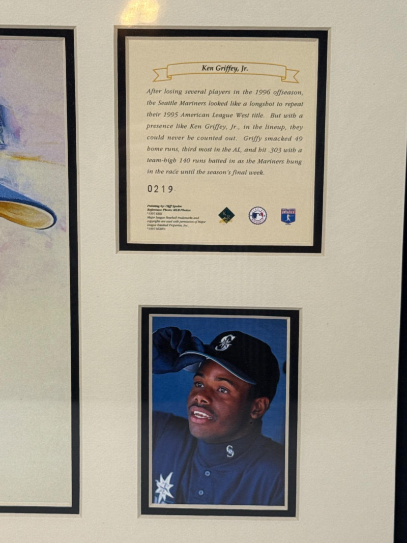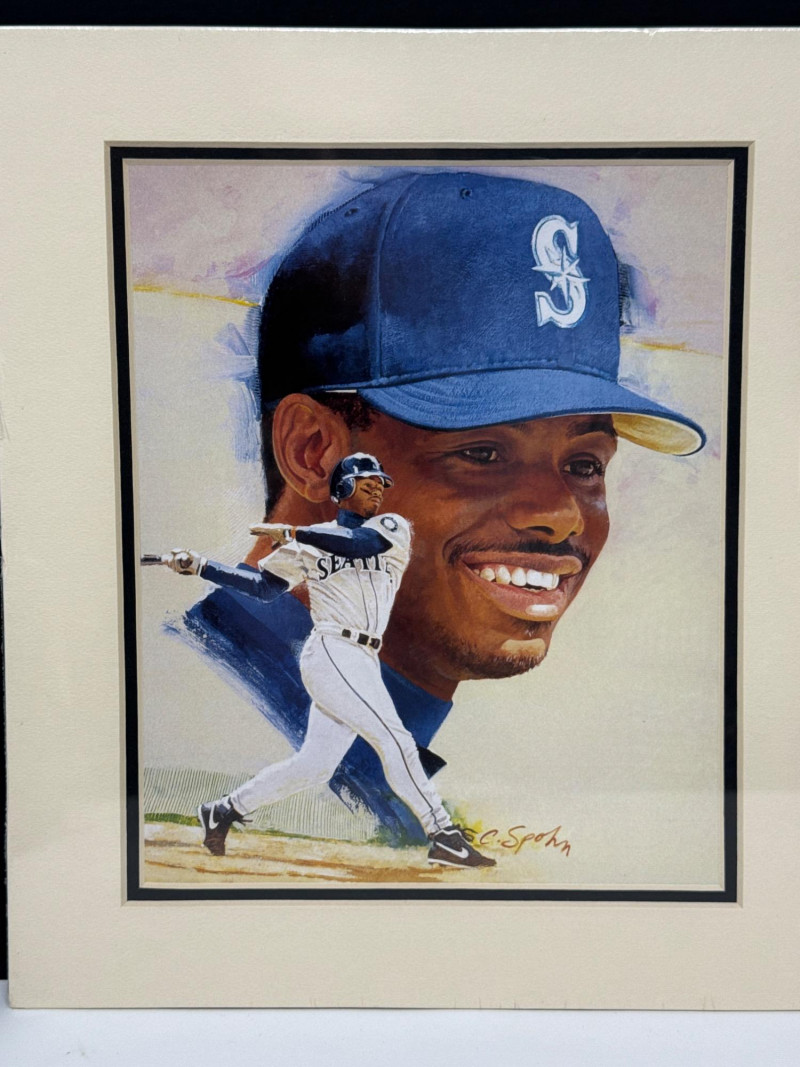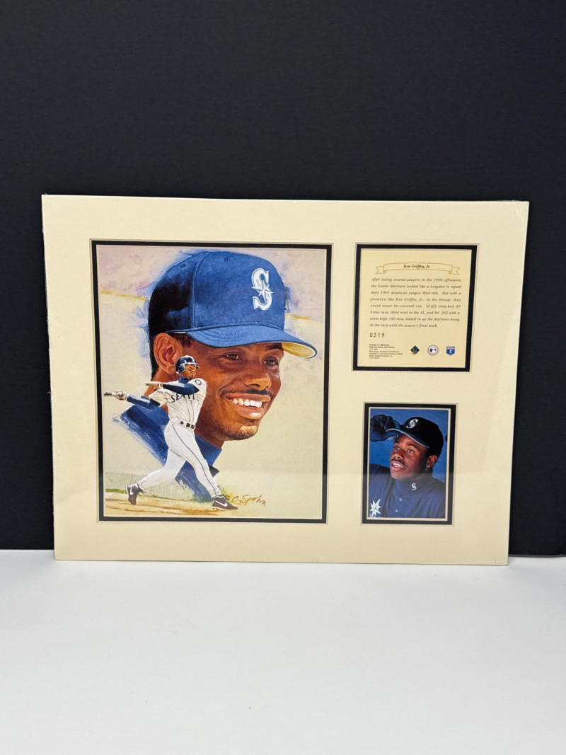 Ken Griffey Jr Seattle Mariners Art & Starting Lineup Action Figurine Art (not framed, but in original protectant cellophane)- 11” x 14”