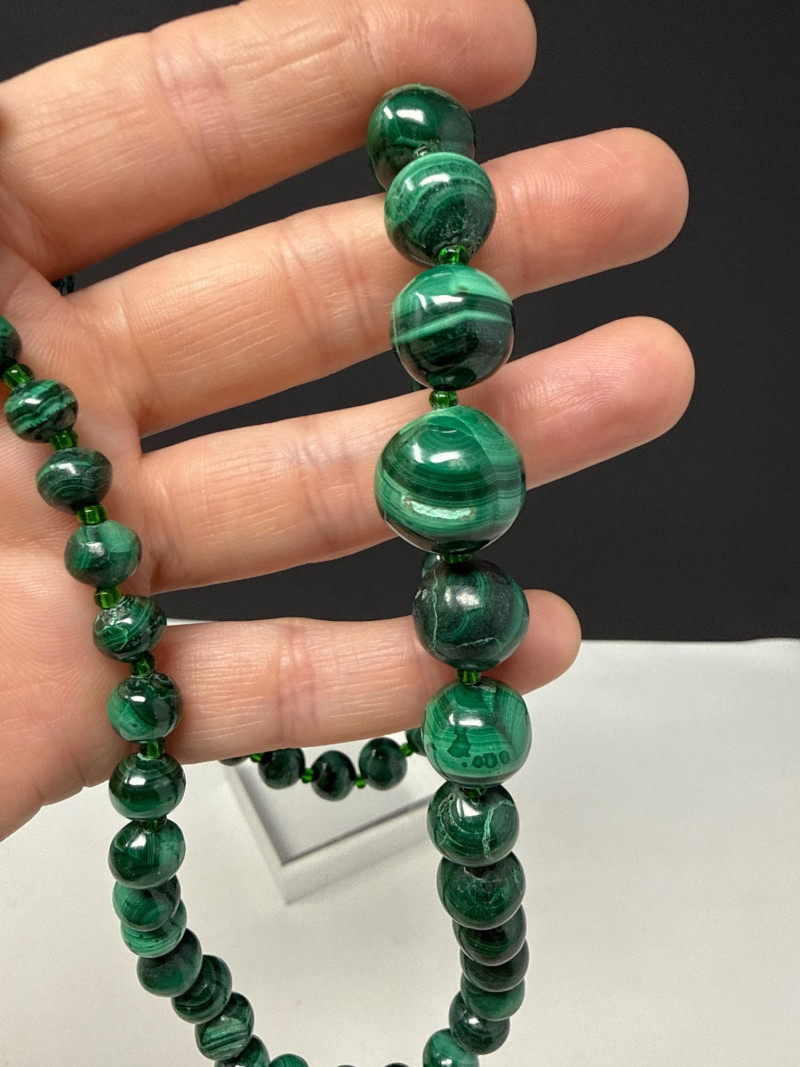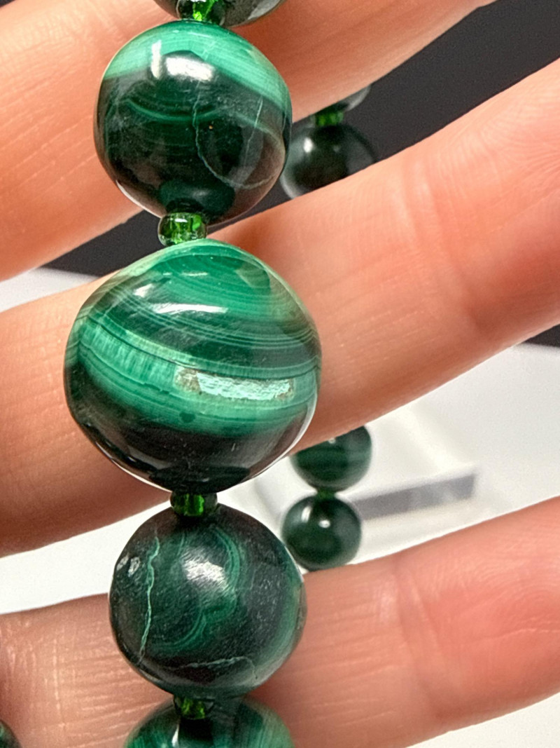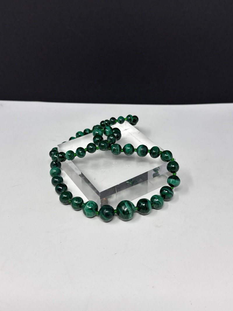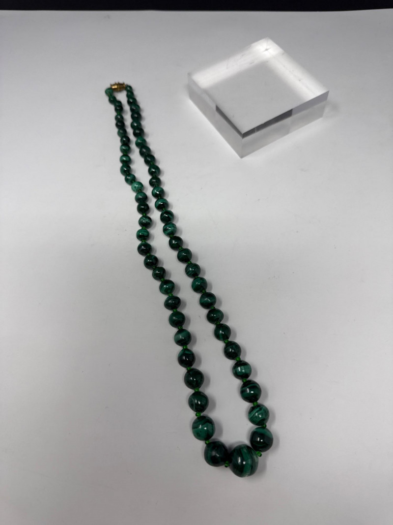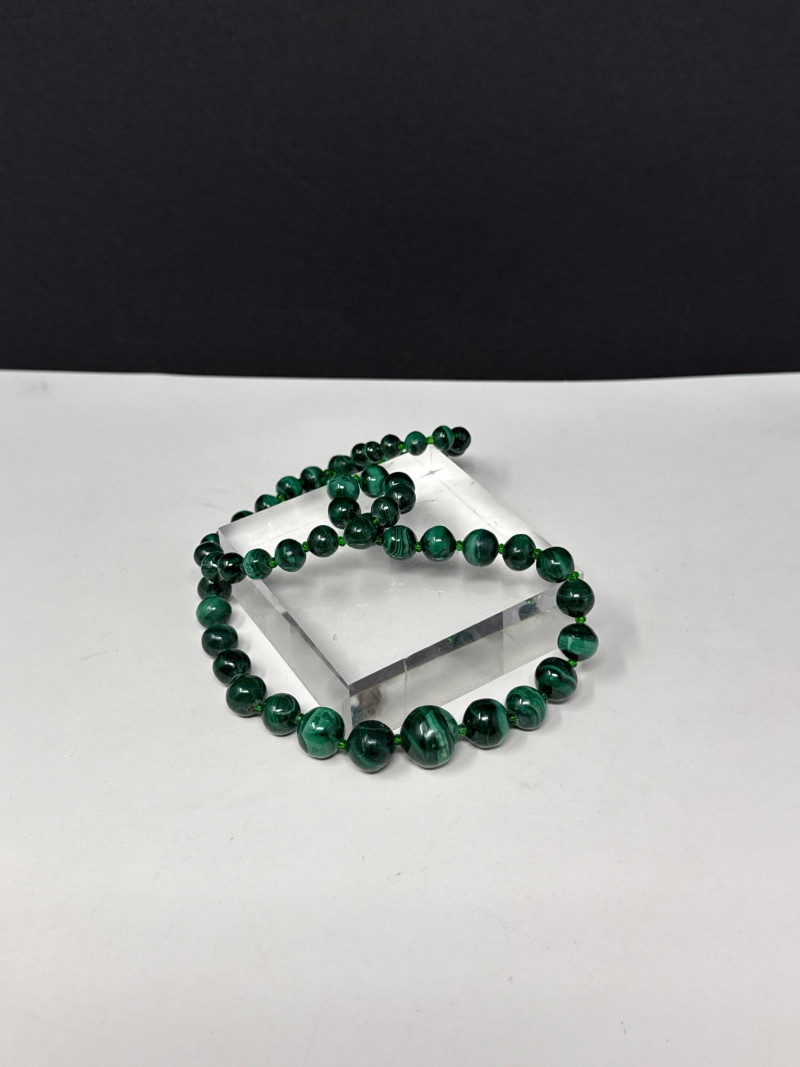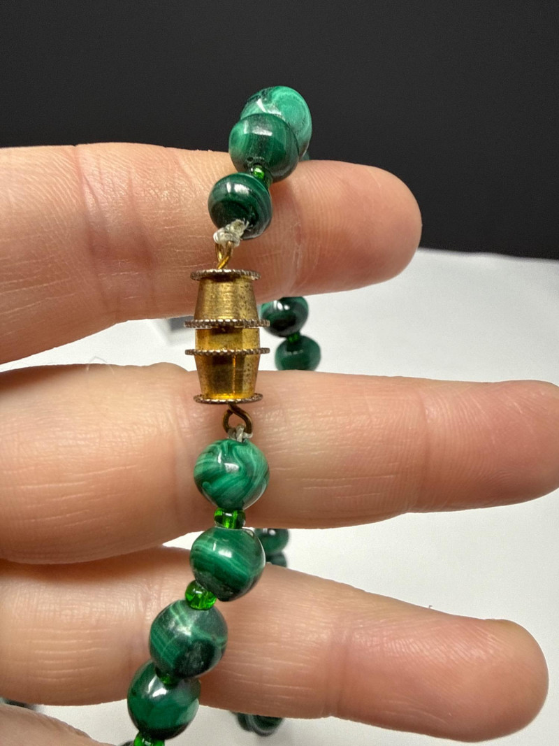 Malachite Necklace 25” long- unclasped *one bead seems either to have a mar, or chip? please see third from last photo