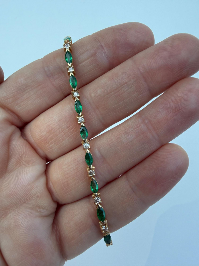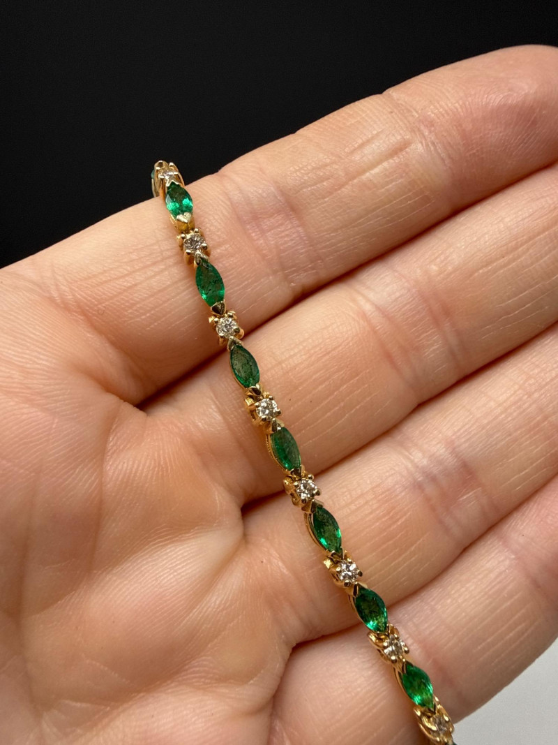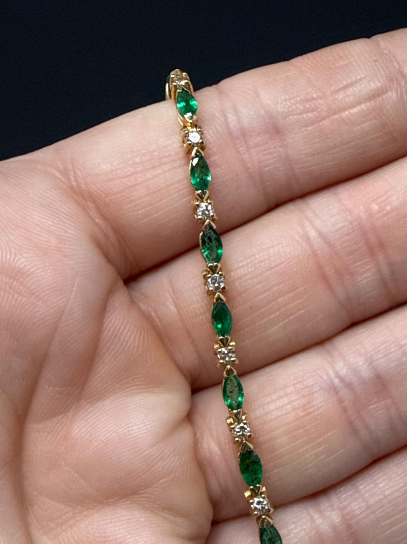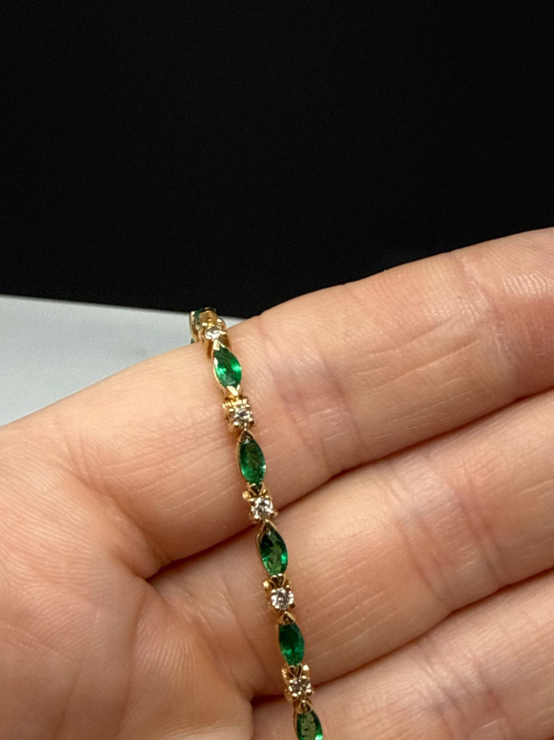 Vintage 14K Yellow Gold Emerald Navette & Round Diamond Bracelet- 9g Beautiful & in great shape 8” Long