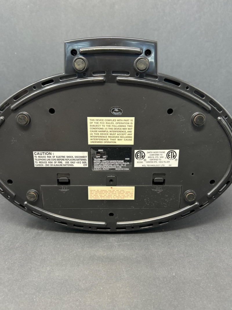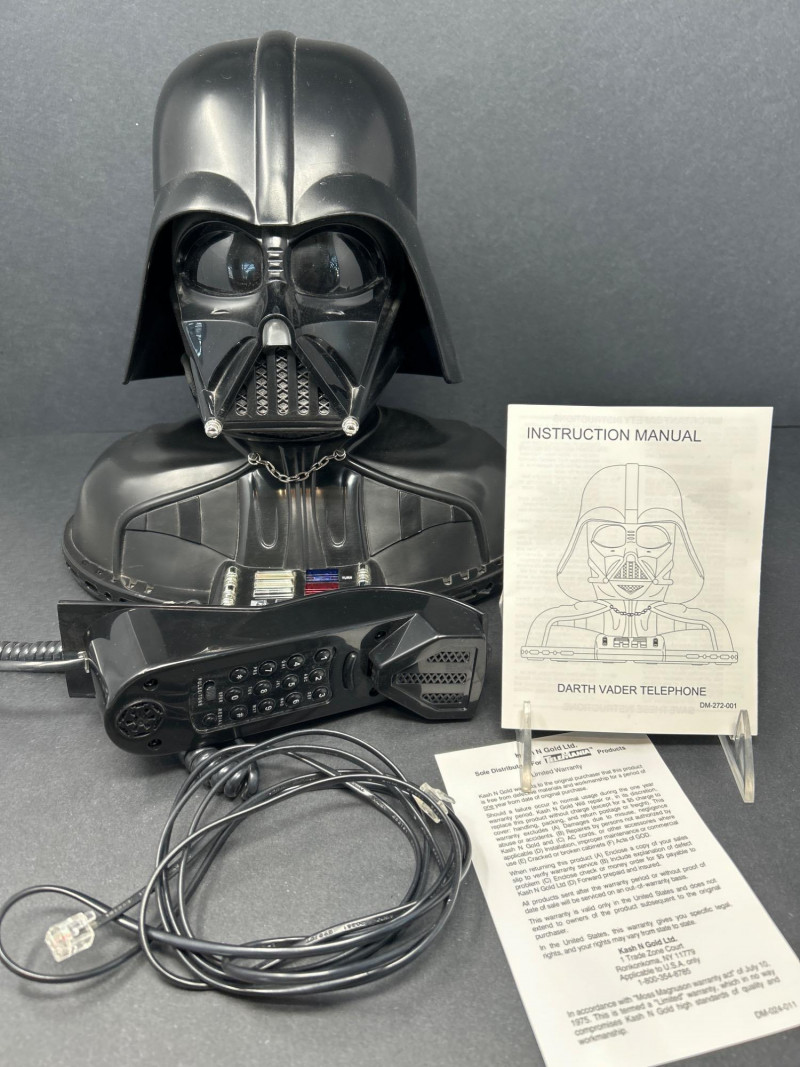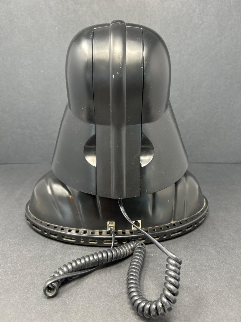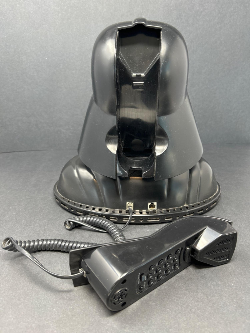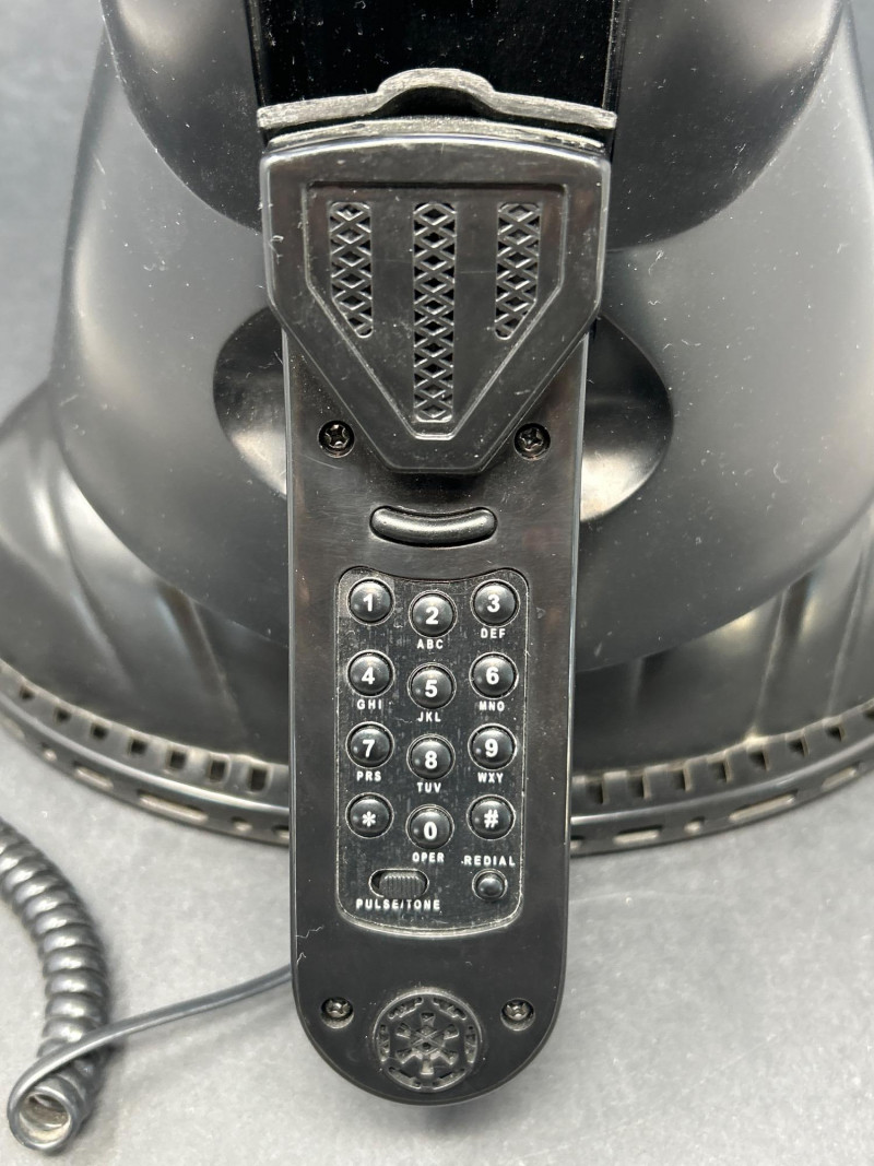 Command attention with this TELEMANIA™ Darth Vader corded landline telephone, a striking fusion of sci-fi iconography and retro tech. Modeled after the Sith Lord’s helmet, this novelty phone doubles as a functional landline device and a bold display piece for any Star Wars aficionado. Specifications: Model: Darth Vader Phone Manufacturer: TELEMANIA™ FCC Compliance: Part 68 FCC Rules FCC ID: EMWCWHN-61762-TE-E Ringer Equivalence: 1.1B U.S.O.C Jack Type: RJ11C Country of Origin: Made in China Dial Type: Push-button keypad concealed beneath handset Connection: (untested) Provenance & Notes: