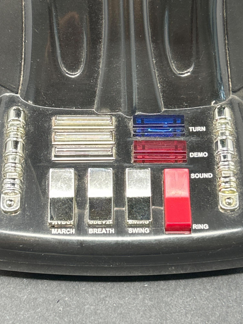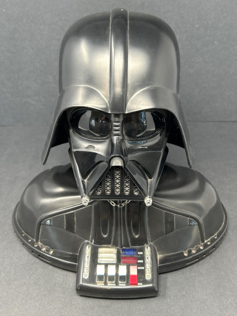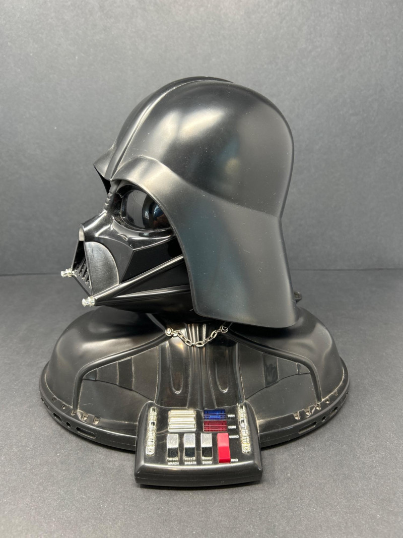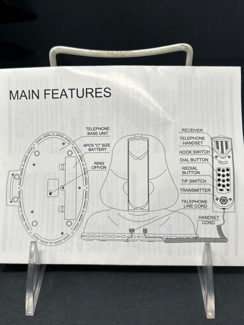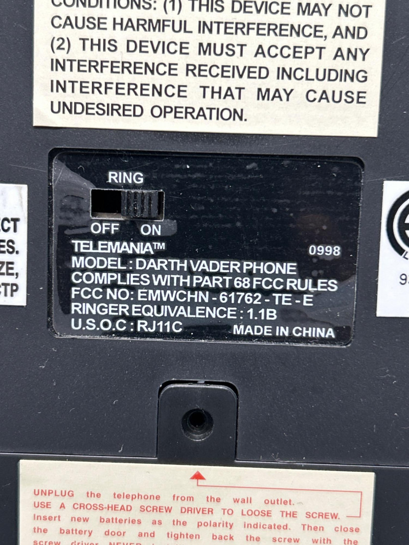 Command attention with this TELEMANIA™ Darth Vader corded landline telephone, a striking fusion of sci-fi iconography and retro tech. Modeled after the Sith Lord’s helmet, this novelty phone doubles as a functional landline device and a bold display piece for any Star Wars aficionado. Specifications: Model: Darth Vader Phone Manufacturer: TELEMANIA™ FCC Compliance: Part 68 FCC Rules FCC ID: EMWCWHN-61762-TE-E Ringer Equivalence: 1.1B U.S.O.C Jack Type: RJ11C Country of Origin: Made in China Dial Type: Push-button keypad concealed beneath handset Connection: (untested) Provenance & Notes: