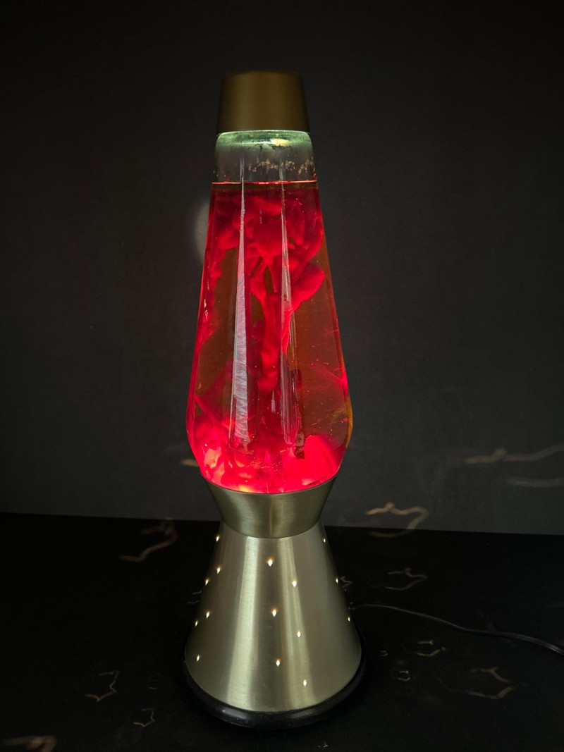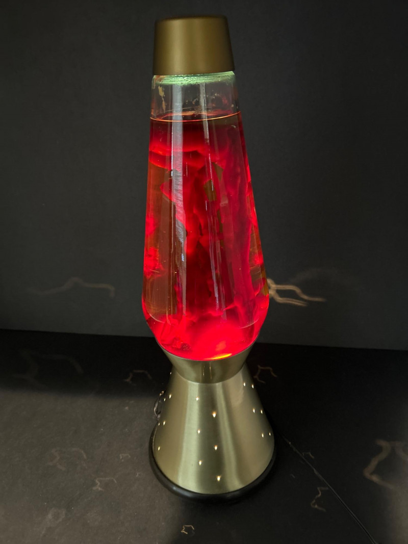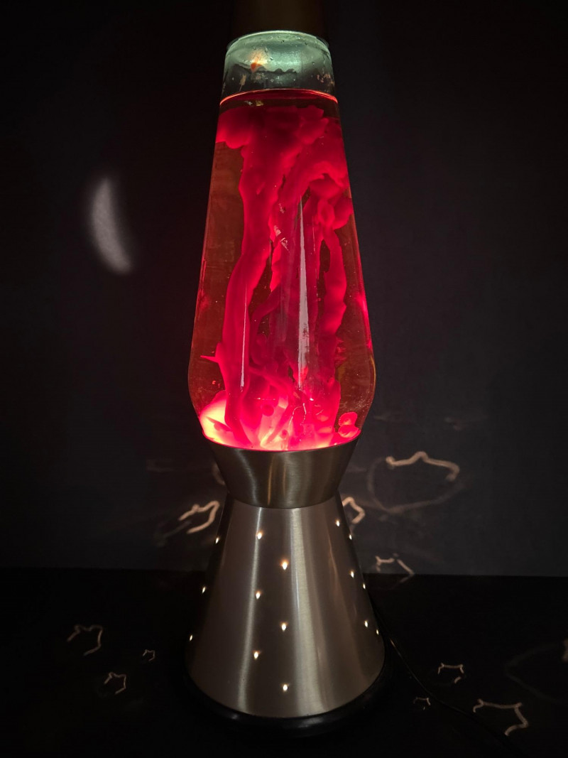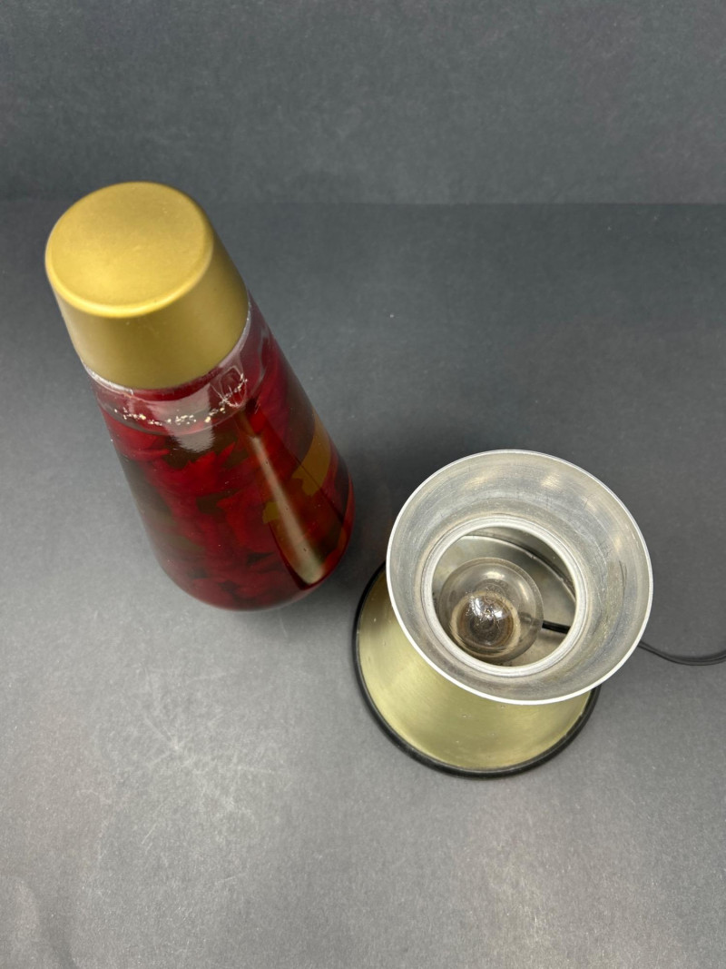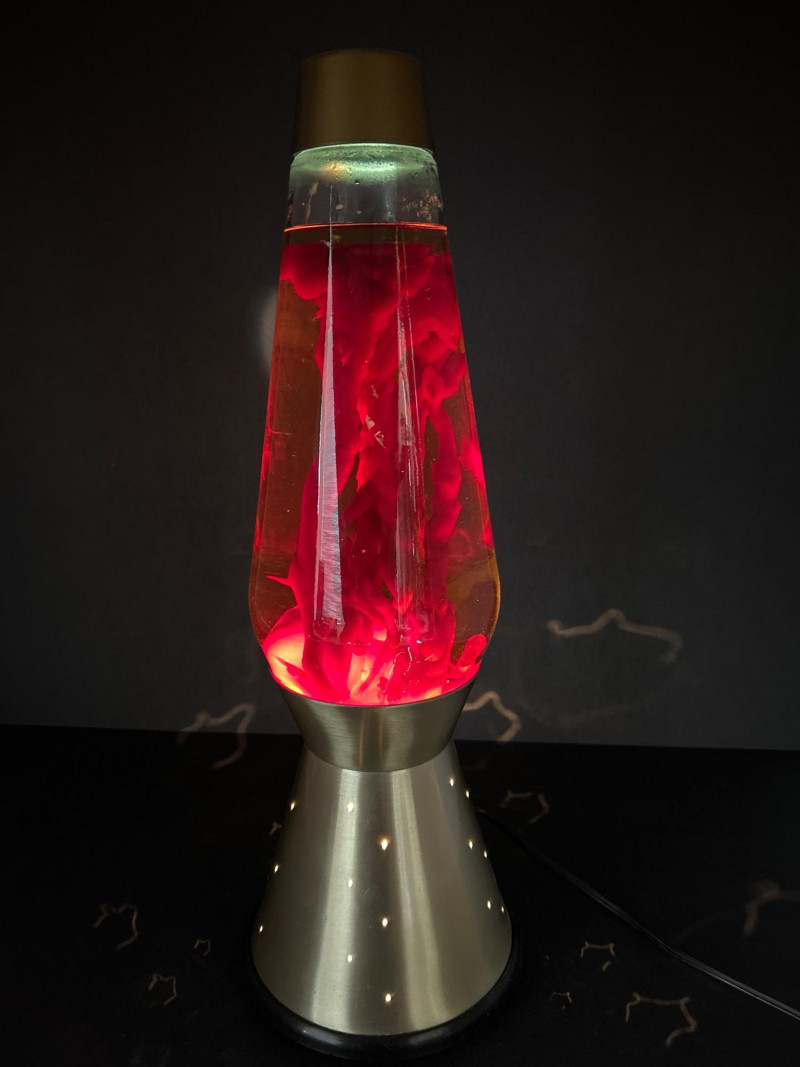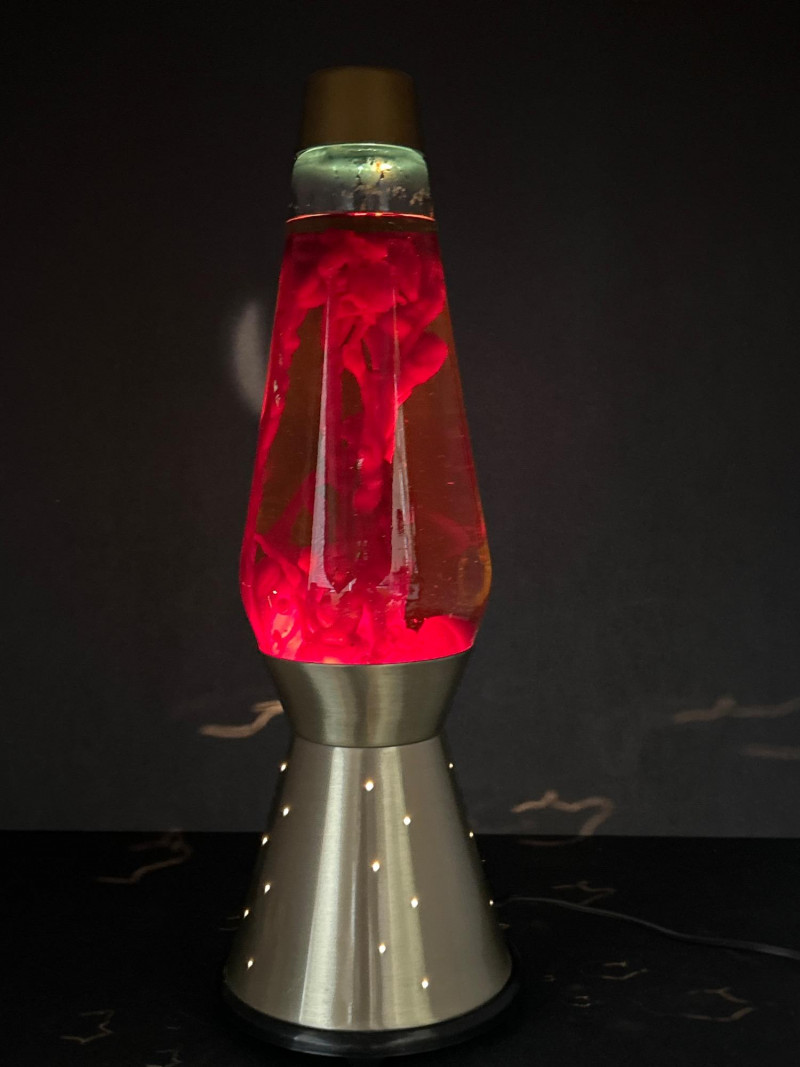 A captivating mid-century-style lava lamp, affectionately dubbed “Starlight” for its radiant glow and perforated metallic base that casts scattered light like stars. The brushed metal base and cap frame a clear glass vessel filled with vivid red wax, which forms mesmerizing organic shapes when heated—ideal for ambient lighting or nostalgic décor. Dimensions: Overall Height: 17 in Base: 7 in (H) × 6 in (Diameter) Glass Vessel: 11.5 in (H) Condition: