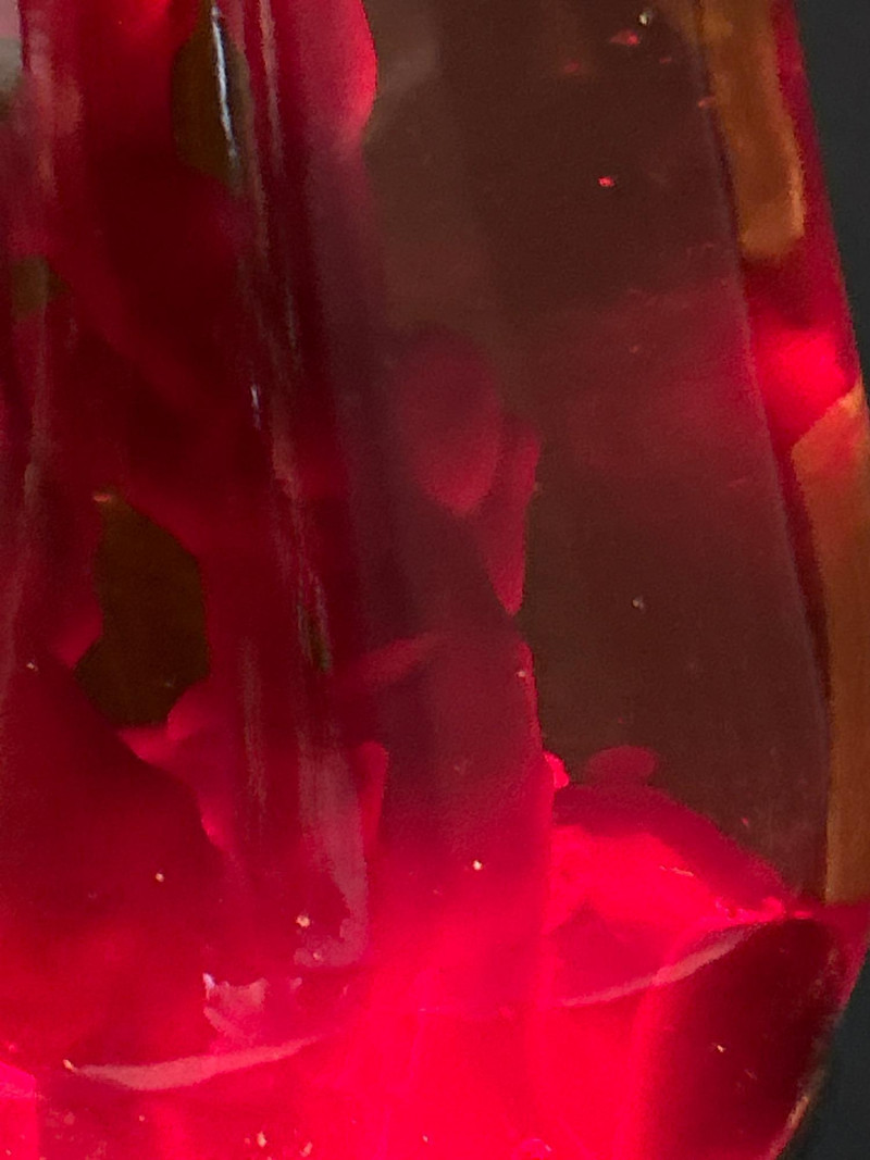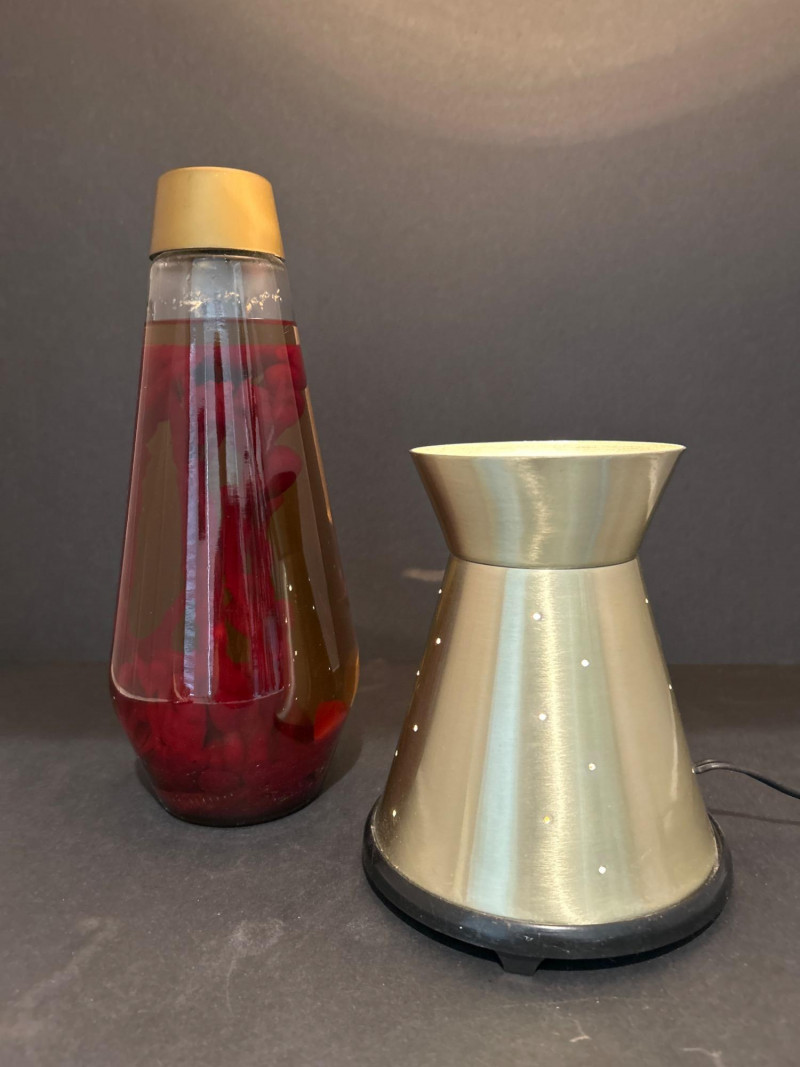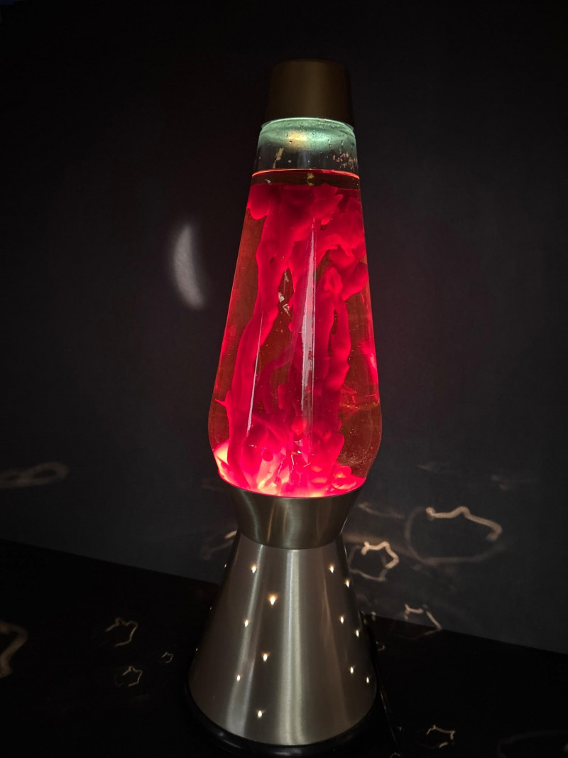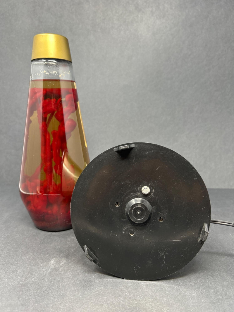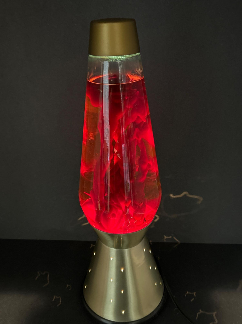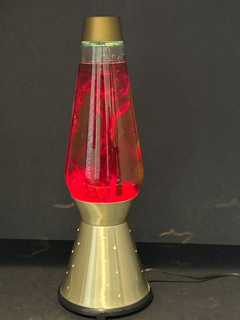 A captivating mid-century-style lava lamp, affectionately dubbed “Starlight” for its radiant glow and perforated metallic base that casts scattered light like stars. The brushed metal base and cap frame a clear glass vessel filled with vivid red wax, which forms mesmerizing organic shapes when heated—ideal for ambient lighting or nostalgic décor. Dimensions: Overall Height: 17 in Base: 7 in (H) × 6 in (Diameter) Glass Vessel: 11.5 in (H) Condition: