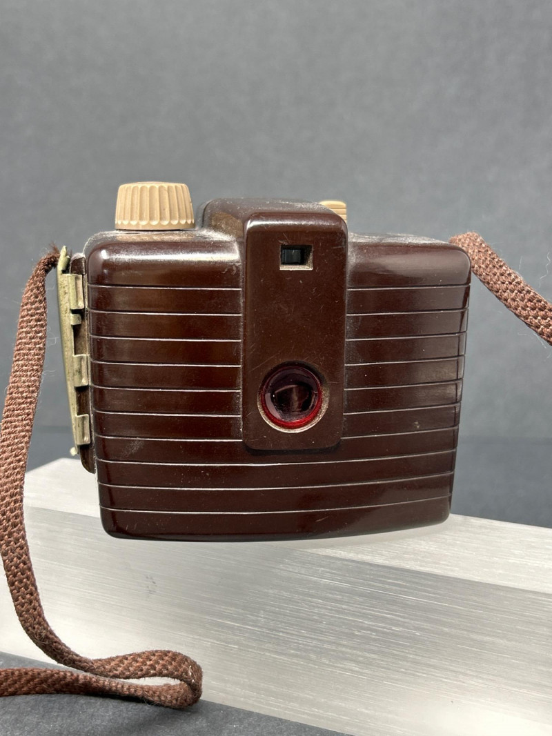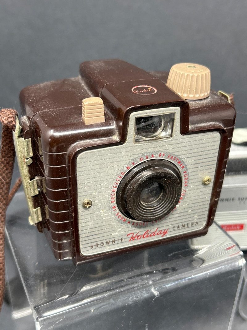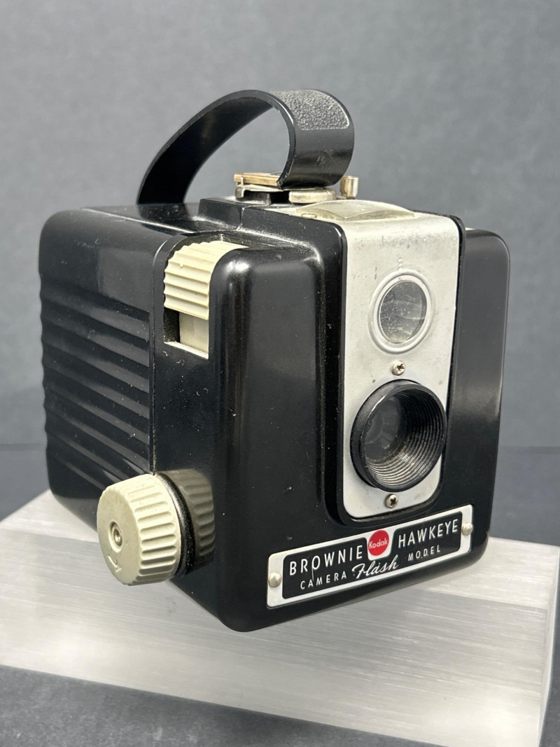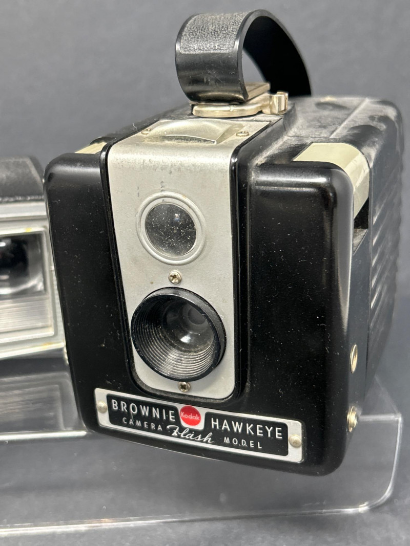 A nostalgic ensemble of five Kodak cameras spanning early 20th-century to mid-century design — ideal for collectors, decorators, or photography enthusiasts. This untested group showcases iconic materials and styling from Kodak’s golden era. Kodak Brownie Hawkeye Flash Model (c.1949–1961)