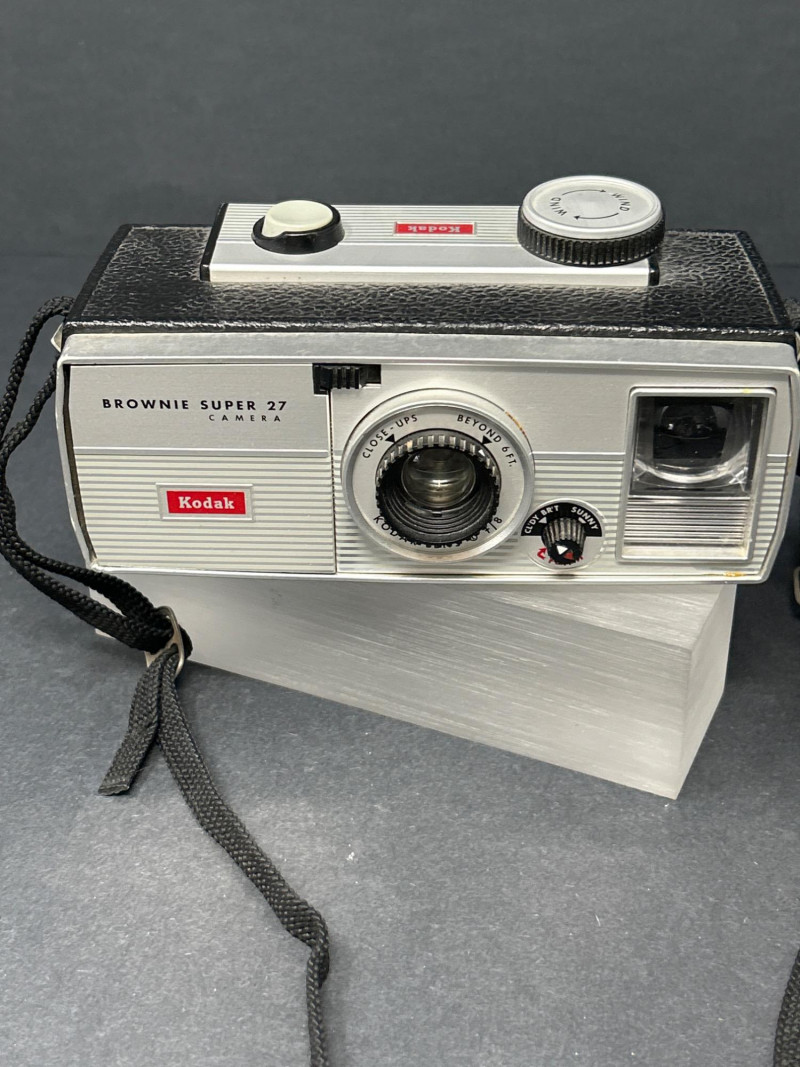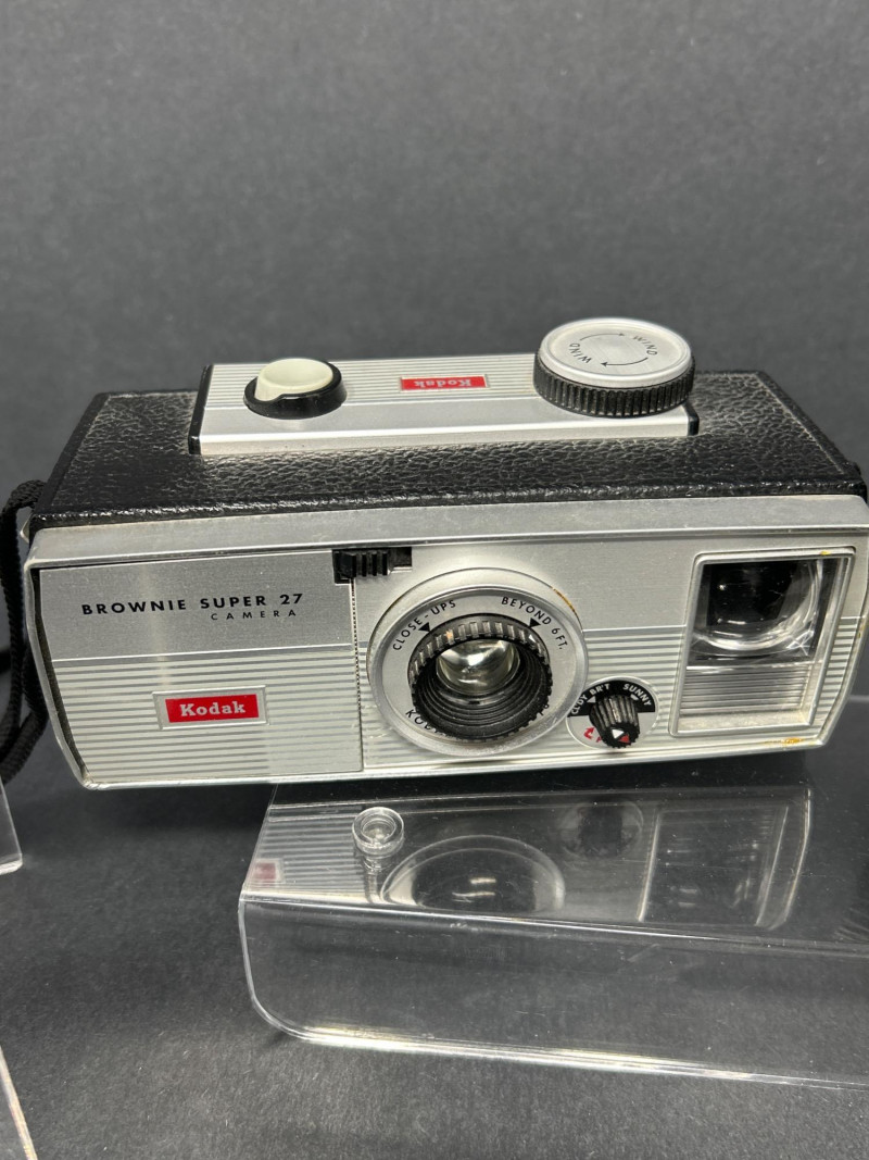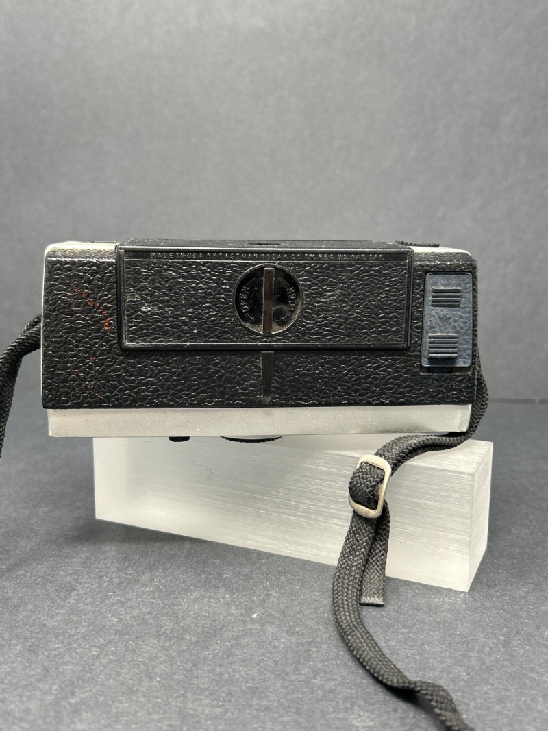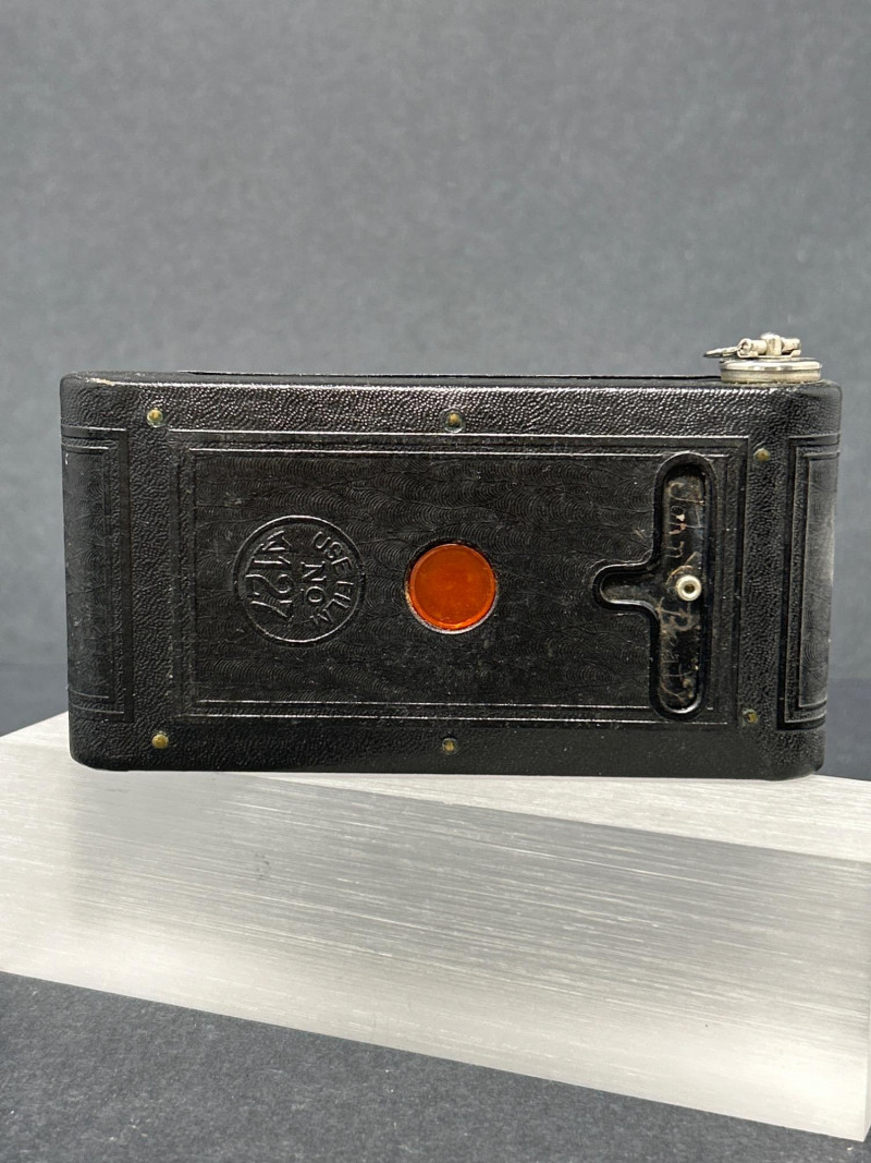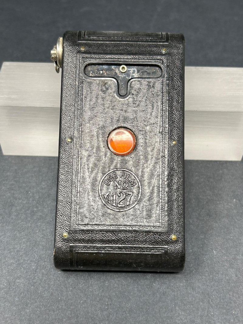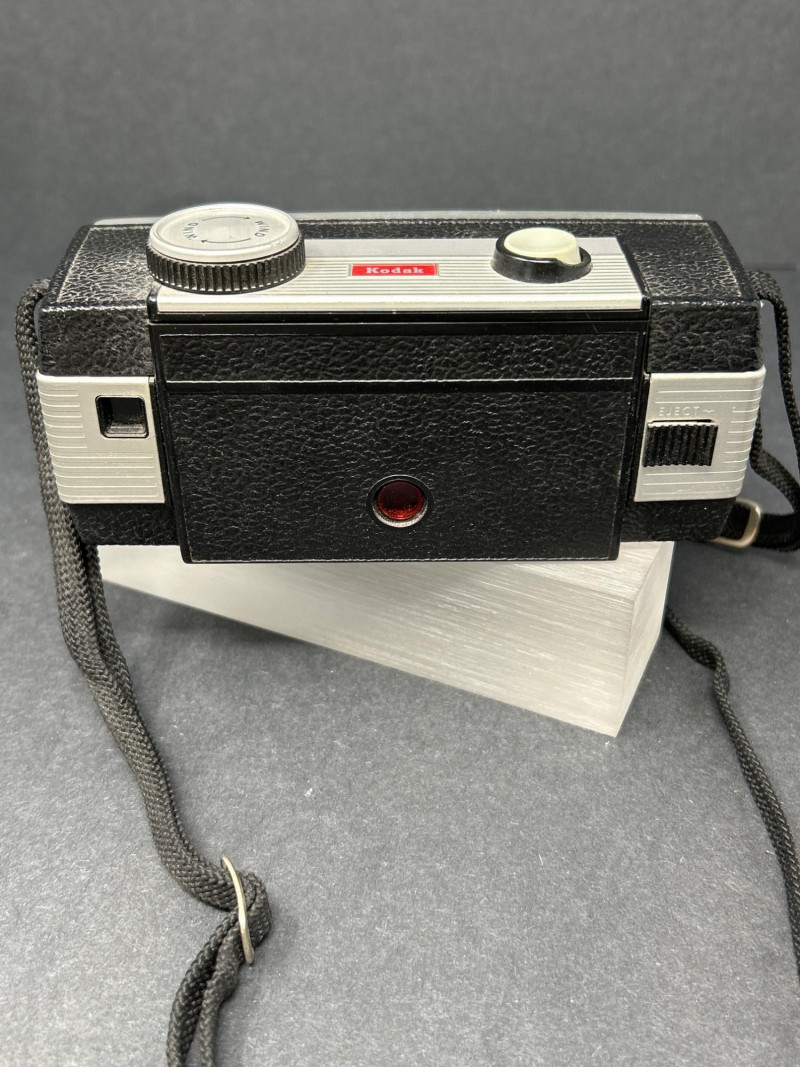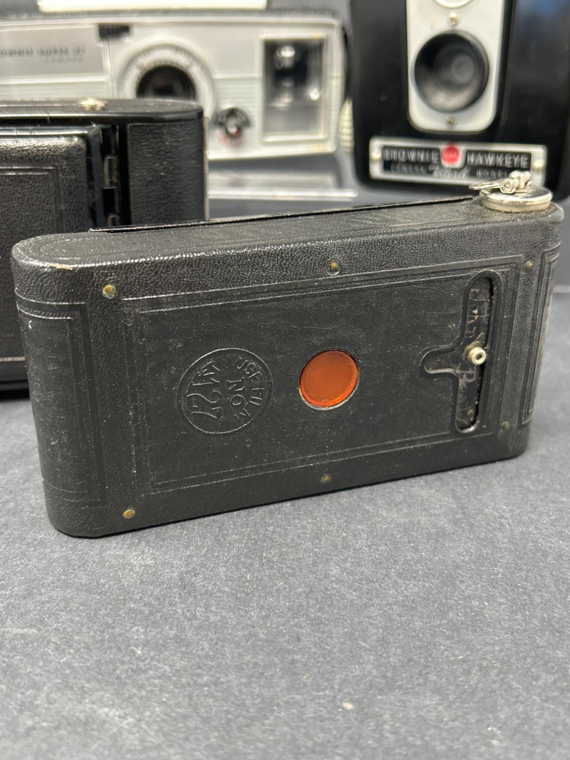 Slim black leatherette body with red film window; classic pocket-sized design. Untested and offered as-is for display or collection. A visually compelling mix of Kodak’s most beloved formats — from bakelite Brownies to early folding cameras — representing over 50 years of photographic innovation. Perfect for shelf display, vintage décor, or historical study.Included Models: