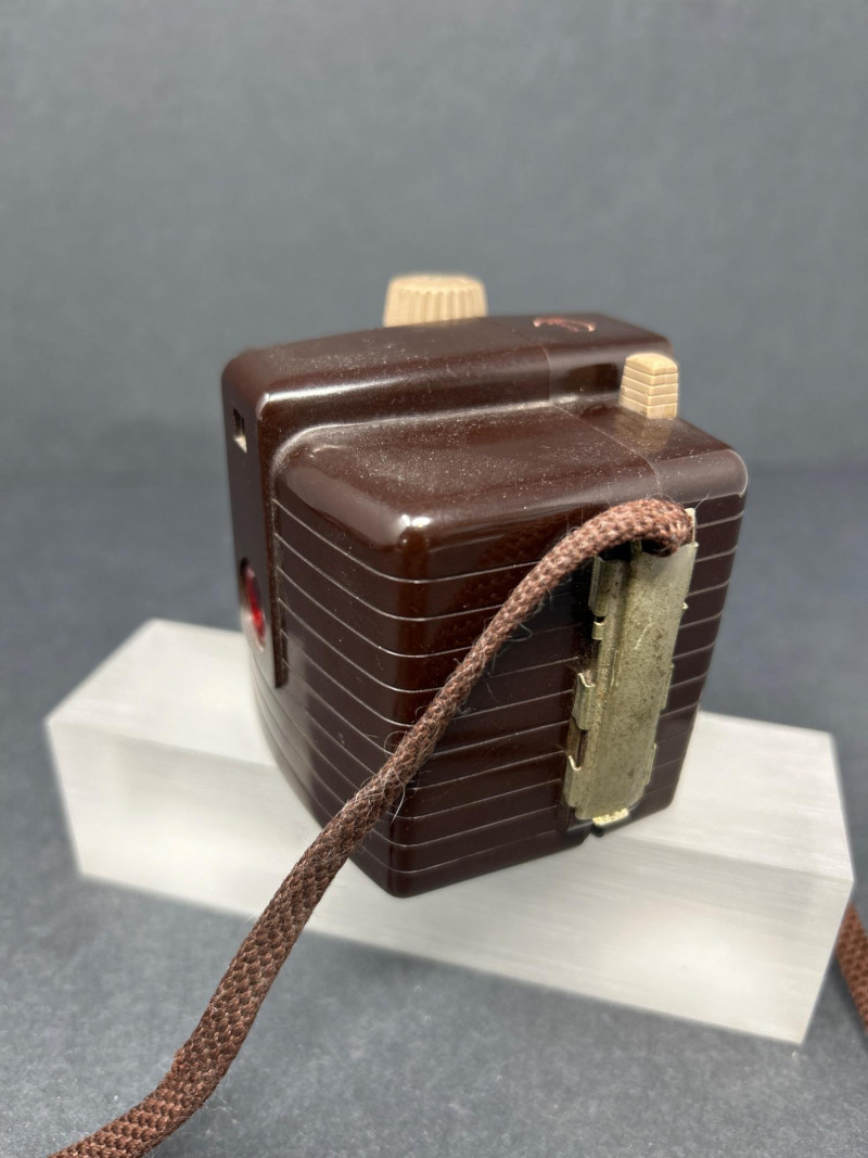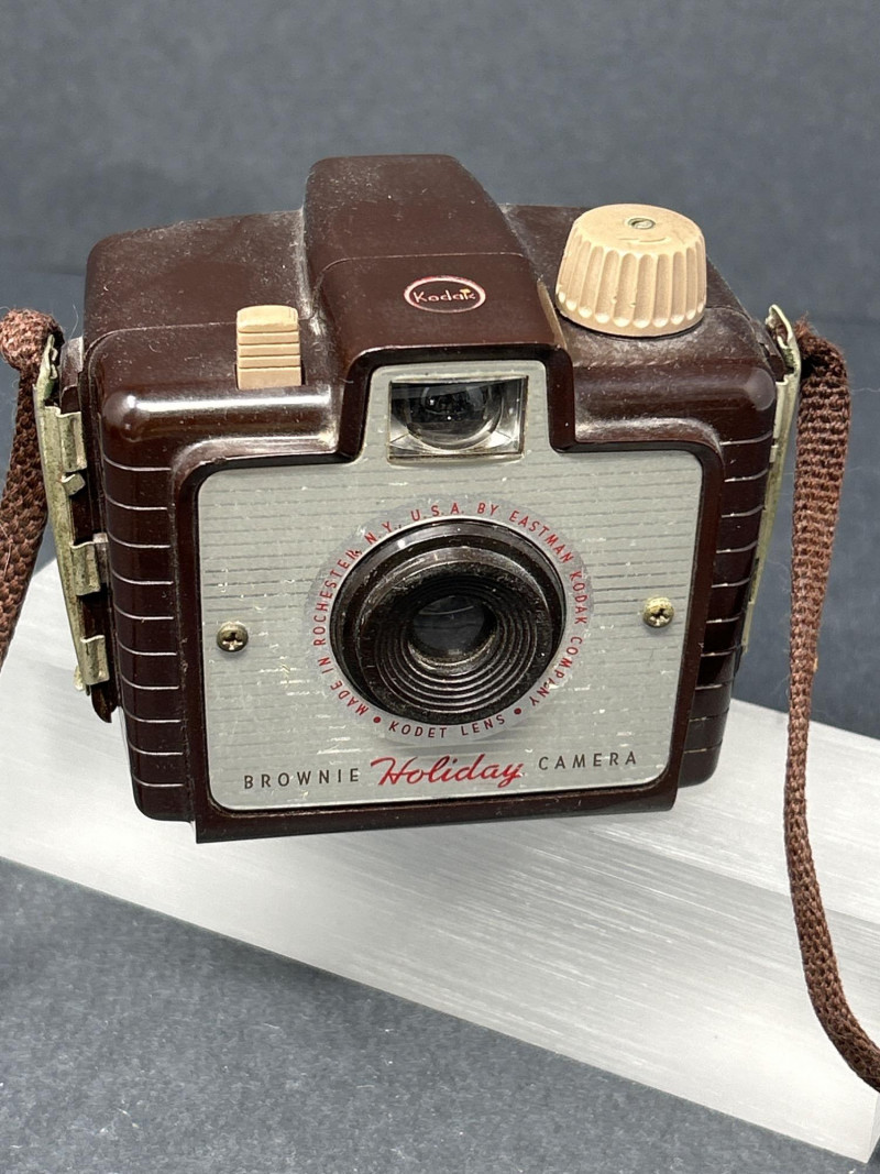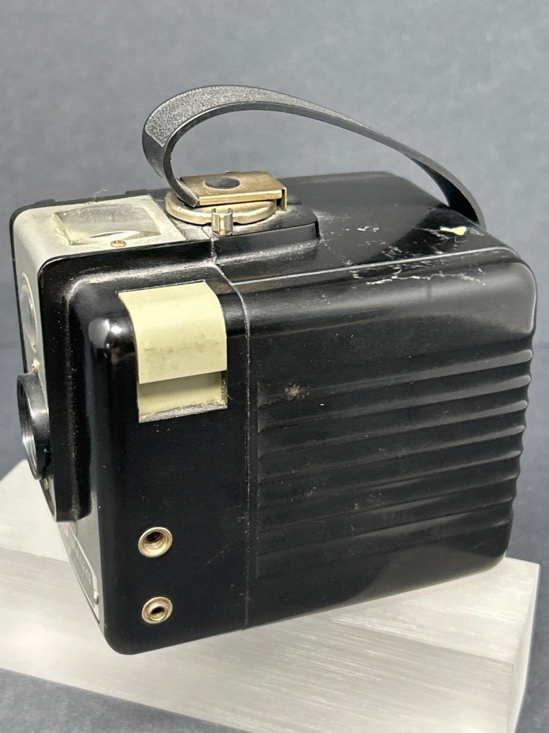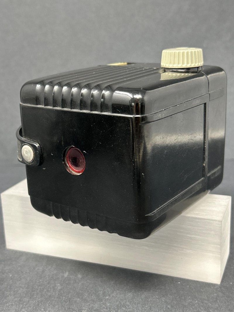 Iconic black bakelite box camera with top-mounted viewfinder and flash sync port. Kodak Brownie Holiday Camera (c.1953–1962)