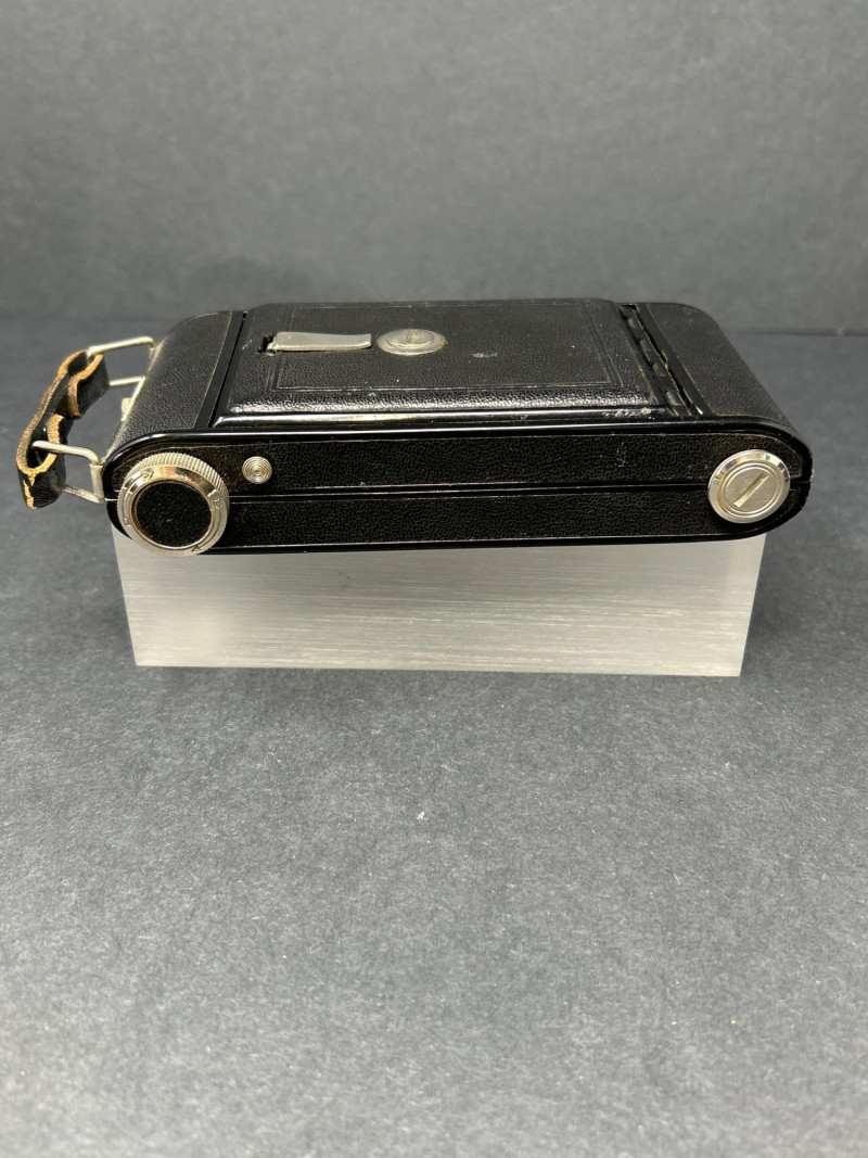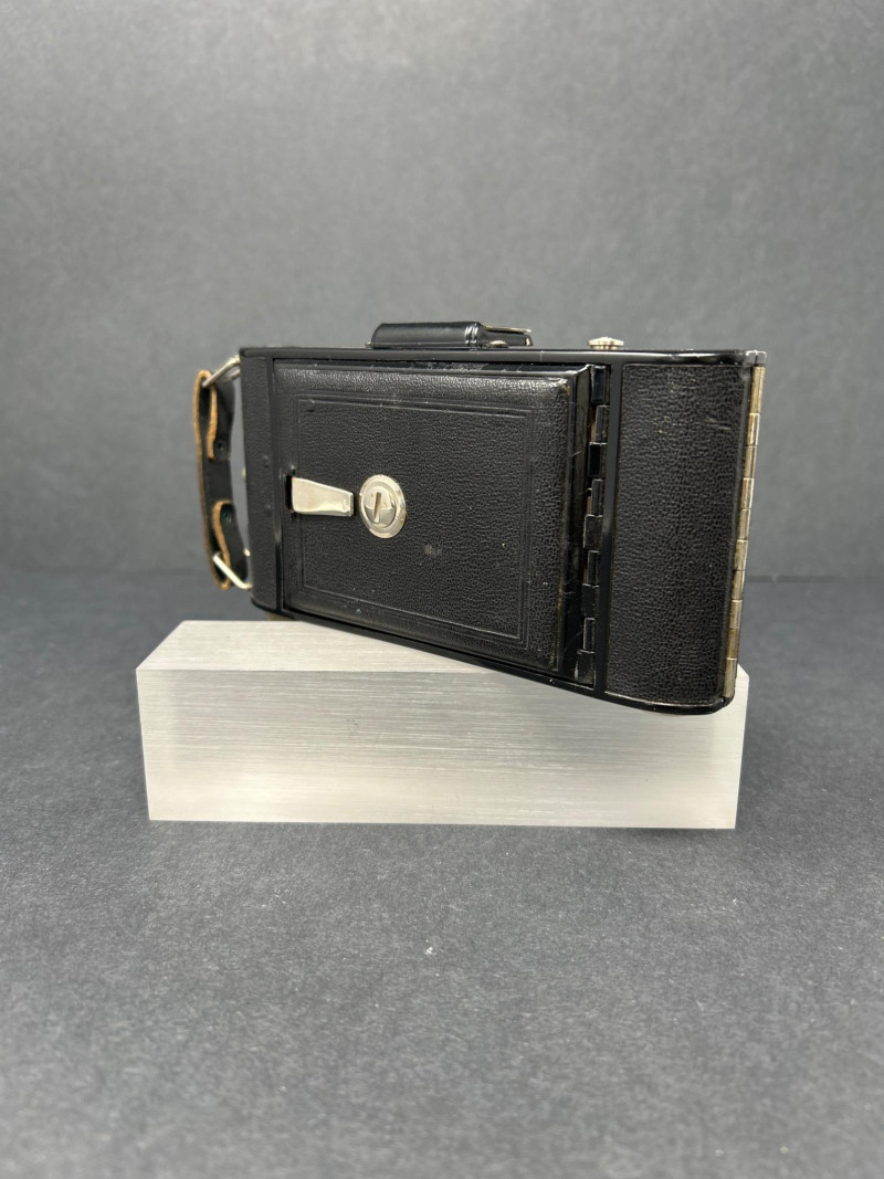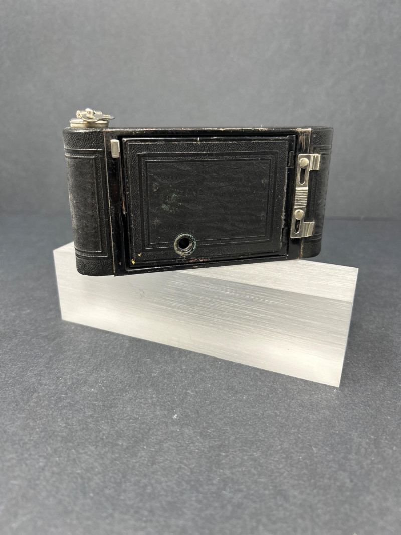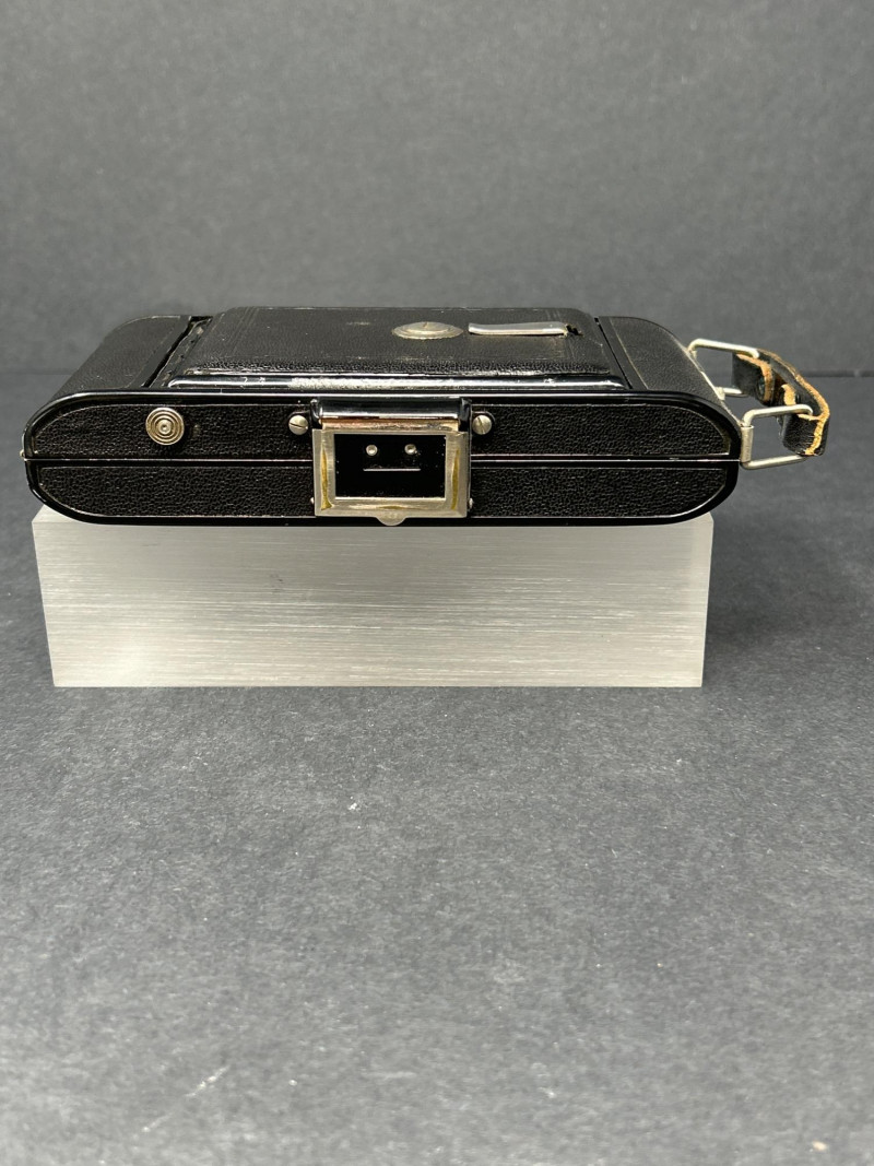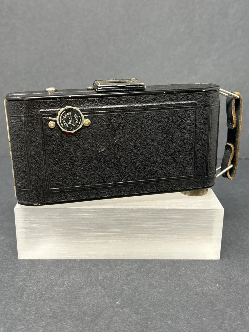 Leather-covered bellows-style body with metal hardware and red window film counter. Kodak Vest Pocket or Compact Folding Camera