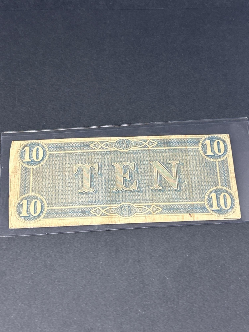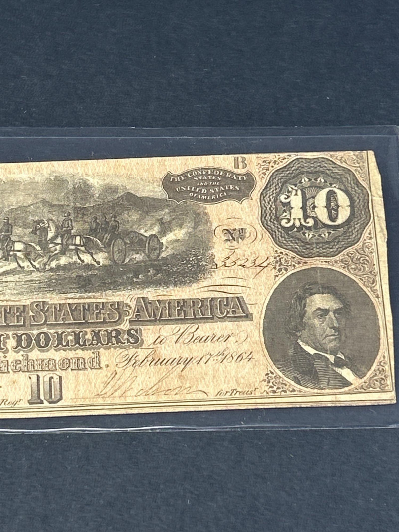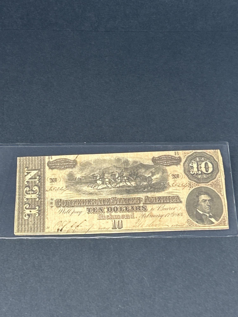 A poignant relic from the final year of the Confederacy, this 1864 ten-dollar banknote issued in Richmond, Virginia, carries the weight of a nation in turmoil. Encased in a protective sleeve, the note features: