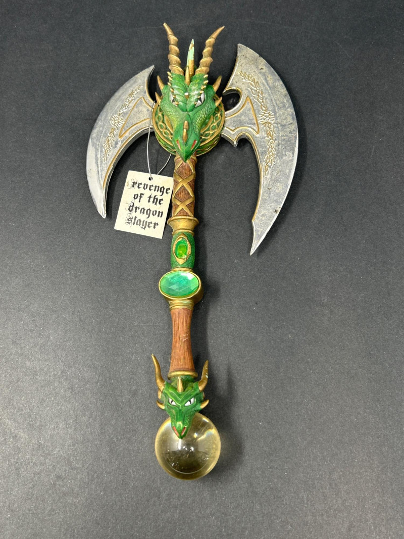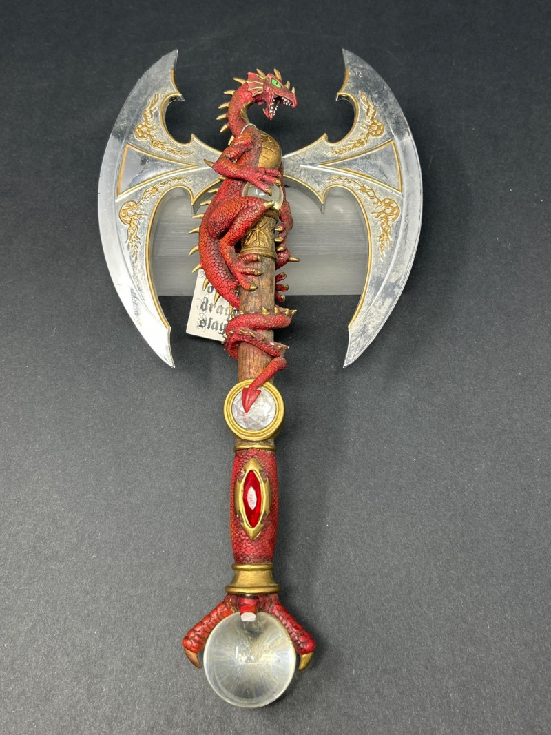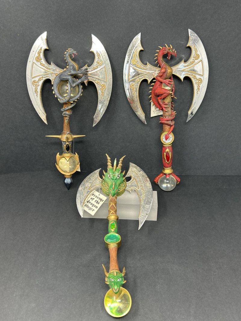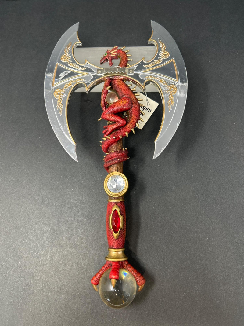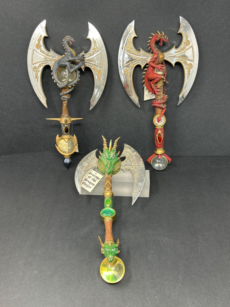 Twin-blade design with fierce red dragon climbing the shaft Ornate silver and gold blade etching Clear crystal orb pommel Condition Note: Dragon’s toe is cracked Spread-wing dragon wrapped around blade center Gold scroll accents and smoky crystal orb pommel Winged blade design with vibrant green dragon Emerald-tone cabochons and clear orb pommel Condition Note: Minor cosmetic wear Striking trio of sculptural fantasy axes ideal for: Fantasy weapon collectors Dragon-themed décor enthusiasts Cosplay or themed display setups Dimensions (each): Approx. 14" long x 7" wide“Dragon Bane” – Red Dragon Axe
