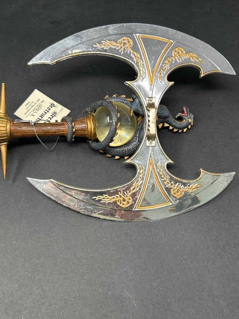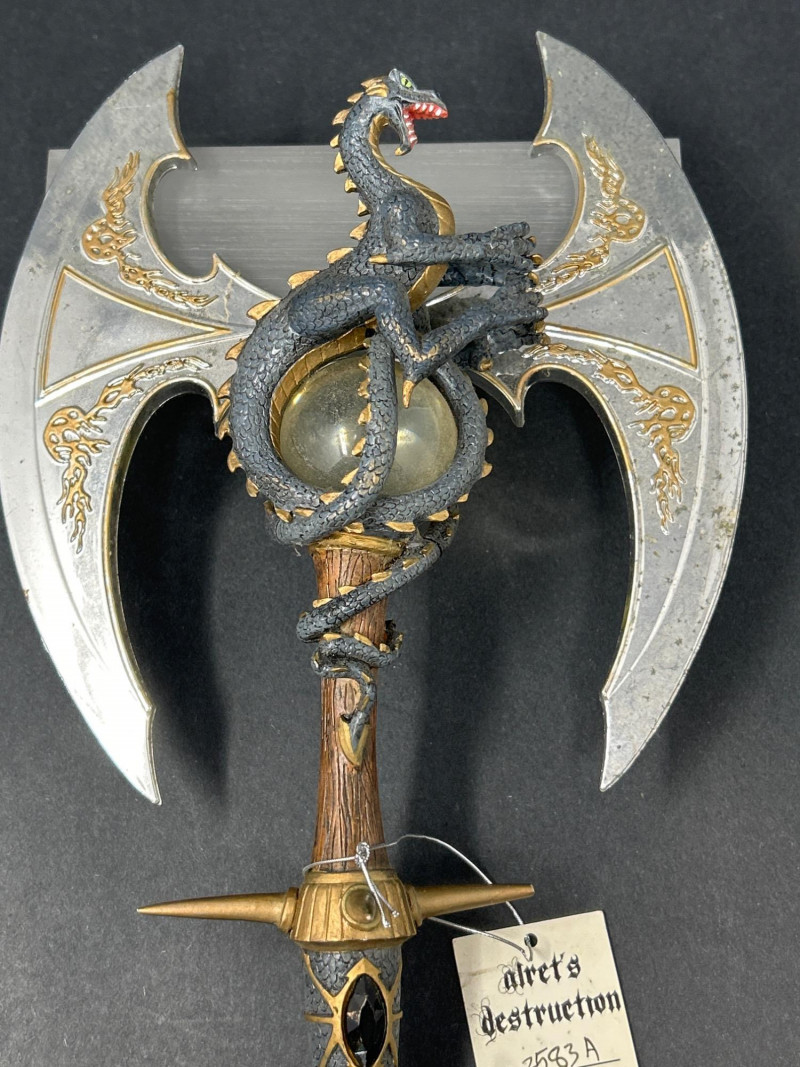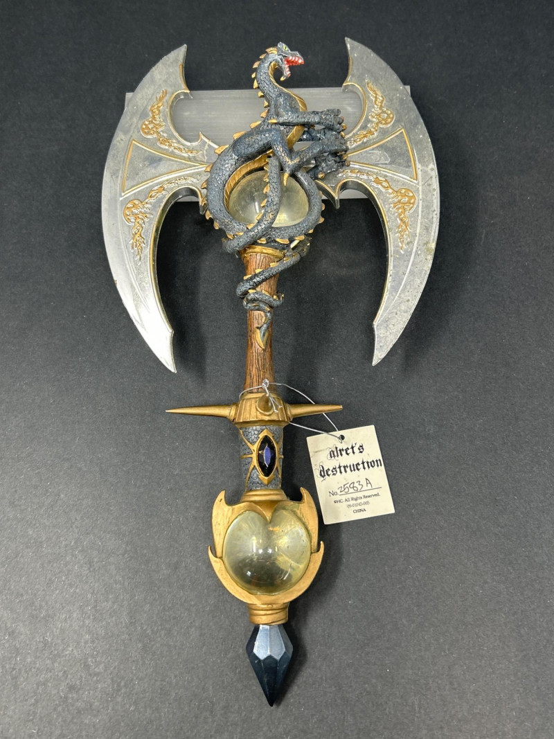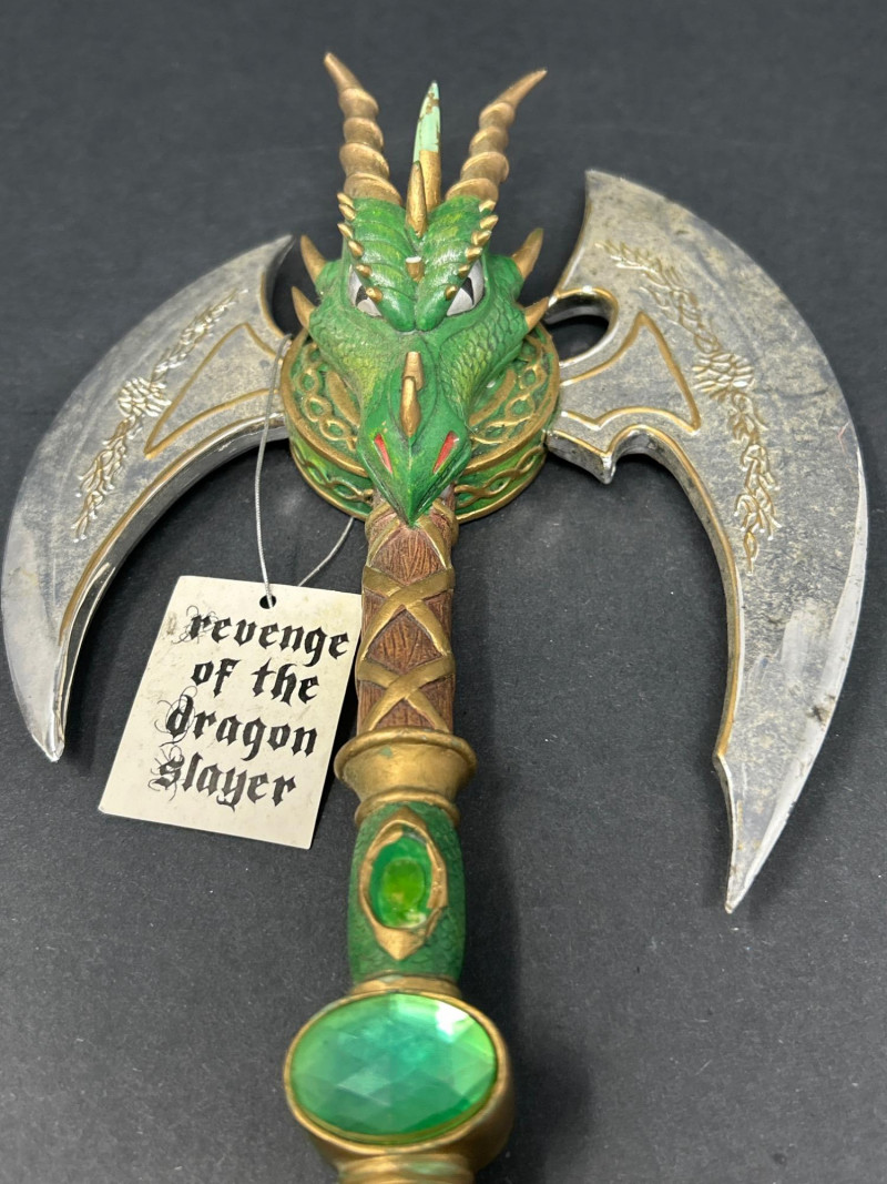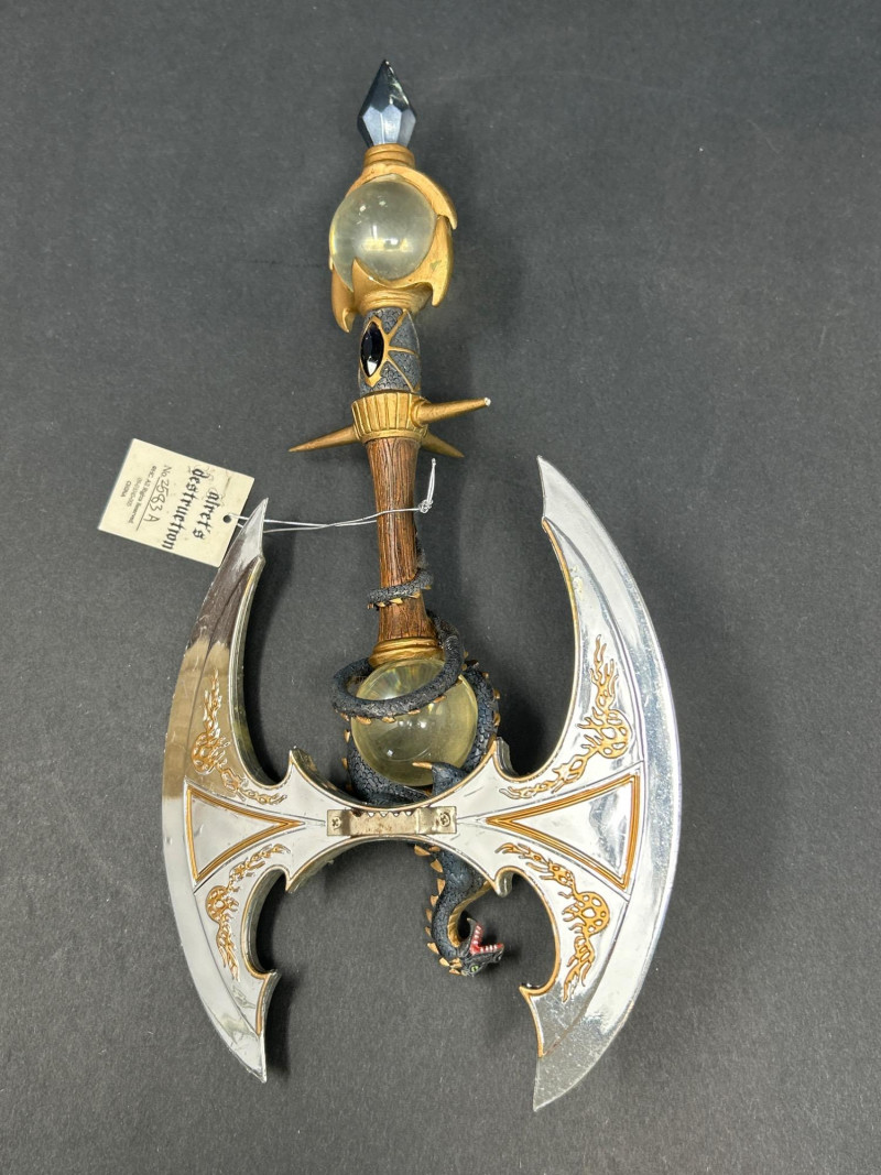 Twin-blade design with fierce red dragon climbing the shaft Ornate silver and gold blade etching Clear crystal orb pommel Condition Note: Dragon’s toe is cracked Spread-wing dragon wrapped around blade center Gold scroll accents and smoky crystal orb pommel Winged blade design with vibrant green dragon Emerald-tone cabochons and clear orb pommel Condition Note: Minor cosmetic wear Striking trio of sculptural fantasy axes ideal for: Fantasy weapon collectors Dragon-themed décor enthusiasts Cosplay or themed display setups Dimensions (each): Approx. 14" long x 7" wide“Dragon Bane” – Red Dragon Axe