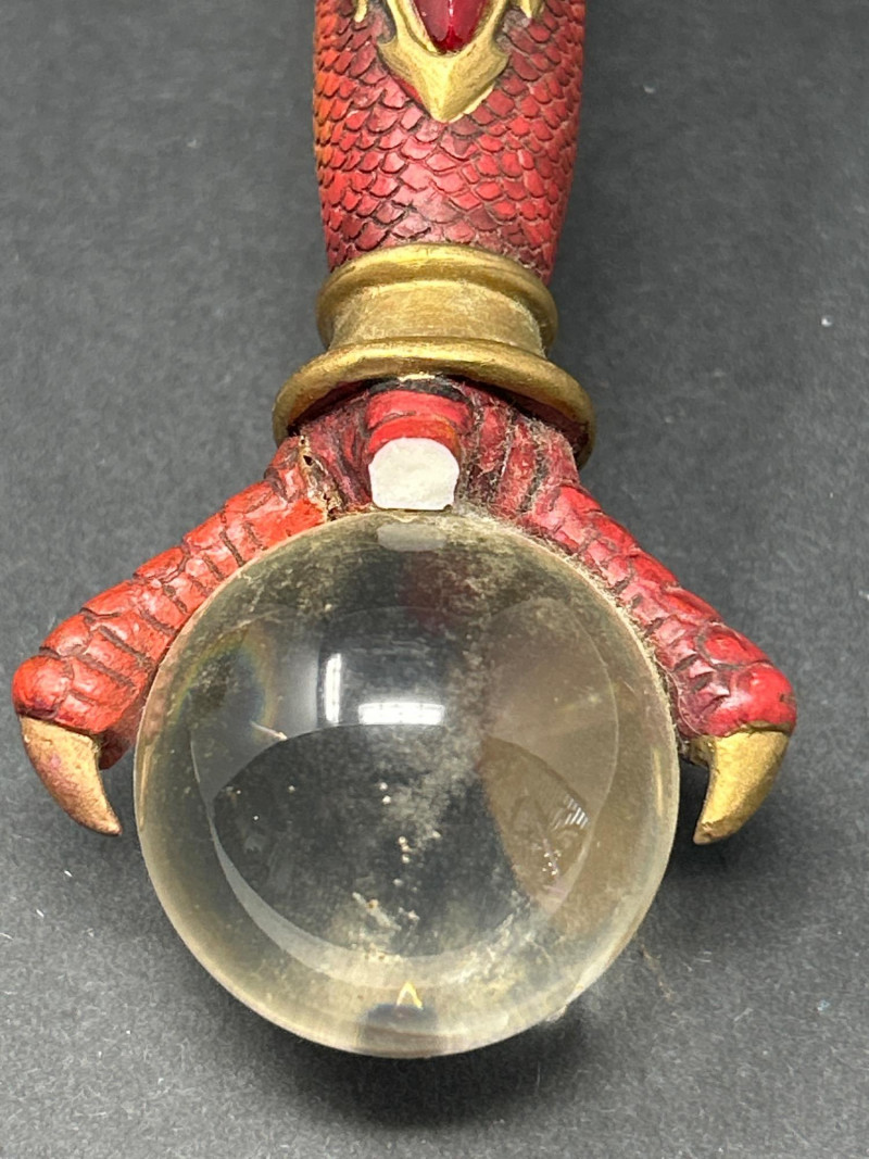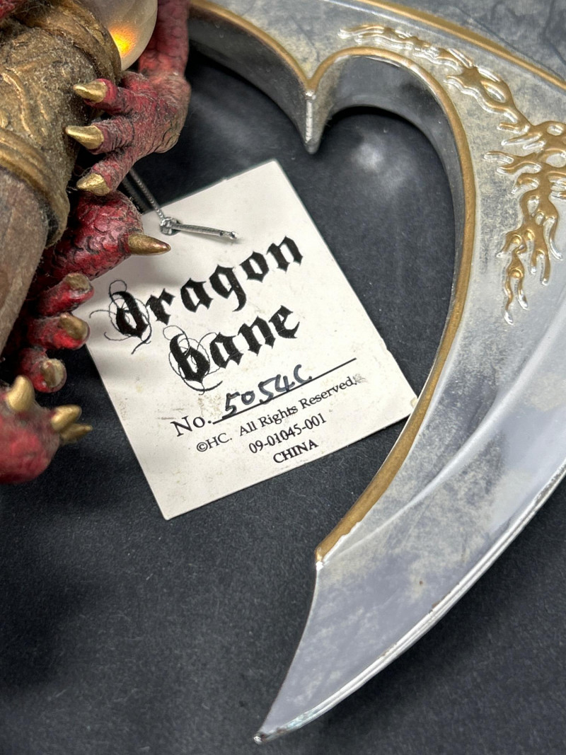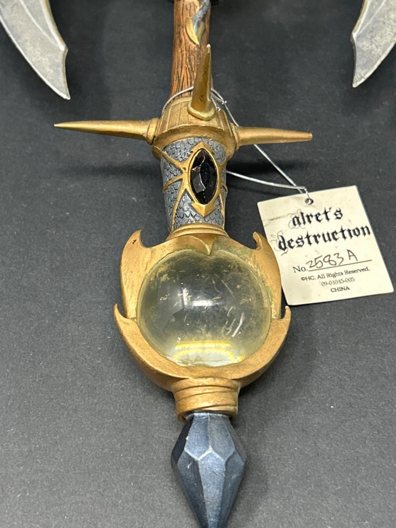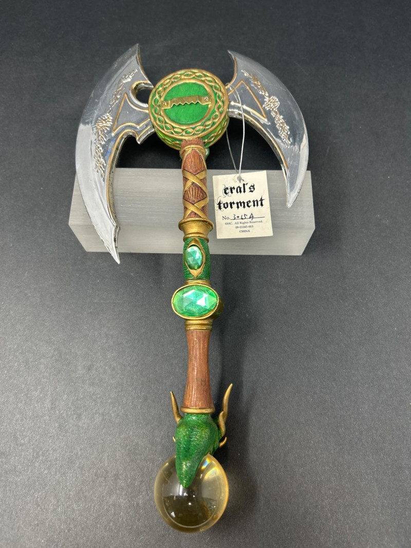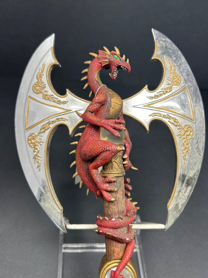 Twin-blade design with fierce red dragon climbing the shaft Ornate silver and gold blade etching Clear crystal orb pommel Condition Note: Dragon’s toe is cracked Spread-wing dragon wrapped around blade center Gold scroll accents and smoky crystal orb pommel Winged blade design with vibrant green dragon Emerald-tone cabochons and clear orb pommel Condition Note: Minor cosmetic wear Striking trio of sculptural fantasy axes ideal for: Fantasy weapon collectors Dragon-themed décor enthusiasts Cosplay or themed display setups Dimensions (each): Approx. 14" long x 7" wide“Dragon Bane” – Red Dragon Axe