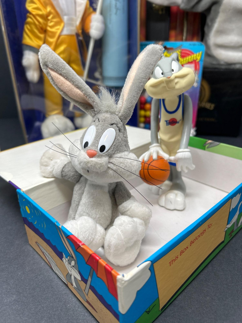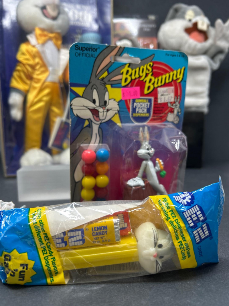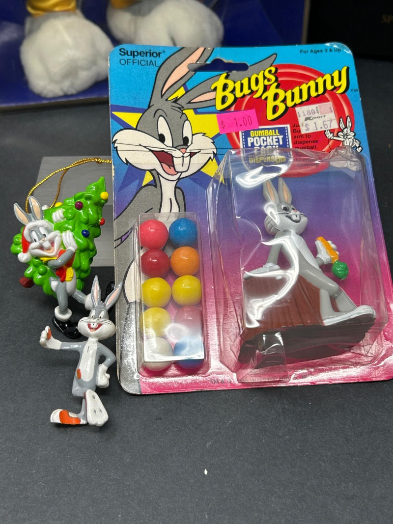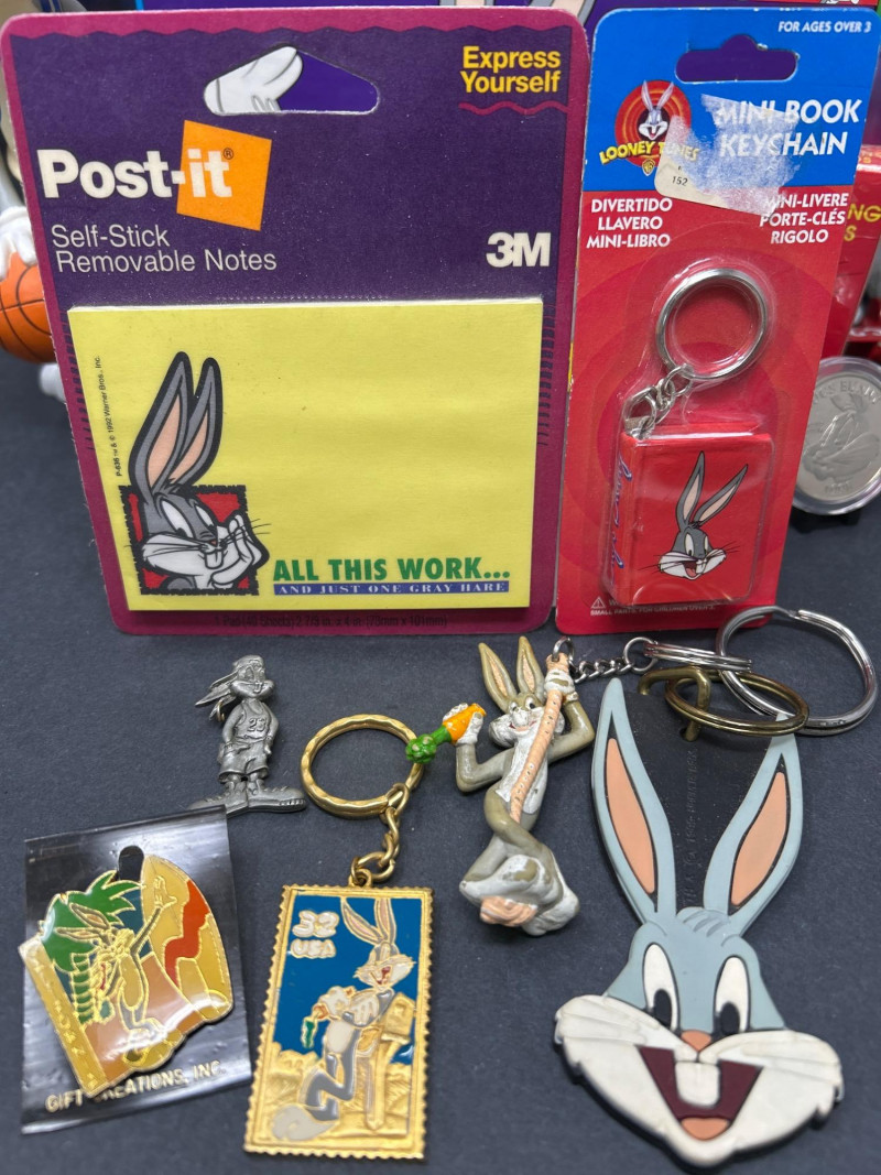 “Carrotus Digestum” obverse, “That’s All Folks!” reverse. A whimsical nod to Bugs’ legacy. Vintage plush toys (e.g., basketball jersey Bugs) Sealed Bugs Bunny stationery & 3M Post-it set: “All This Work…” Assorted novelty items: enamel & rubber keychains, mini book keychain, ornaments, gumball dispenser, playing cards, Pez, figurines, and more. Many items retain original packaging and maker’s marks (e.g., General Box Co., Warner Bros. 1997, Made in USA). Items range from sealed/new to gently displayed; see individual photos for condition details.Featured Highlights: