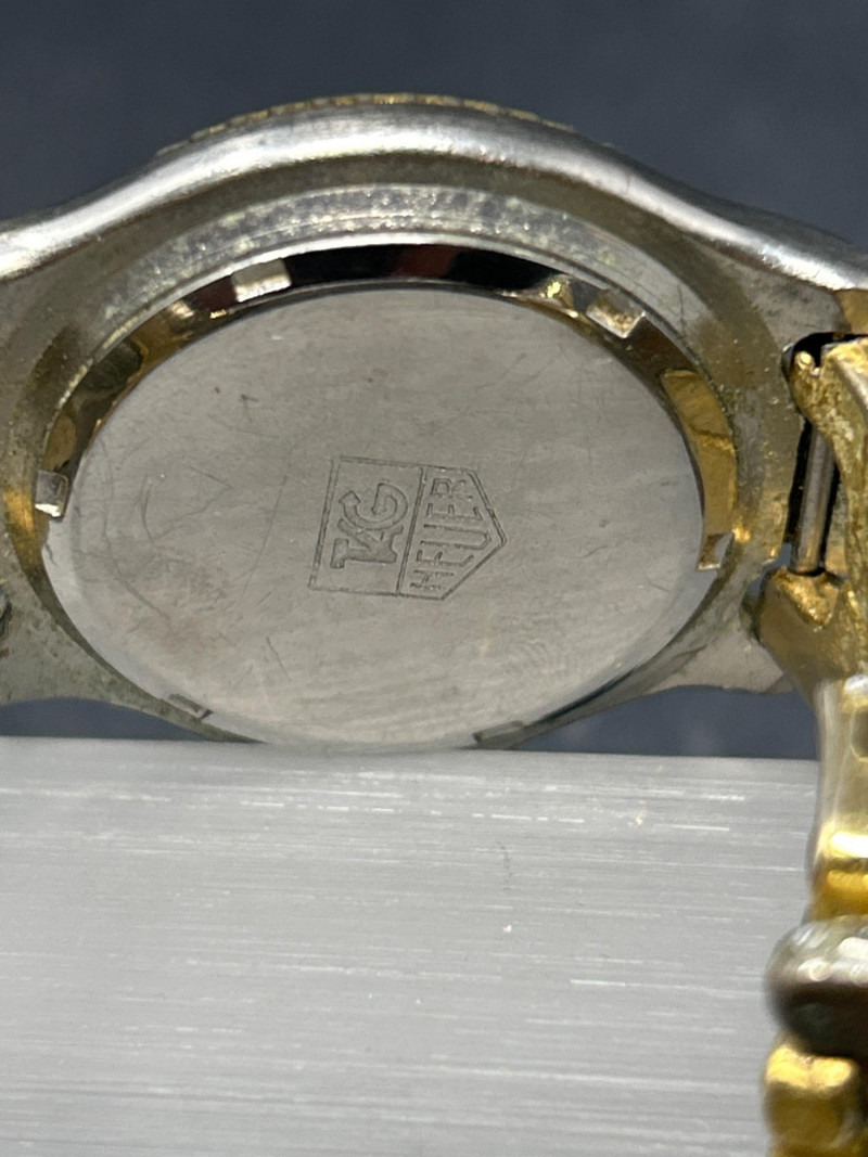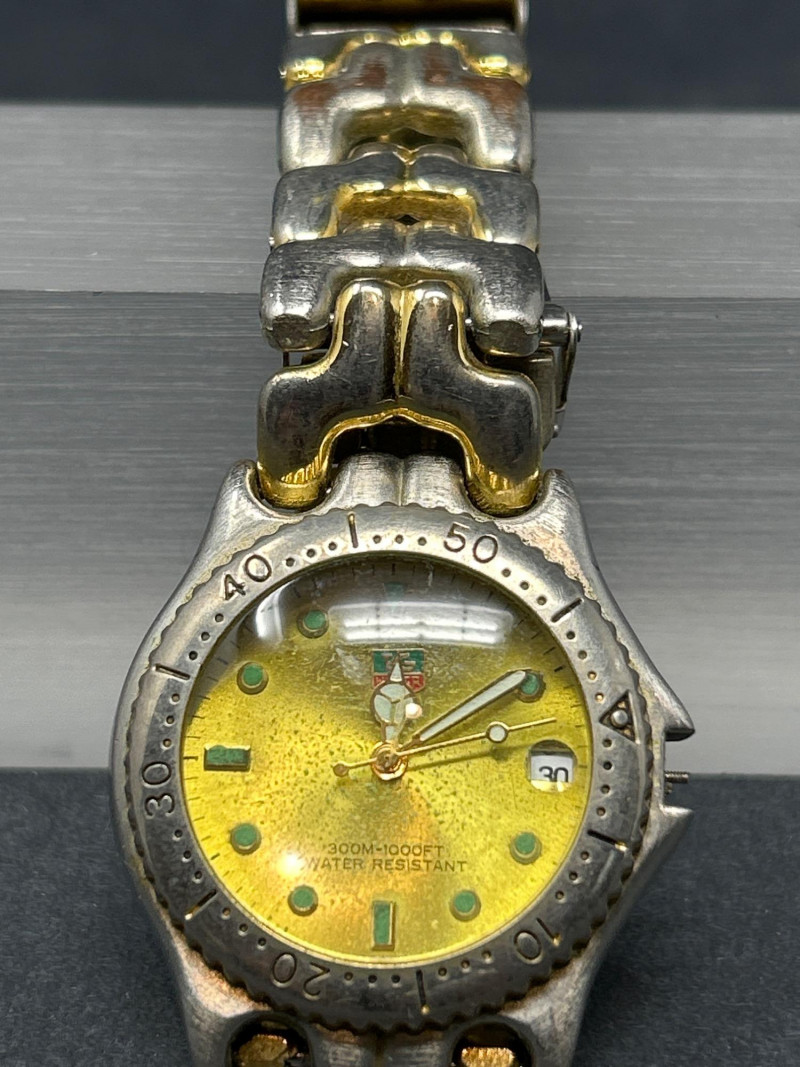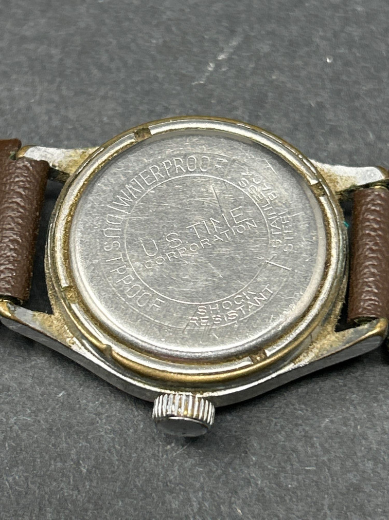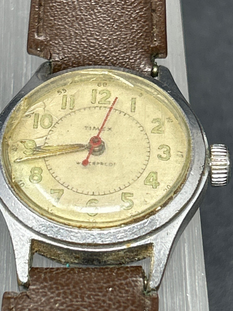 TAG Heuer 2000 Series Quartz Diver (c. 1980s–1990s) Dial: Gold-tone with luminous hour markers, Mercedes-style hands, and date window at 3 o’clock. Case & Bezel: Stainless steel with gold-tone accents; unidirectional diver-style bezel marked 10–50. Bracelet: Two-tone link bracelet; clasp stamped TAG Heuer. Markings: TAG Heuer shield logo on dial and caseback. Specs: Rated “200 M / 660 FT Water Resistant” on dial. Condition: Missing winding piece. Vintage Timex Manual-Wind (U.S. Time Corp., 1950s–early 1960s) Dial: Aged cream with luminous Arabic numerals and red seconds hand. Caseback: Stamped “U.S. Time Corporation – Dustproof Waterproof Shock Resistant Stainless Steel Back.” Movement: Likely manual-wind (pre-1962 Timex branding). Strap: Replacement brown faux leather strap