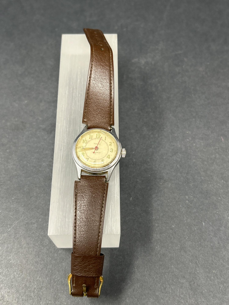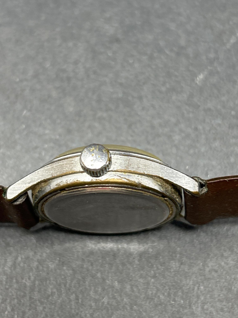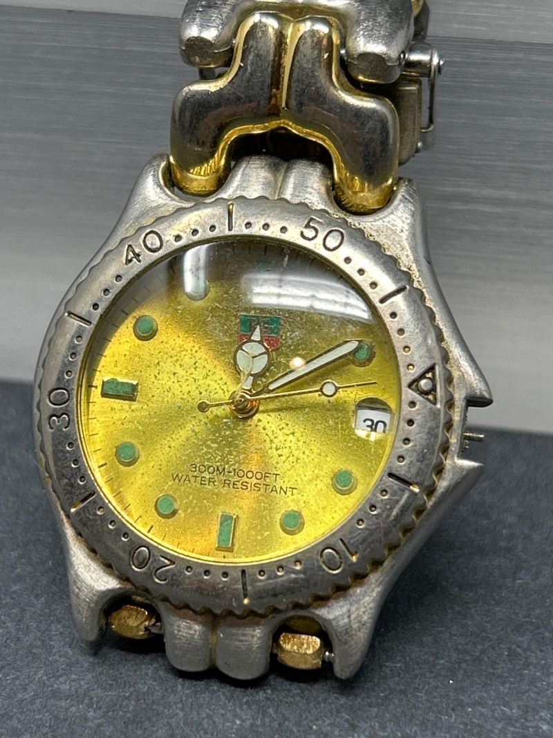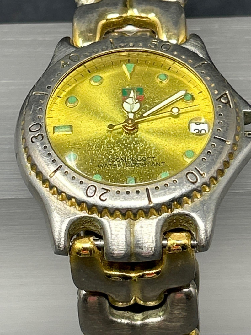 TAG Heuer 2000 Series Quartz Diver (c. 1980s–1990s) Dial: Gold-tone with luminous hour markers, Mercedes-style hands, and date window at 3 o’clock. Case & Bezel: Stainless steel with gold-tone accents; unidirectional diver-style bezel marked 10–50. Bracelet: Two-tone link bracelet; clasp stamped TAG Heuer. Markings: TAG Heuer shield logo on dial and caseback. Specs: Rated “200 M / 660 FT Water Resistant” on dial. Condition: Missing winding piece. Vintage Timex Manual-Wind (U.S. Time Corp., 1950s–early 1960s) Dial: Aged cream with luminous Arabic numerals and red seconds hand. Caseback: Stamped “U.S. Time Corporation – Dustproof Waterproof Shock Resistant Stainless Steel Back.” Movement: Likely manual-wind (pre-1962 Timex branding). Strap: Replacement brown faux leather strap