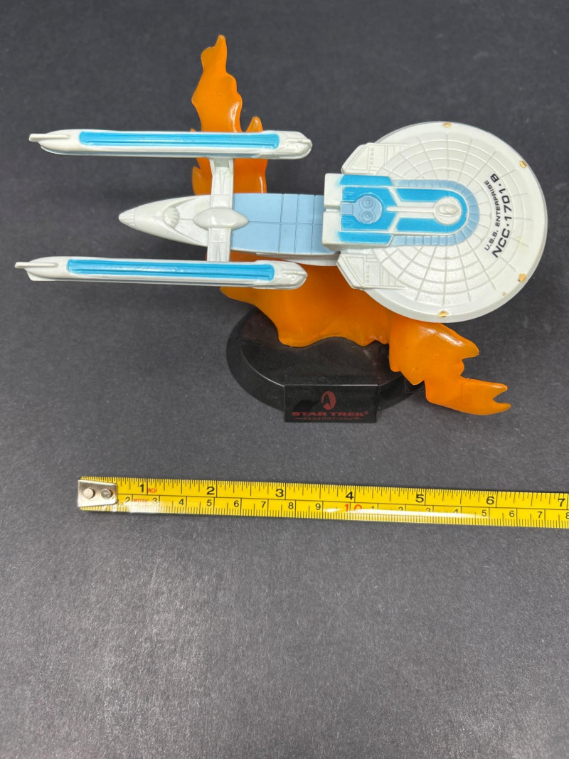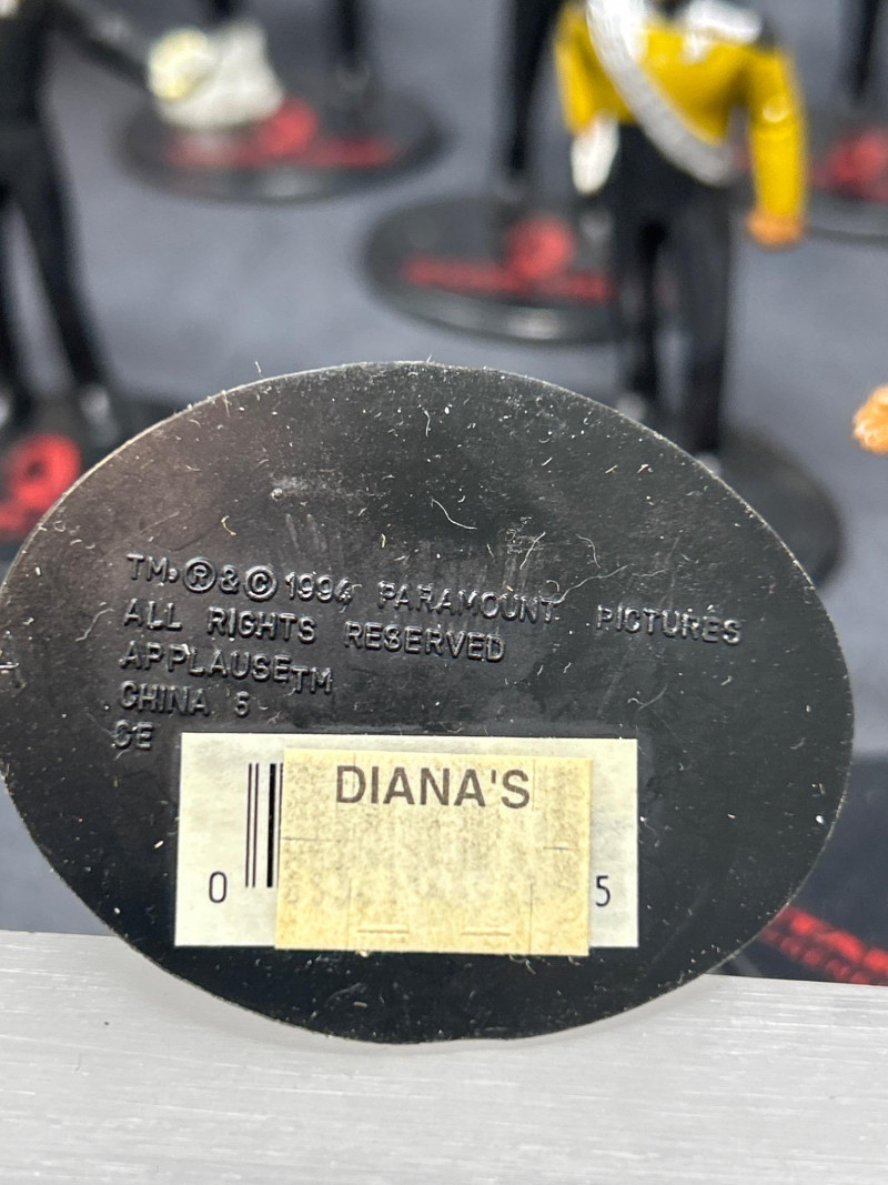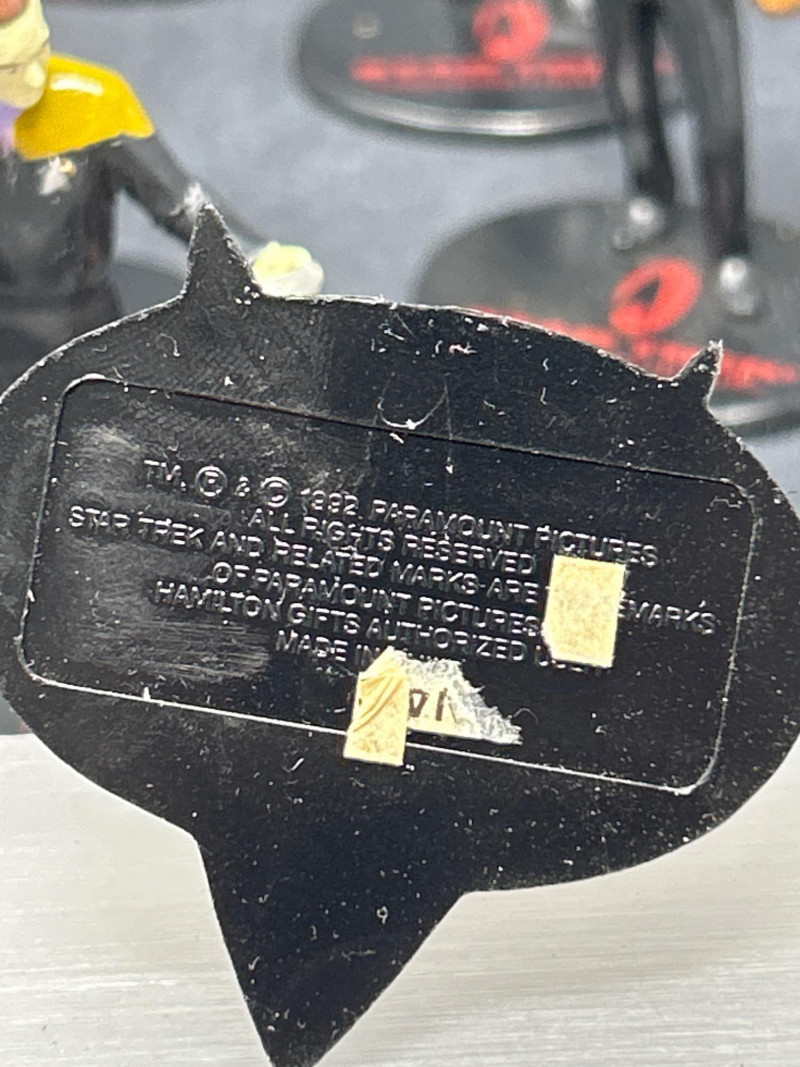 Lot Includes: 12 Painted Crew Figurines (approx. 3–4 in. tall) Mounted on round black display bases marked with Star Trek: Generations logo, Paramount copyright, and Hamilton Gifts/Applause licensing Characters from Star Trek: The Next Generation including Worf, Data, La Forge, Riker, and others in Starfleet uniforms Includes select costume variants for added visual interest 2 Limited-Edition U.S.S. Enterprise-B Display Models (approx. 7 in. long) Mounted on orange “warp/explosion” effect bases with black nameplates Each features a numbered brass plaque: No. 00422/24000 and No. 00424/24000 Maker / License: Paramount Pictures • Hamilton Gifts & Applause (1993–1994)