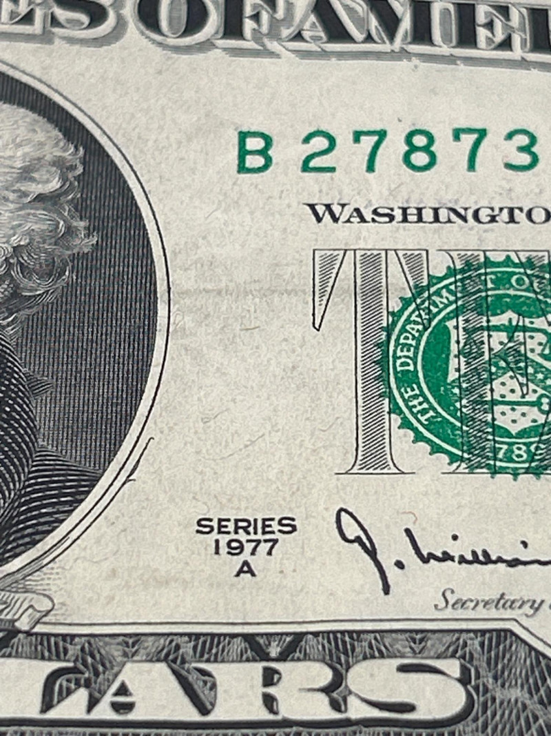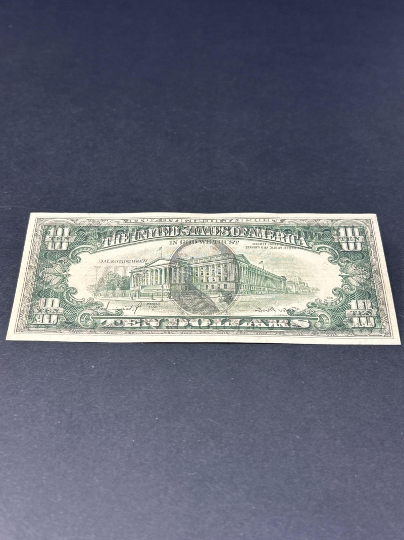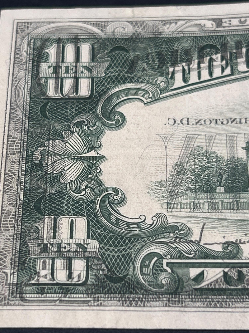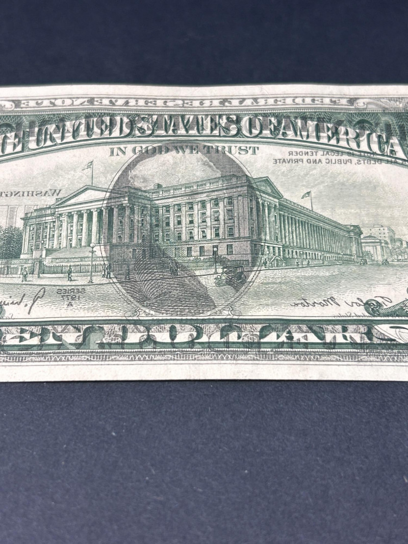 A dramatic and highly collectible 1977 $10 Federal Reserve Note showcasing a rare full back-to-front offset printing error. This error occurs when freshly printed sheets stack before the ink fully dries, creating a mirror image transfer of the back design onto the front of the note. Unlike light smudges or partial transfers, this example shows a full, extra-dark ghost image that is sharp and highly visible. Series: 1977 Denomination: Ten Dollars