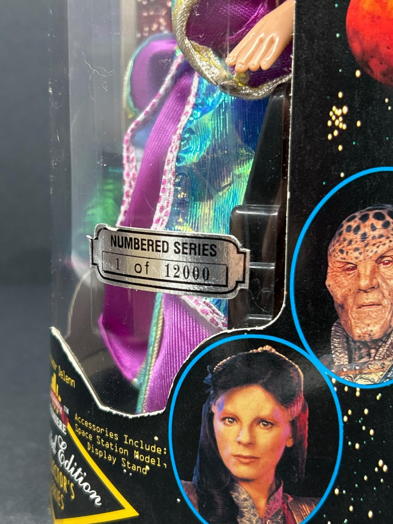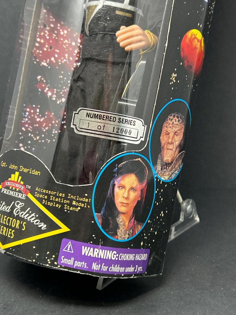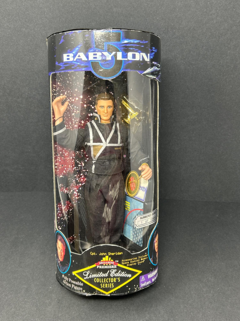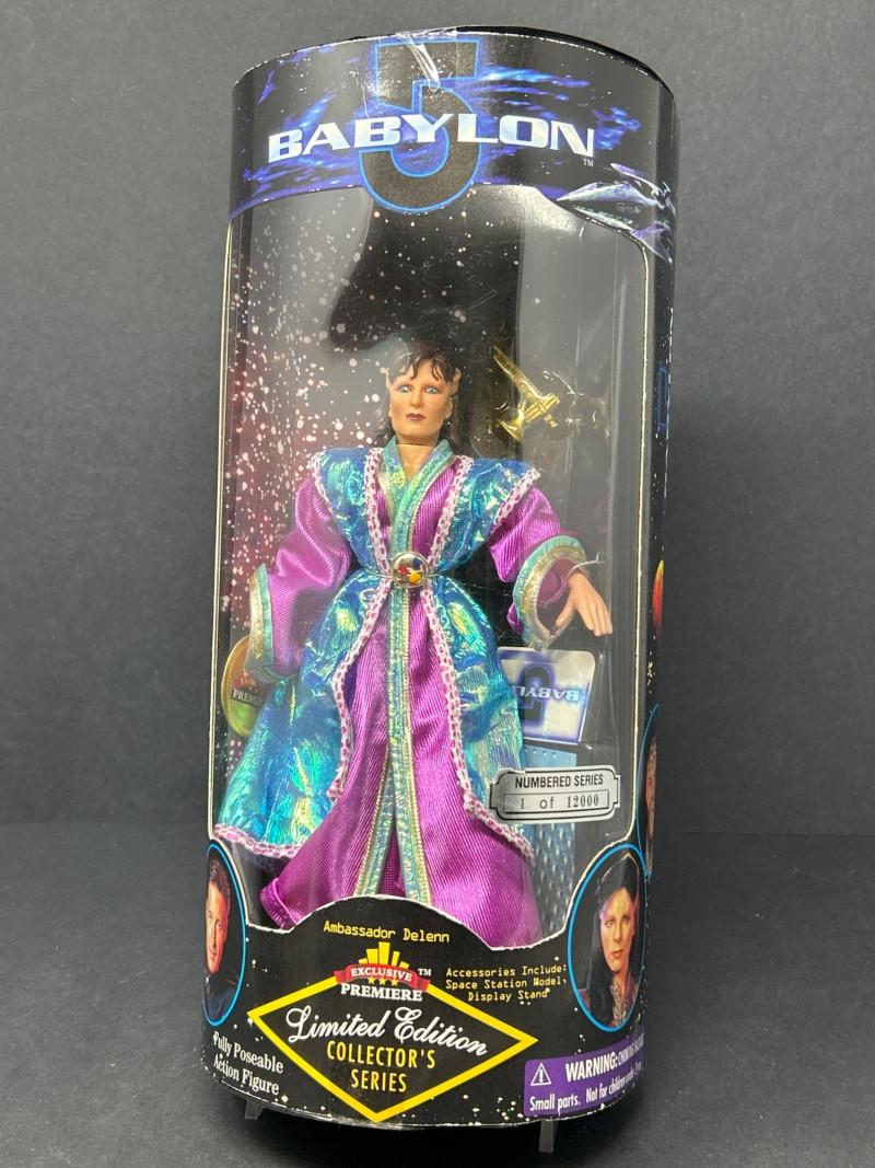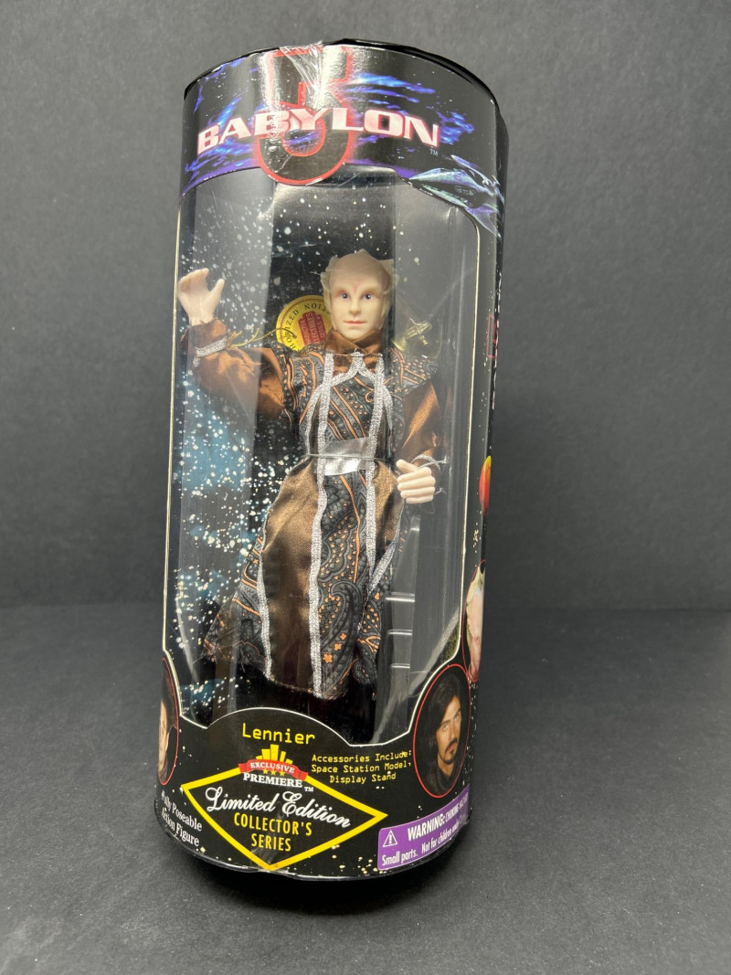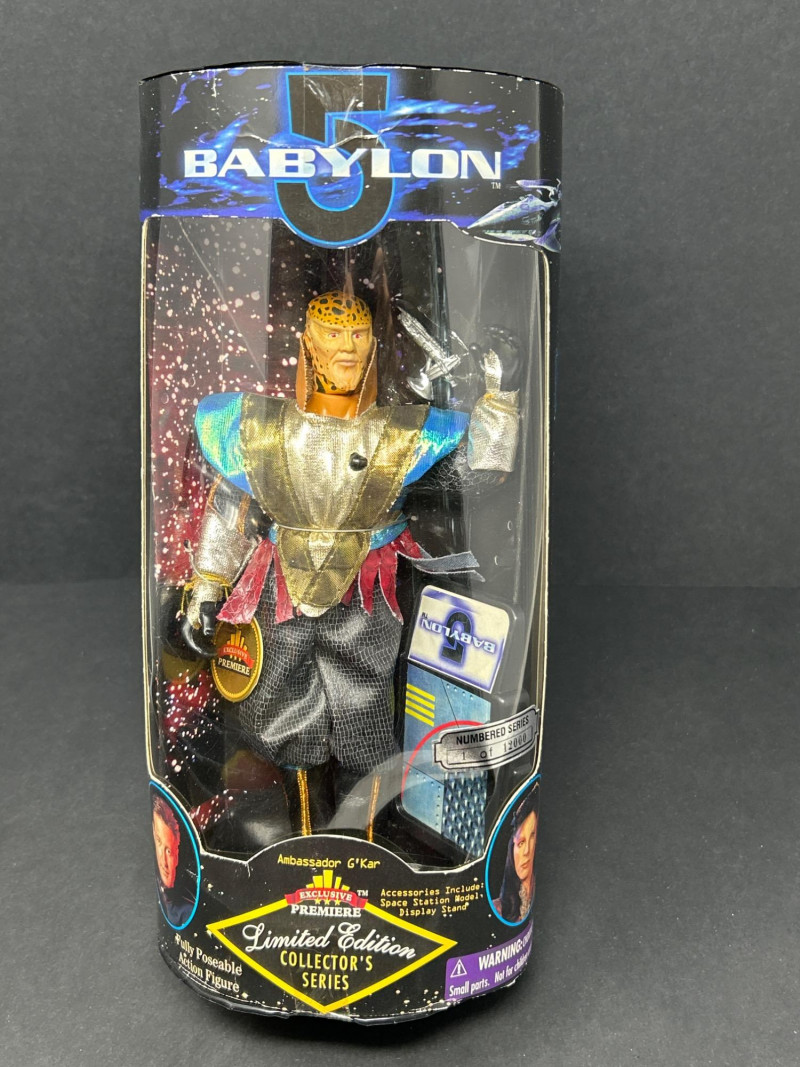 A rare complete boxed set of five fully poseable Babylon 5 action figures from the “Limited Edition Collector’s Series” by Exclusive Premiere. Each figure is individually numbered out of 12,000 and comes in its original window display box with intact edition stickers. Set Includes: Captain John Sheridan – EarthForce uniform, with space station model & display stand Ambassador Delenn – iridescent Minbari robes, with space station model & display stand Ambassador Londo Mollari – Centauri regalia, with space station model & display stand Ambassador G’Kar – Narn battle attire, with space station model & display stand Lennier – Minbari aide in patterned robe, with space station model & display stand Details: Manufacturer: Exclusive Premiere Edition: Individually numbered out of 12,000 (stickers intact) Size: Approx. 9–10 in (23–25 cm) Packaging: Original window boxes; light shelf/edge wear noted. Londo’s box has detached/open front flap (see photos). Collector’s Note: