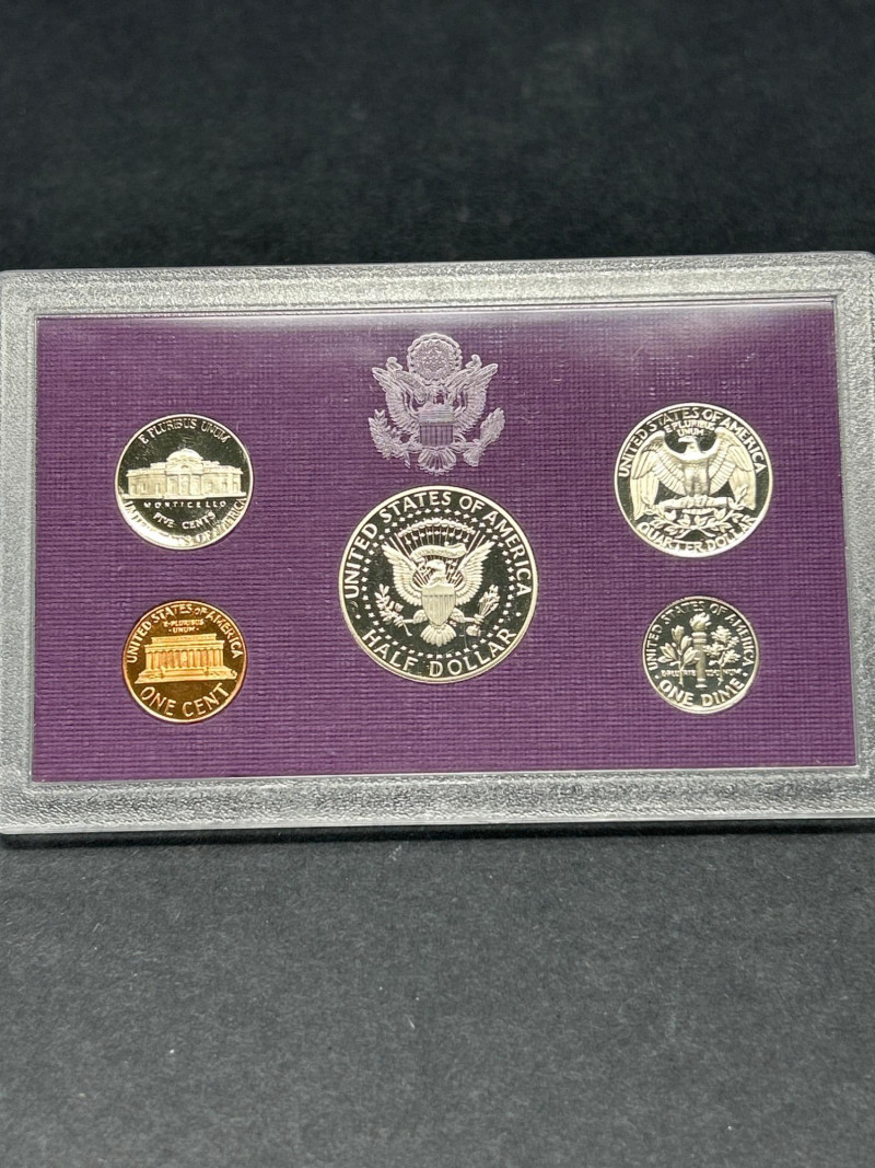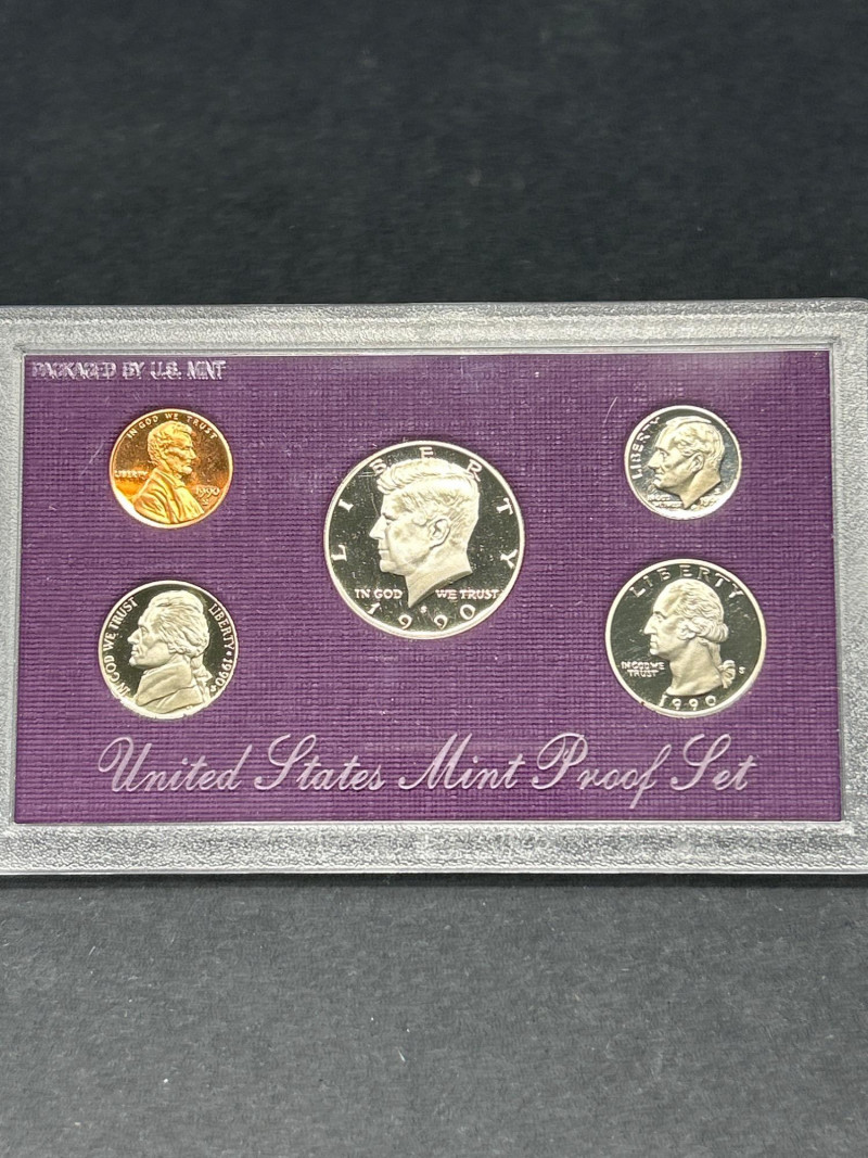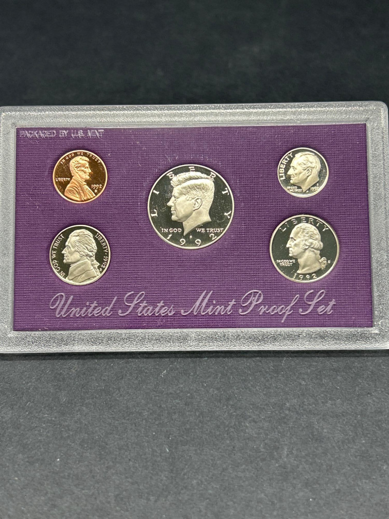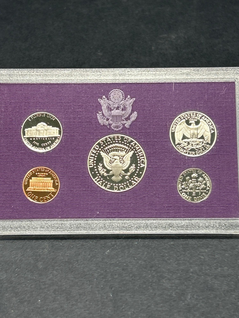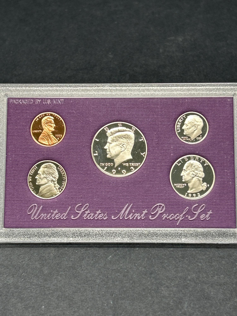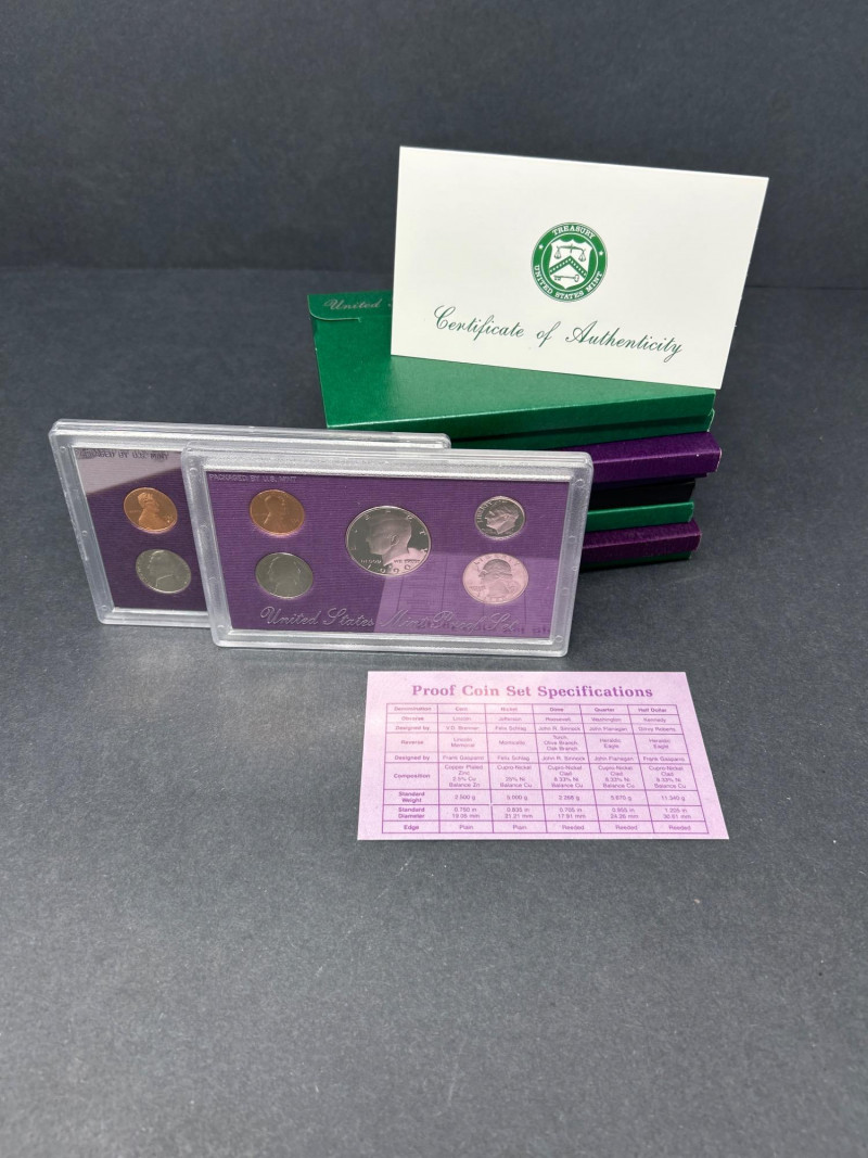 A premium offering of ten official United States Mint Proof Sets, each featuring meticulously struck coins with mirror-like fields and frosted devices. This curated lot includes both standard and silver issues, housed in original government packaging with Certificates of Authenticity and coin specification inserts. Included Sets: Silver Proof Sets: 1992, 1993 (black holders, labeled “Silver”) Standard Proof Sets: 1986, 1990 (x2), 1992, 1994, 1995, 1996, 1997 (purple and green holders) Coin Denominations per Set: Cent, Nickel, Dime, Quarter, Half Dollar, Dollar All coins struck in high-relief with reeded or plain edges per denomination Specifications & Composition: Cent: Copper-plated zinc, 2.5g, plain edge Nickel: Cupro-nickel, 5.0g, plain edge Dime: Cupro-nickel, 2.27g, reeded edge Quarter: Cupro-nickel, 5.67g, reeded edge Half Dollar: Cupro-nickel, 11.34g, reeded edge Dollar: Cupro-nickel, 8.1g, reeded edge