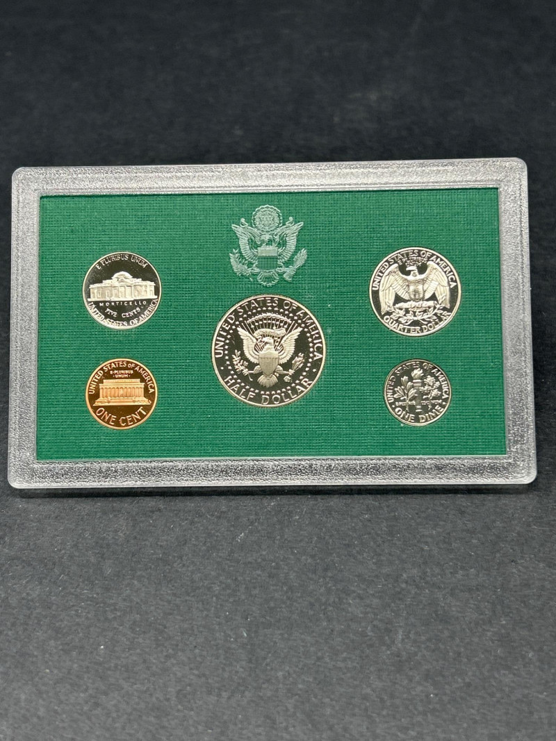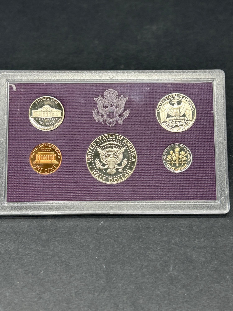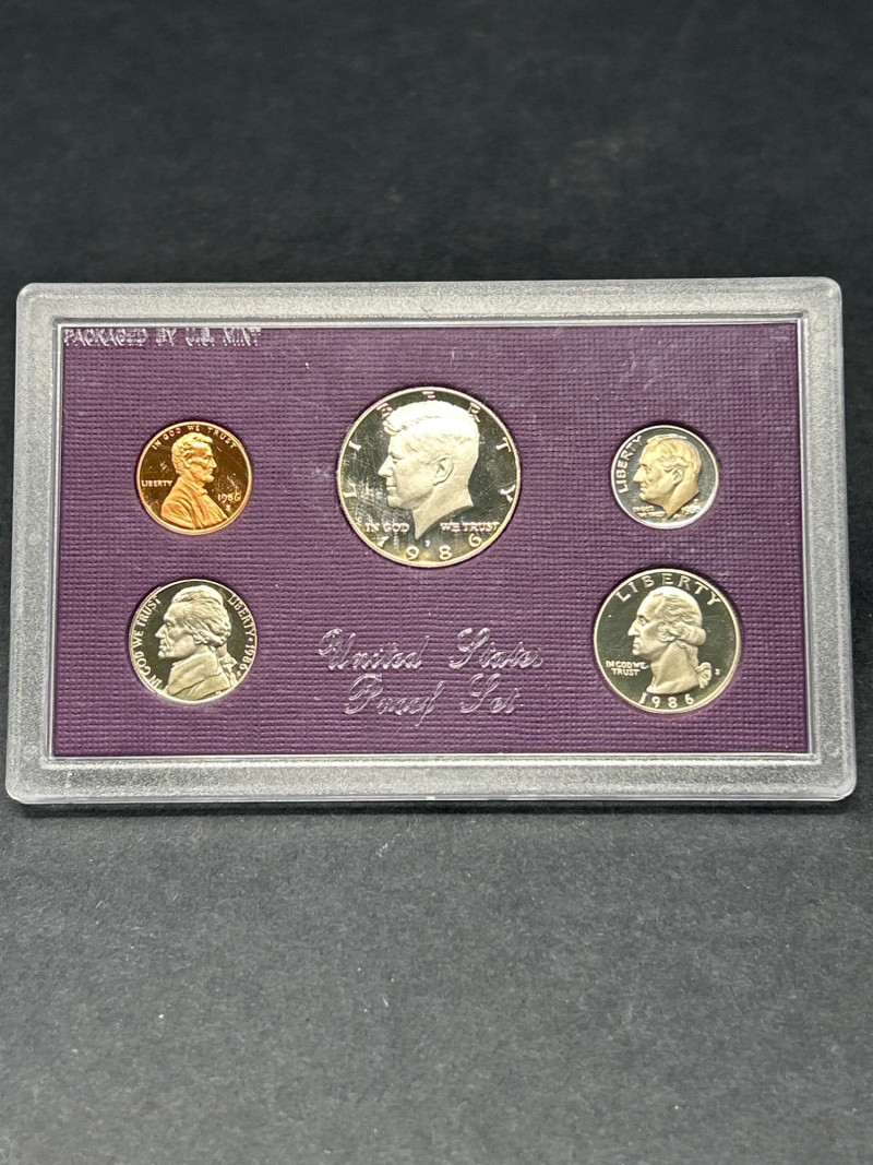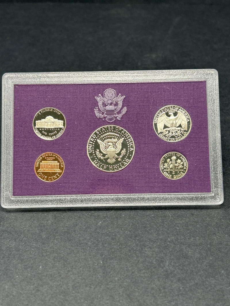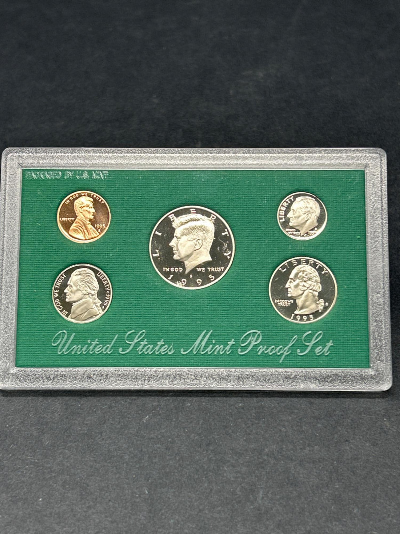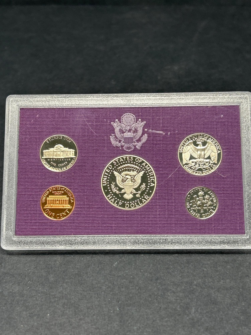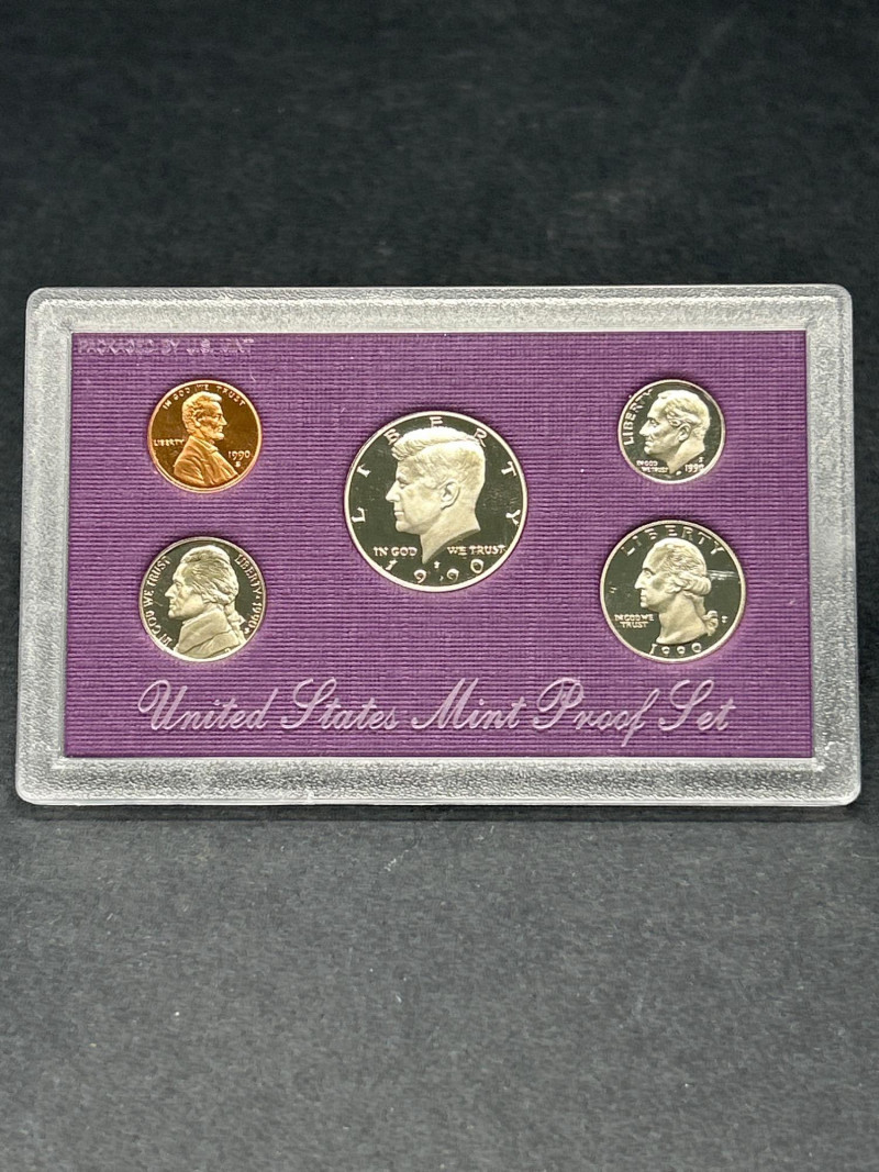 A premium offering of ten official United States Mint Proof Sets, each featuring meticulously struck coins with mirror-like fields and frosted devices. This curated lot includes both standard and silver issues, housed in original government packaging with Certificates of Authenticity and coin specification inserts. Included Sets: Silver Proof Sets: 1992, 1993 (black holders, labeled “Silver”) Standard Proof Sets: 1986, 1990 (x2), 1992, 1994, 1995, 1996, 1997 (purple and green holders) Coin Denominations per Set: Cent, Nickel, Dime, Quarter, Half Dollar, Dollar All coins struck in high-relief with reeded or plain edges per denomination Specifications & Composition: Cent: Copper-plated zinc, 2.5g, plain edge Nickel: Cupro-nickel, 5.0g, plain edge Dime: Cupro-nickel, 2.27g, reeded edge Quarter: Cupro-nickel, 5.67g, reeded edge Half Dollar: Cupro-nickel, 11.34g, reeded edge Dollar: Cupro-nickel, 8.1g, reeded edge