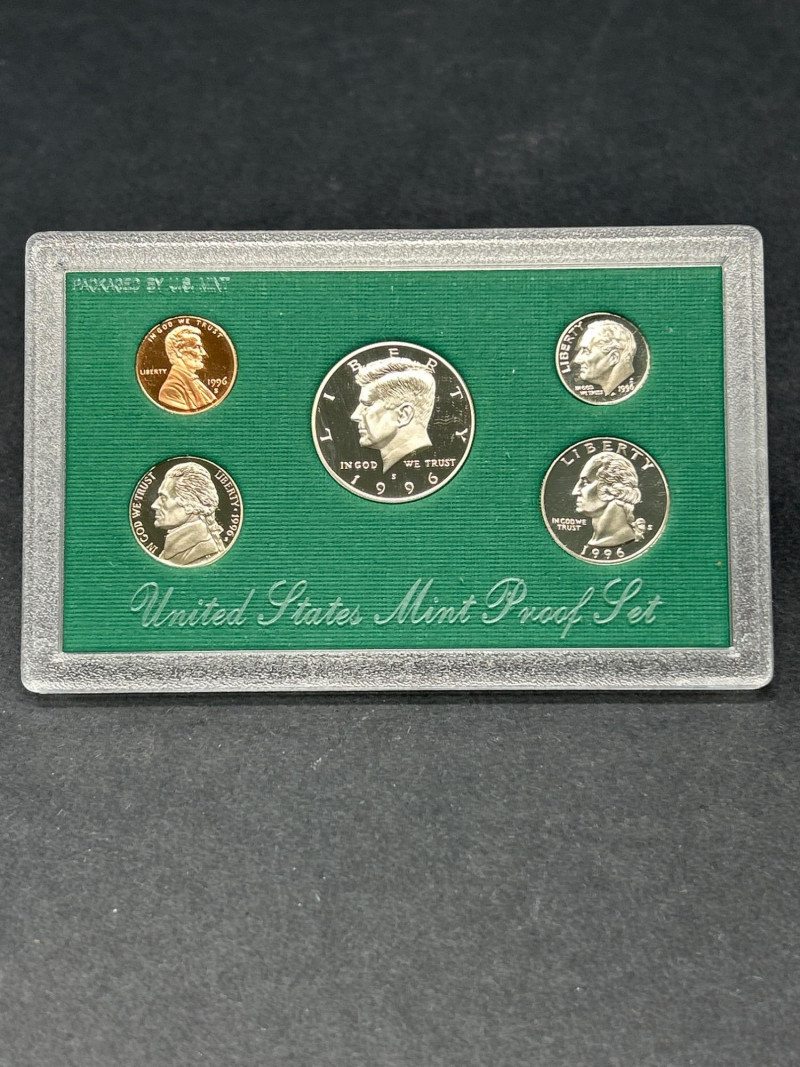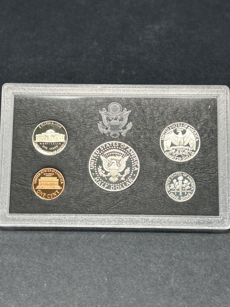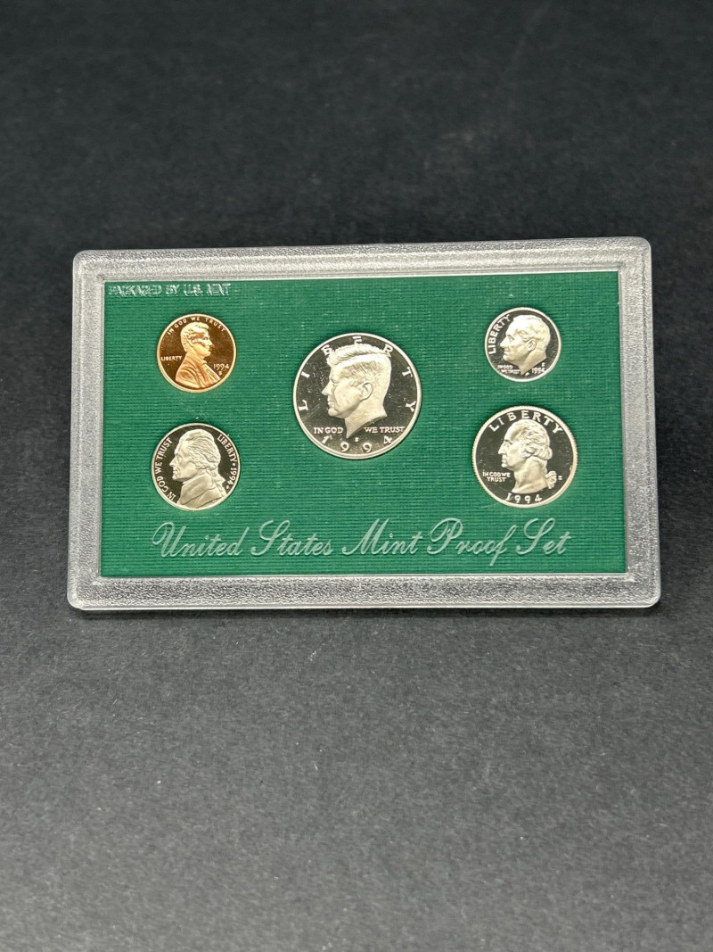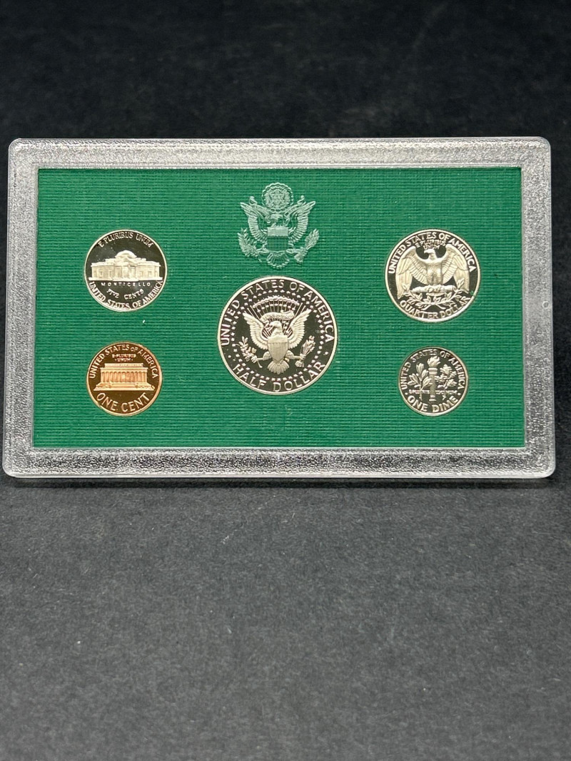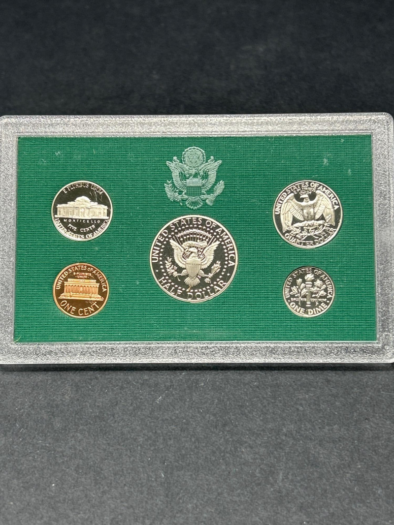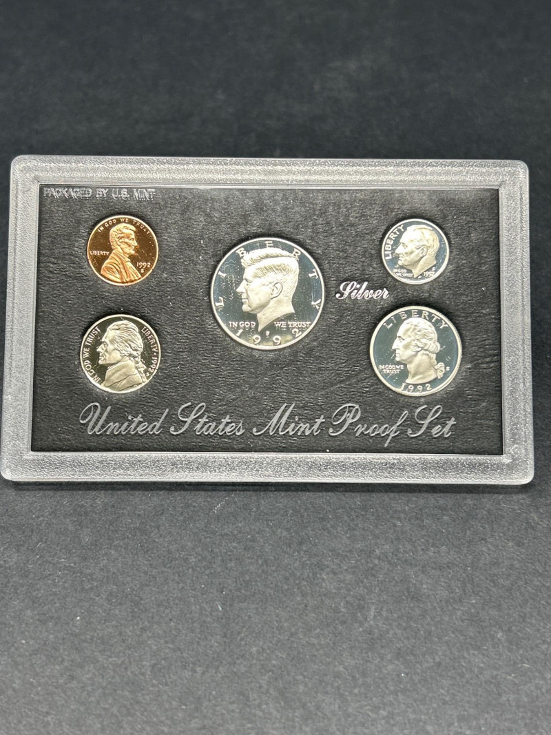 A premium offering of ten official United States Mint Proof Sets, each featuring meticulously struck coins with mirror-like fields and frosted devices. This curated lot includes both standard and silver issues, housed in original government packaging with Certificates of Authenticity and coin specification inserts. Included Sets: Silver Proof Sets: 1992, 1993 (black holders, labeled “Silver”) Standard Proof Sets: 1986, 1990 (x2), 1992, 1994, 1995, 1996, 1997 (purple and green holders) Coin Denominations per Set: Cent, Nickel, Dime, Quarter, Half Dollar, Dollar All coins struck in high-relief with reeded or plain edges per denomination Specifications & Composition: Cent: Copper-plated zinc, 2.5g, plain edge Nickel: Cupro-nickel, 5.0g, plain edge Dime: Cupro-nickel, 2.27g, reeded edge Quarter: Cupro-nickel, 5.67g, reeded edge Half Dollar: Cupro-nickel, 11.34g, reeded edge Dollar: Cupro-nickel, 8.1g, reeded edge