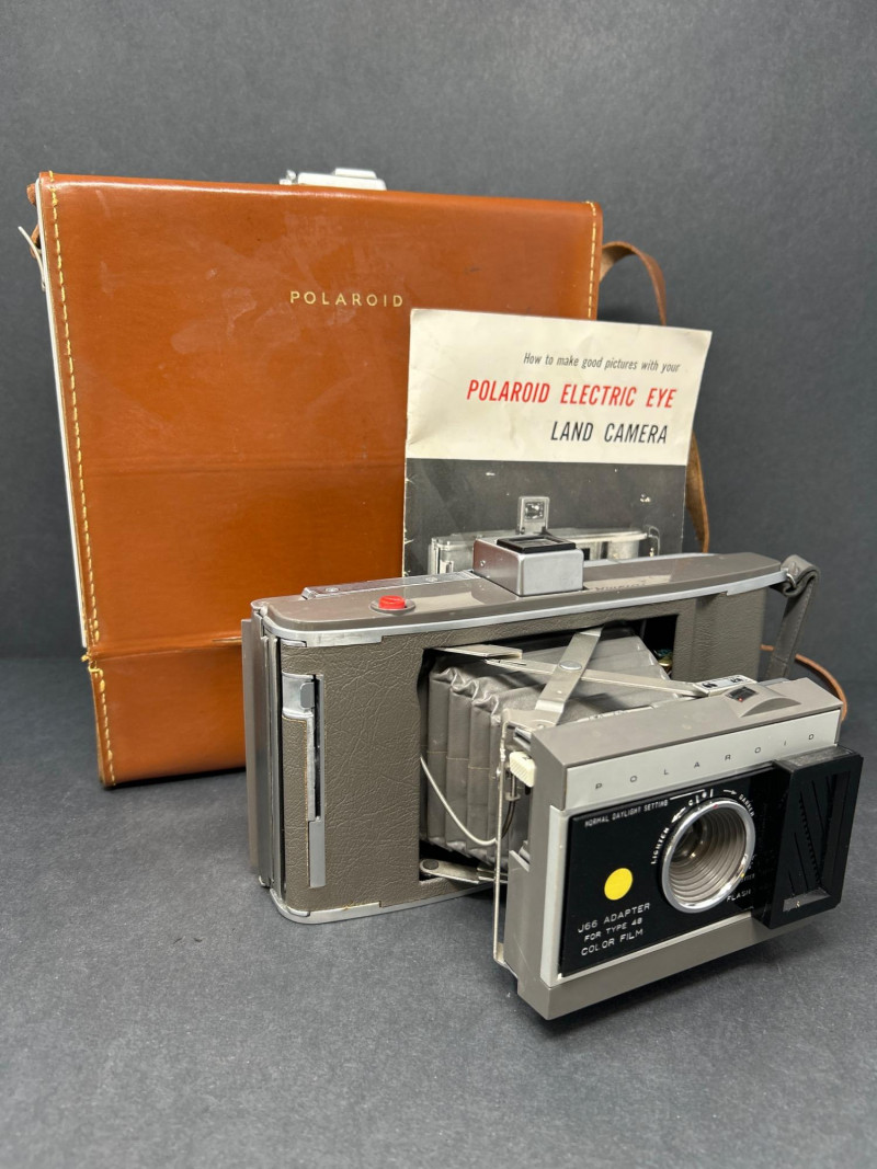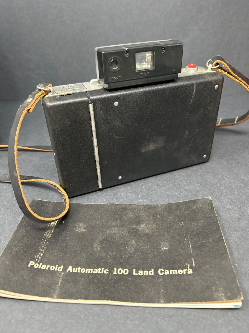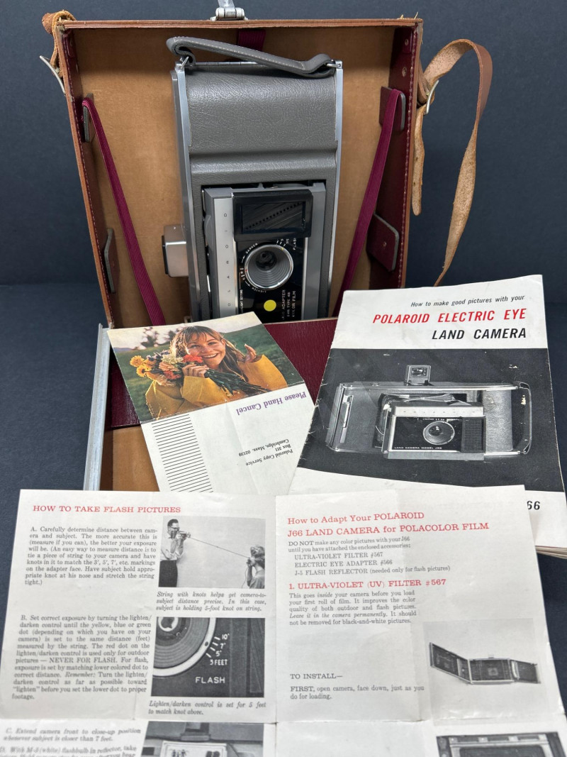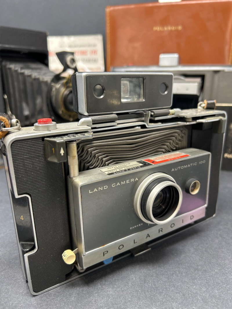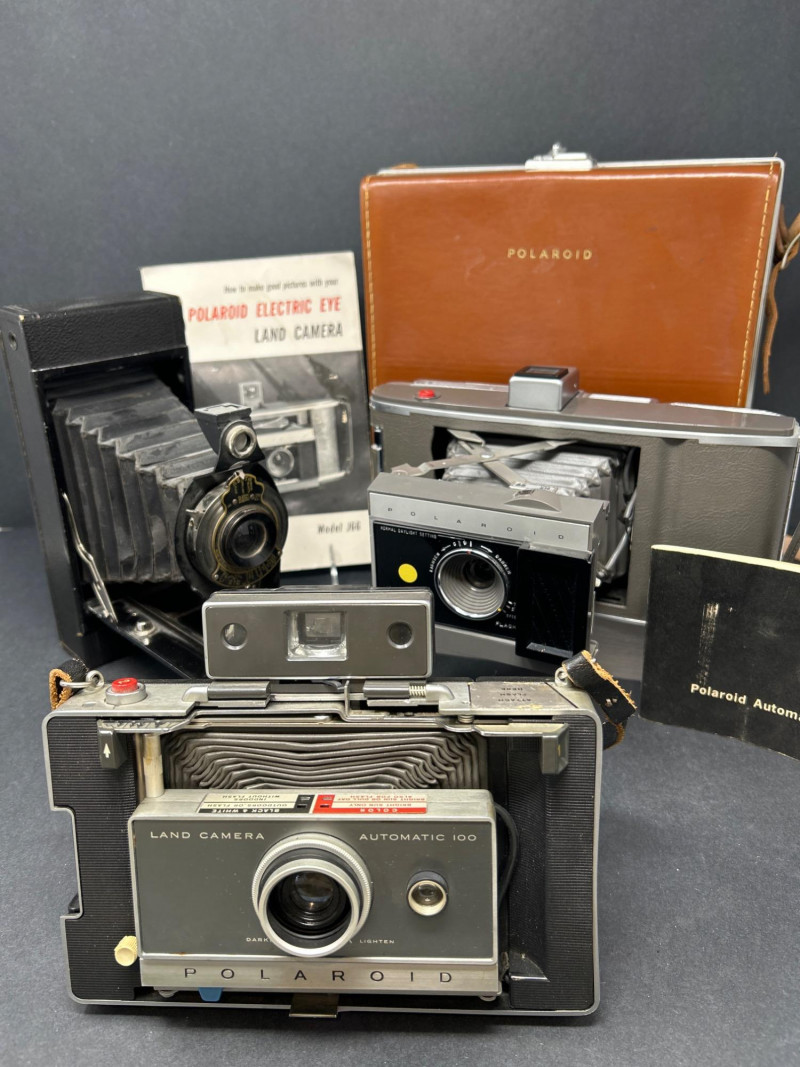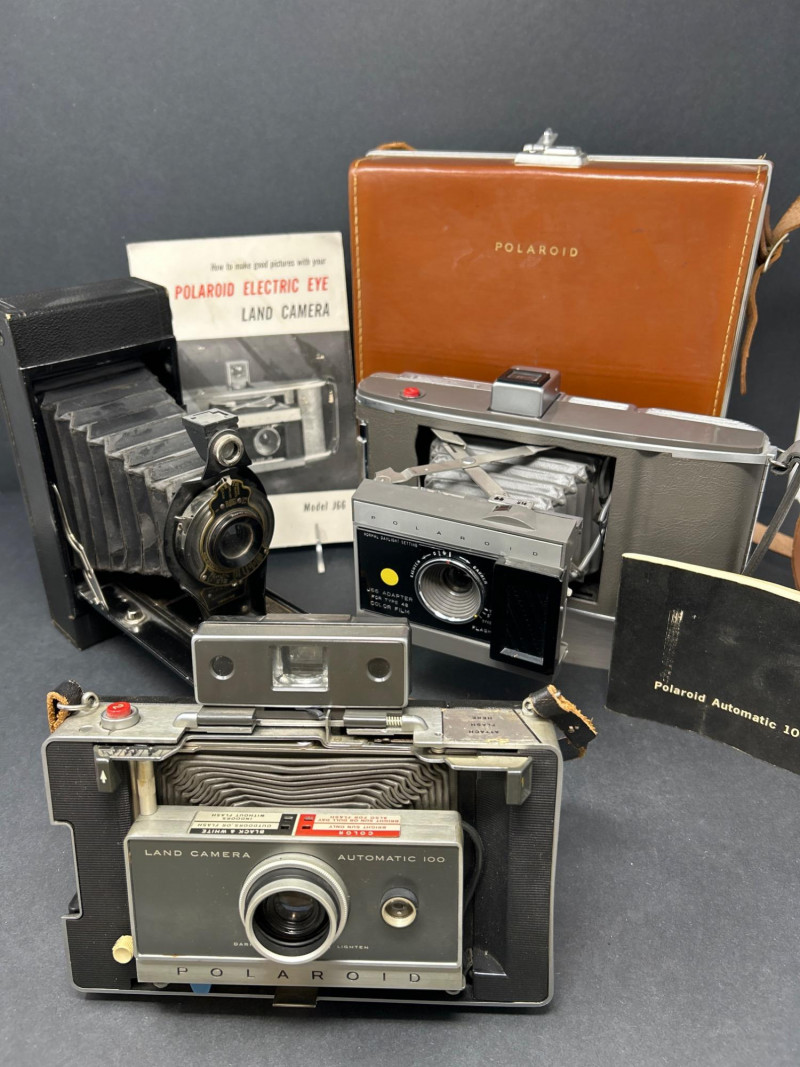 Lot Includes: Polaroid Land Camera Automatic 100 (c. early 1960s) – Folding instant camera with rangefinder focus and “Electric Eye” automatic exposure. Includes original instruction booklet and black Polaroid carrying case. Polaroid J66 Land Camera (1960s) – Manual lighten/darken control, J66 adapter for Type 48 color film, and printed guides for Polacolor film adaptation. Comes in brown leather Polaroid case with strap. Kodak No.2C Folding Autographic Brownie (c. 1916–1927) – Large-format folding camera for 130-size autographic roll film. Features black leather bellows, Bausch & Lomb shutter (time/bulb/instant settings), and rear “Autographic” window for film inscription. Mechanically untested. Mid-century instant photography meets early Kodak engineering. No.2C Brownie is an oversized variant prized for display. Both Polaroids retain original manuals and cases — a completeness bonus. Kodak (folded): 11 in. L × 4½ in. W × 2½ in. H Polaroid Cases: ~11 × 9 × 4 in.Condition Report: