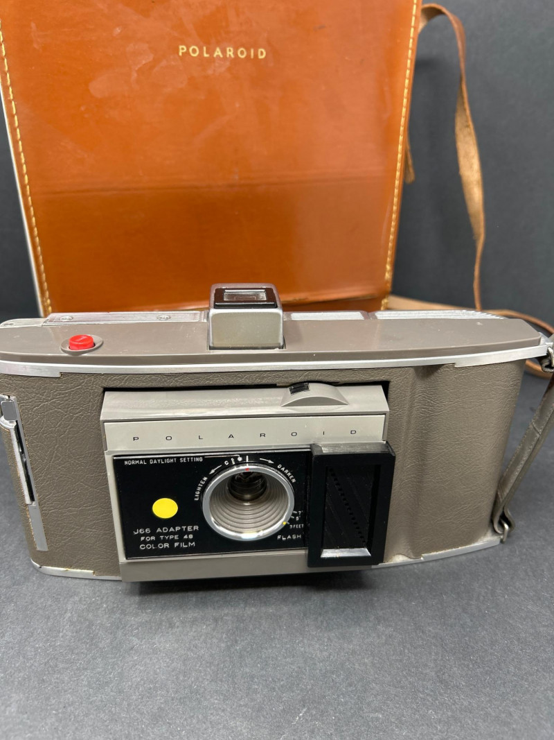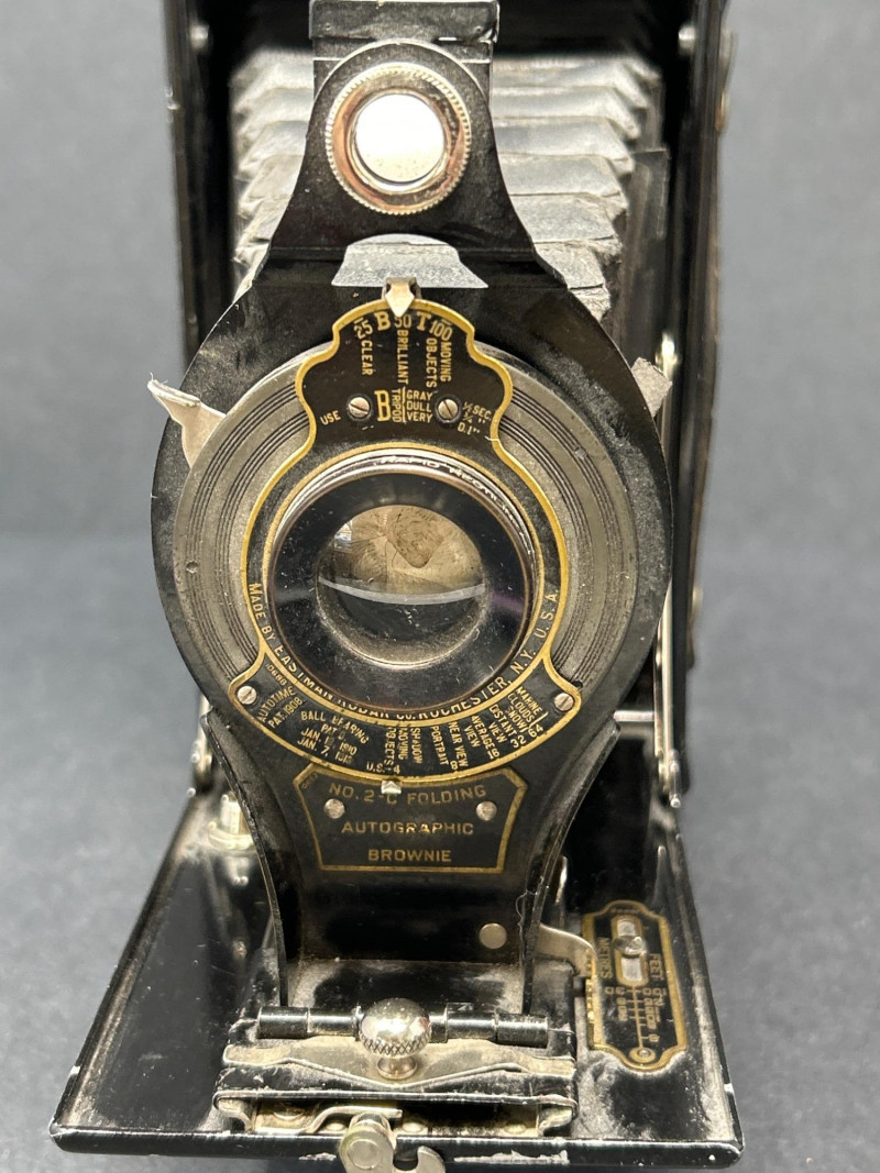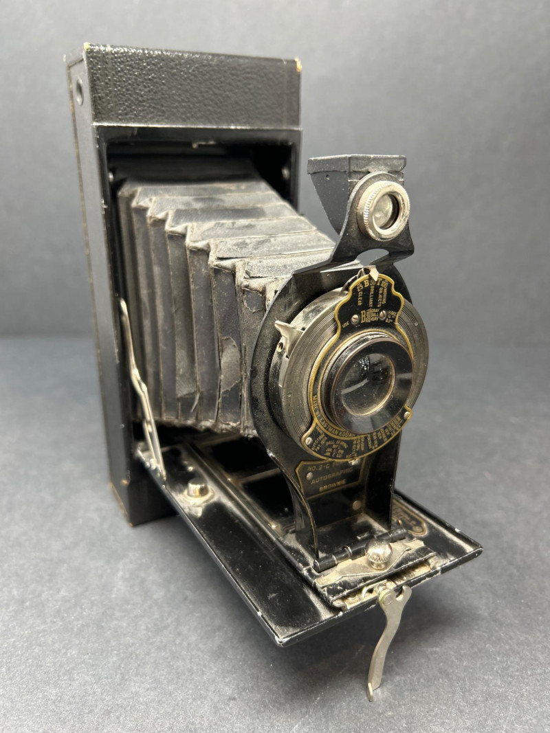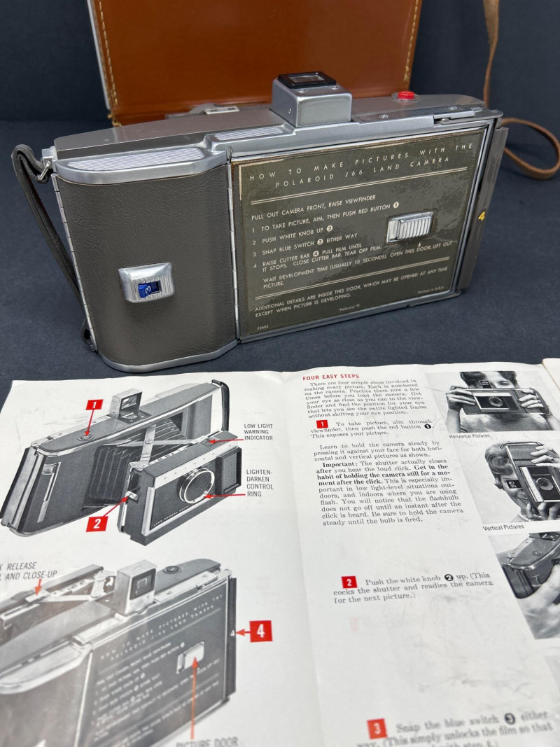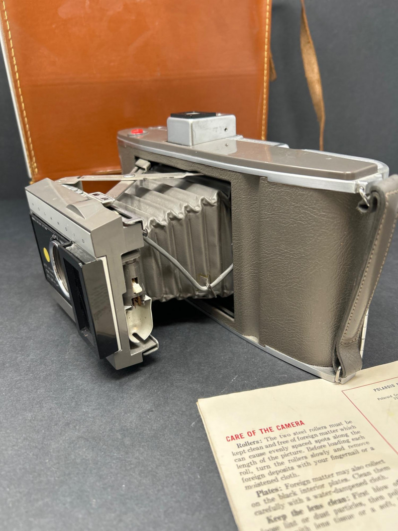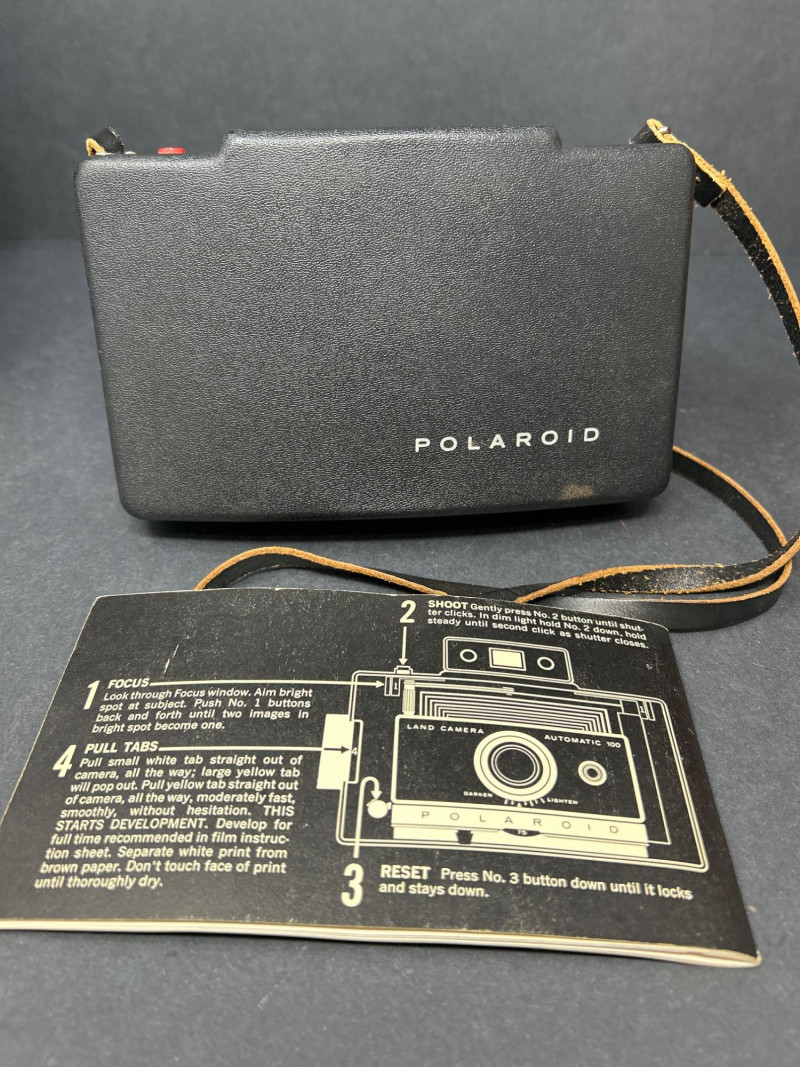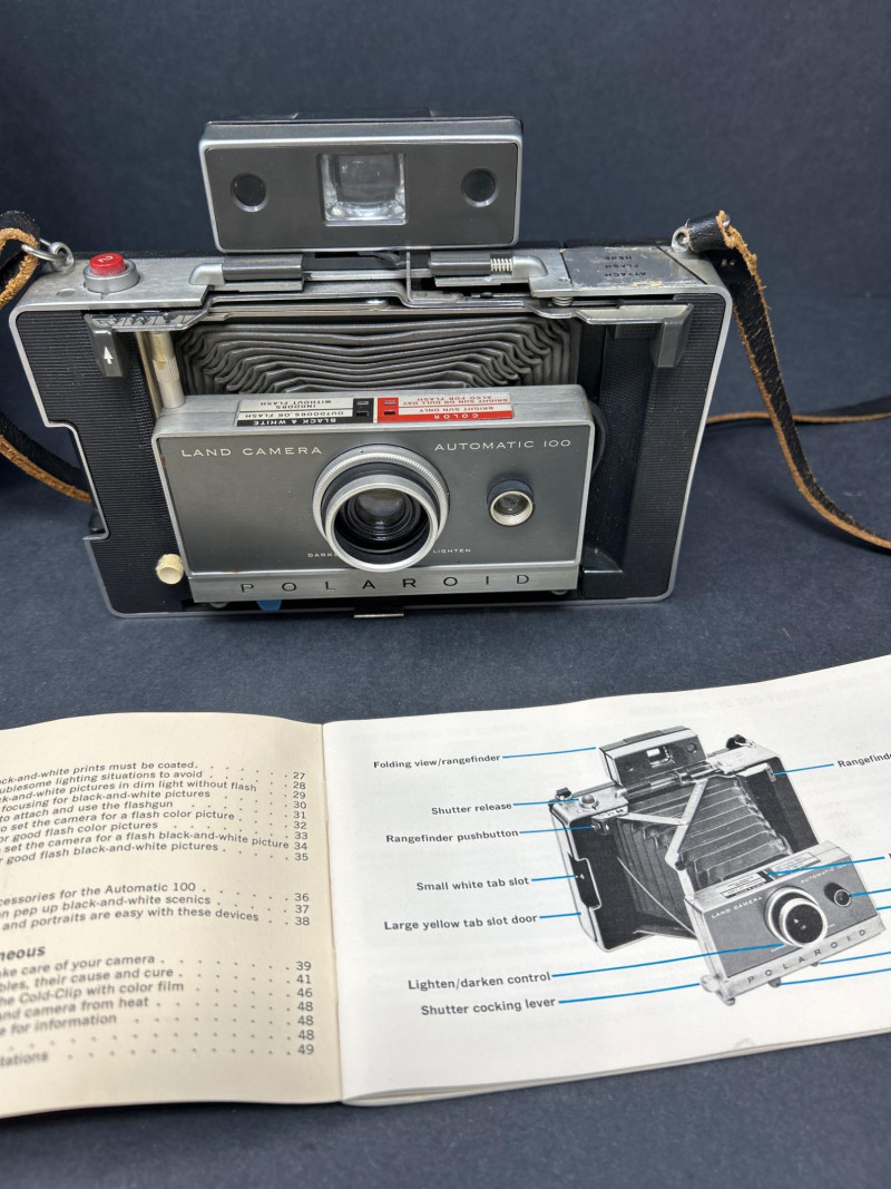 Lot Includes: Polaroid Land Camera Automatic 100 (c. early 1960s) – Folding instant camera with rangefinder focus and “Electric Eye” automatic exposure. Includes original instruction booklet and black Polaroid carrying case. Polaroid J66 Land Camera (1960s) – Manual lighten/darken control, J66 adapter for Type 48 color film, and printed guides for Polacolor film adaptation. Comes in brown leather Polaroid case with strap. Kodak No.2C Folding Autographic Brownie (c. 1916–1927) – Large-format folding camera for 130-size autographic roll film. Features black leather bellows, Bausch & Lomb shutter (time/bulb/instant settings), and rear “Autographic” window for film inscription. Mechanically untested. Mid-century instant photography meets early Kodak engineering. No.2C Brownie is an oversized variant prized for display. Both Polaroids retain original manuals and cases — a completeness bonus. Kodak (folded): 11 in. L × 4½ in. W × 2½ in. H Polaroid Cases: ~11 × 9 × 4 in.Condition Report: