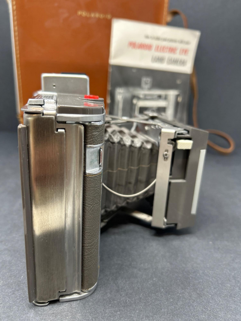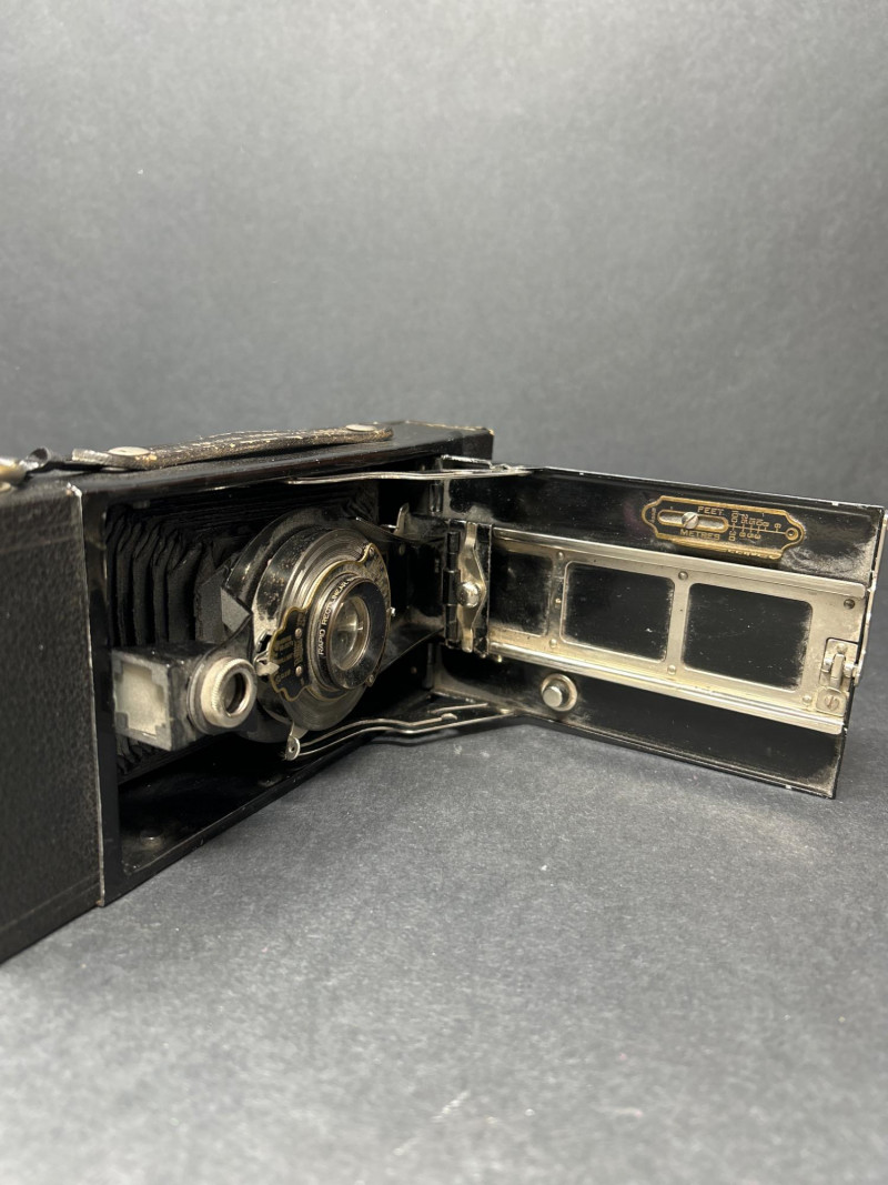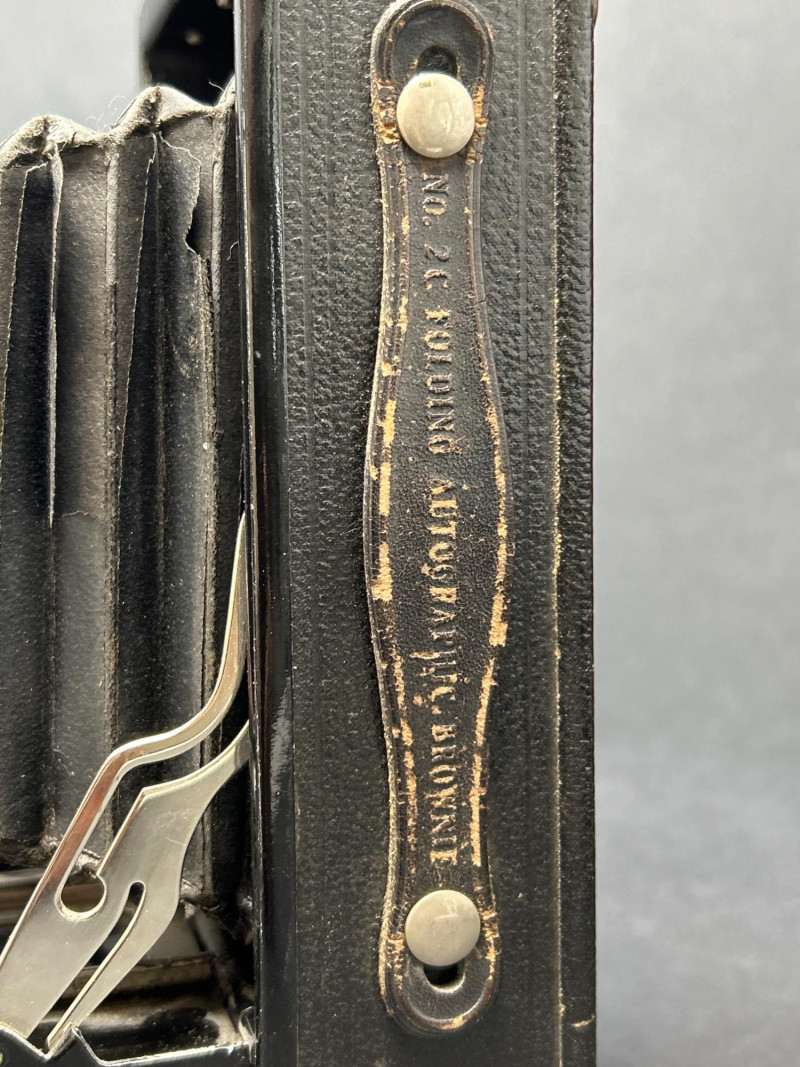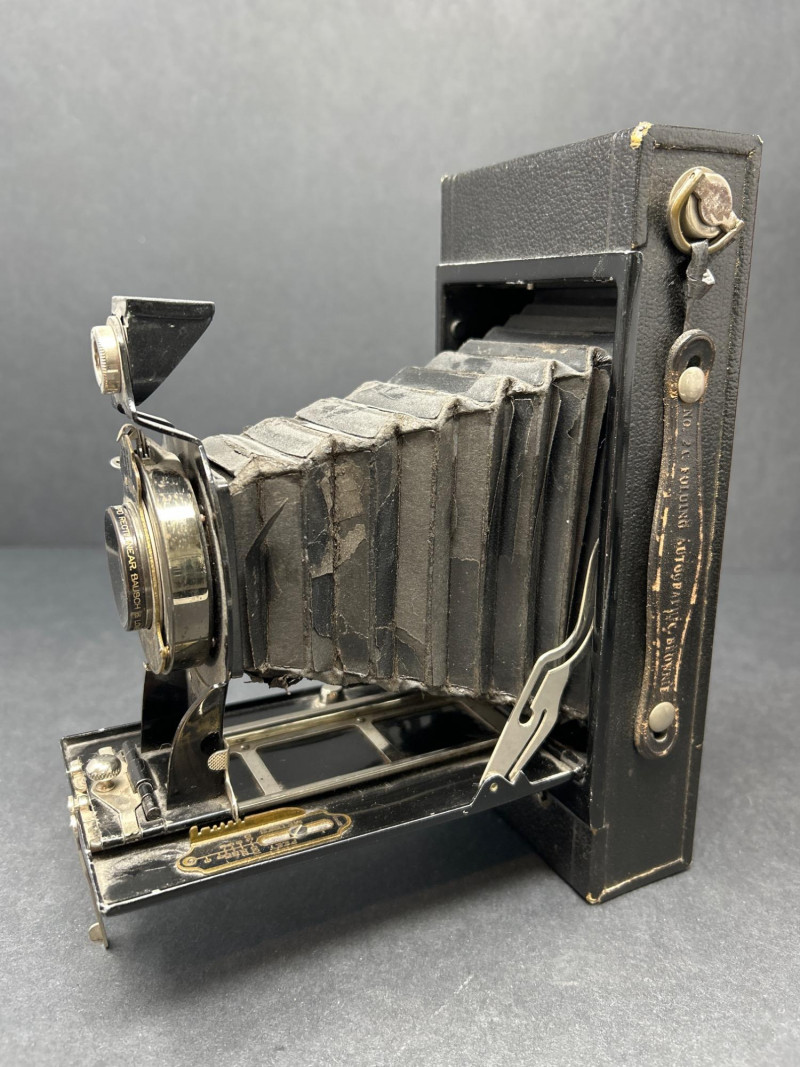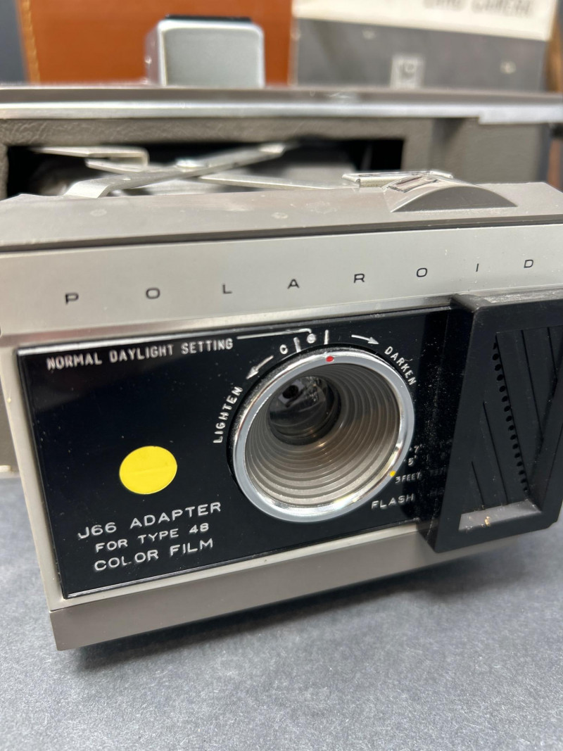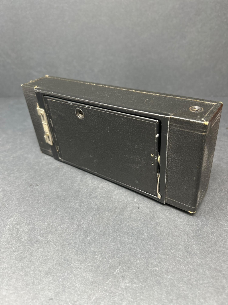 Lot Includes: Polaroid Land Camera Automatic 100 (c. early 1960s) – Folding instant camera with rangefinder focus and “Electric Eye” automatic exposure. Includes original instruction booklet and black Polaroid carrying case. Polaroid J66 Land Camera (1960s) – Manual lighten/darken control, J66 adapter for Type 48 color film, and printed guides for Polacolor film adaptation. Comes in brown leather Polaroid case with strap. Kodak No.2C Folding Autographic Brownie (c. 1916–1927) – Large-format folding camera for 130-size autographic roll film. Features black leather bellows, Bausch & Lomb shutter (time/bulb/instant settings), and rear “Autographic” window for film inscription. Mechanically untested. Mid-century instant photography meets early Kodak engineering. No.2C Brownie is an oversized variant prized for display. Both Polaroids retain original manuals and cases — a completeness bonus. Kodak (folded): 11 in. L × 4½ in. W × 2½ in. H Polaroid Cases: ~11 × 9 × 4 in.Condition Report: