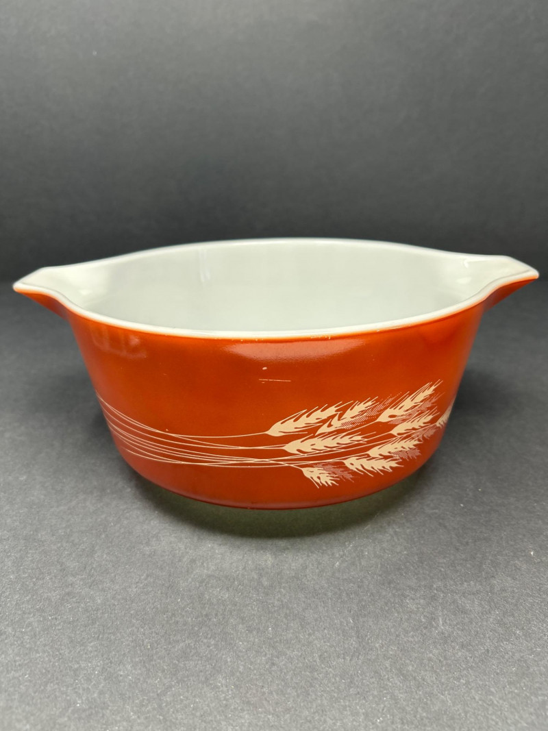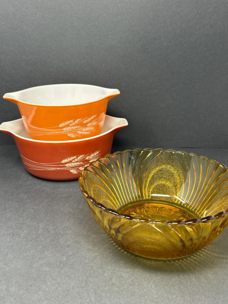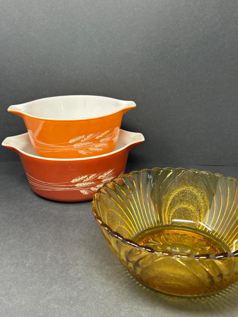 Lot # 51 - Two Pyrex Autumn Harvest Wheat Casseroles & Brockway Amber Bowl